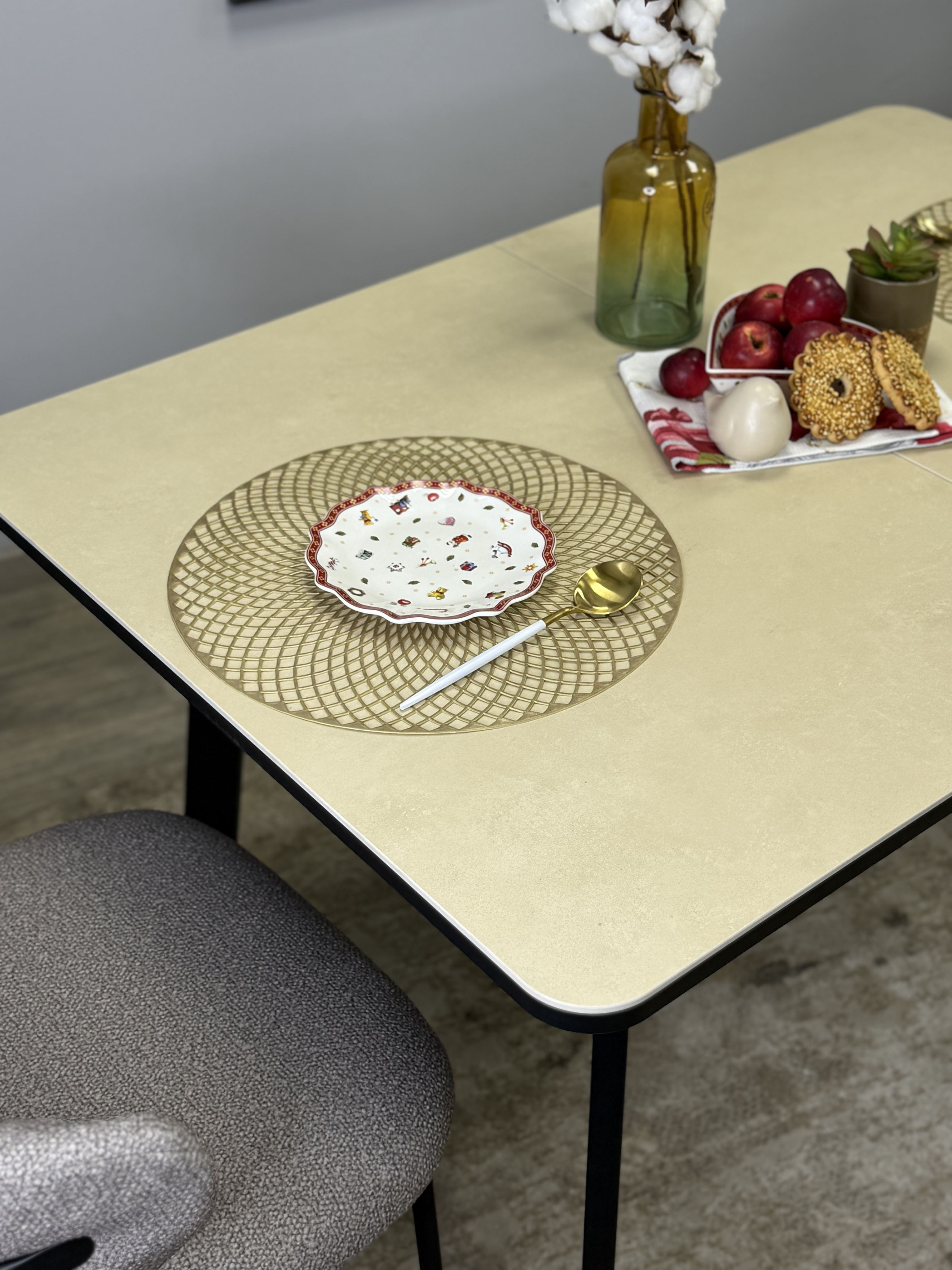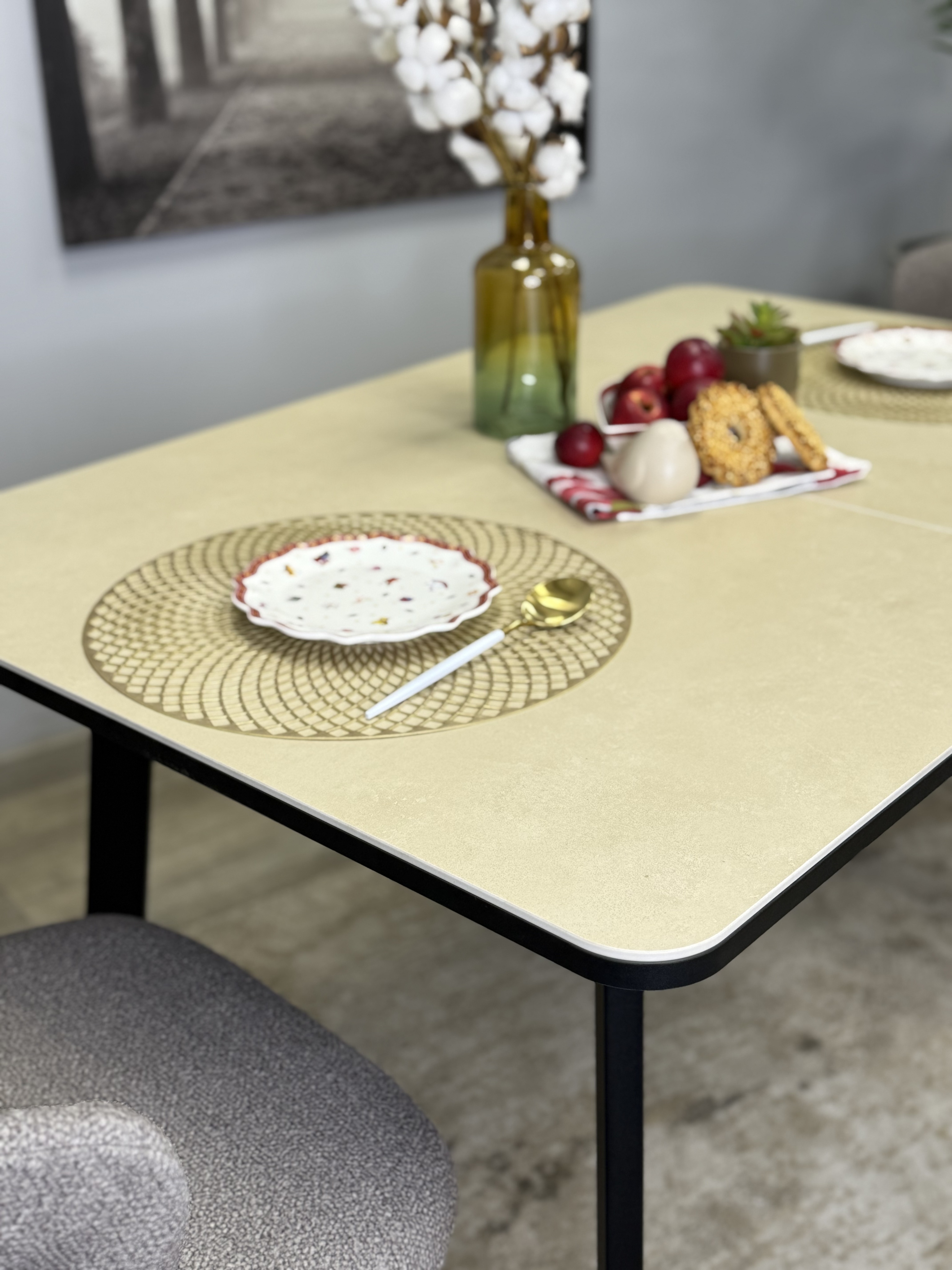 Столешница выполнена из натуральной керамики толщиной 5,6 мм. Керамическая поверхность обладает высокой стойкостью к температурам вплоть до 1000°C, что позволяет размещать на ней даже очень горячие предметы. Благодаря своей твердости, превосходящей металл, она устойчива к механическим повреждениям и царапинам от кухонных принадлежностей. Кроме того, керамика абсолютно инертна к воздействию воды и любых средств бытовой химии.