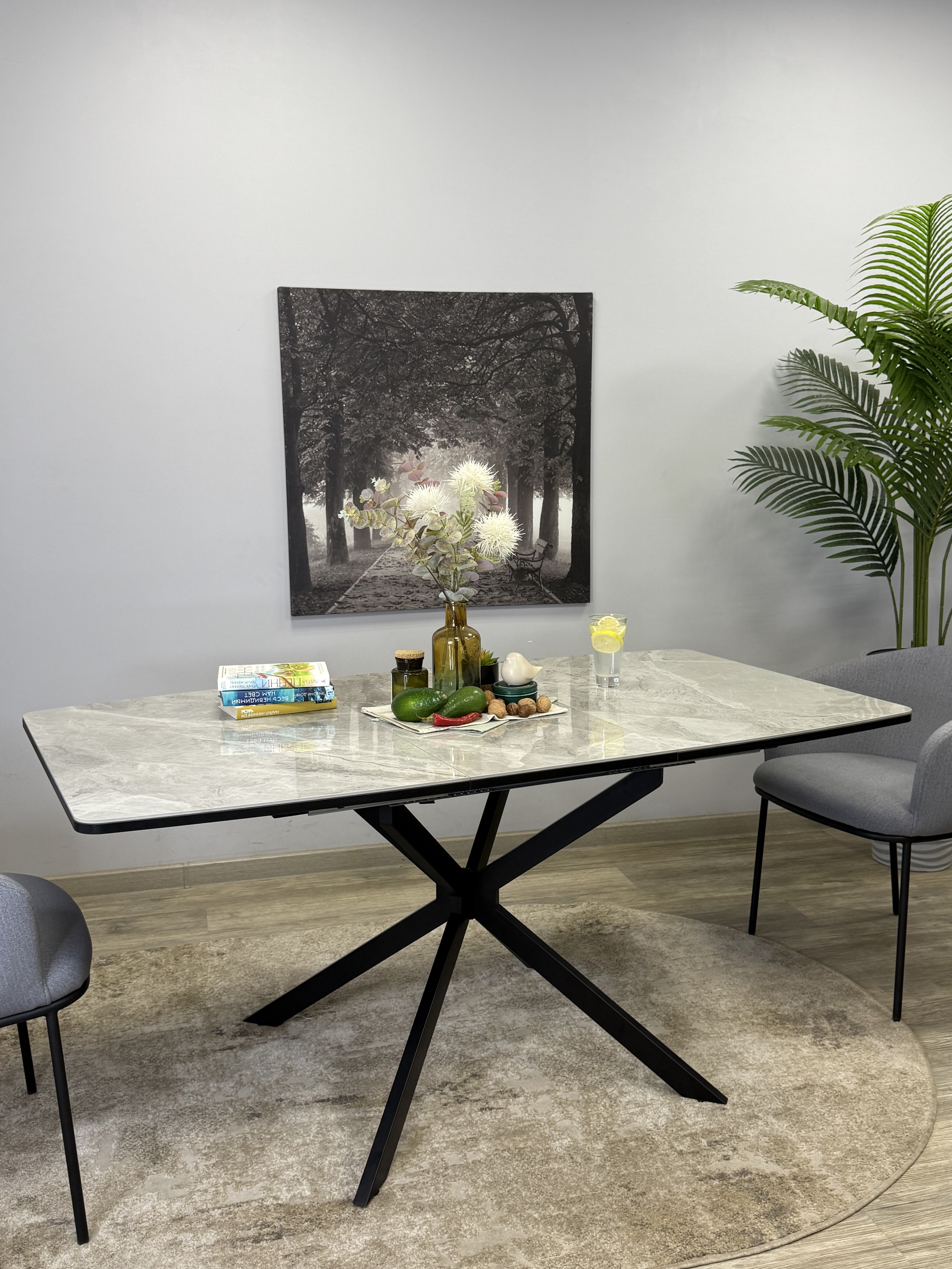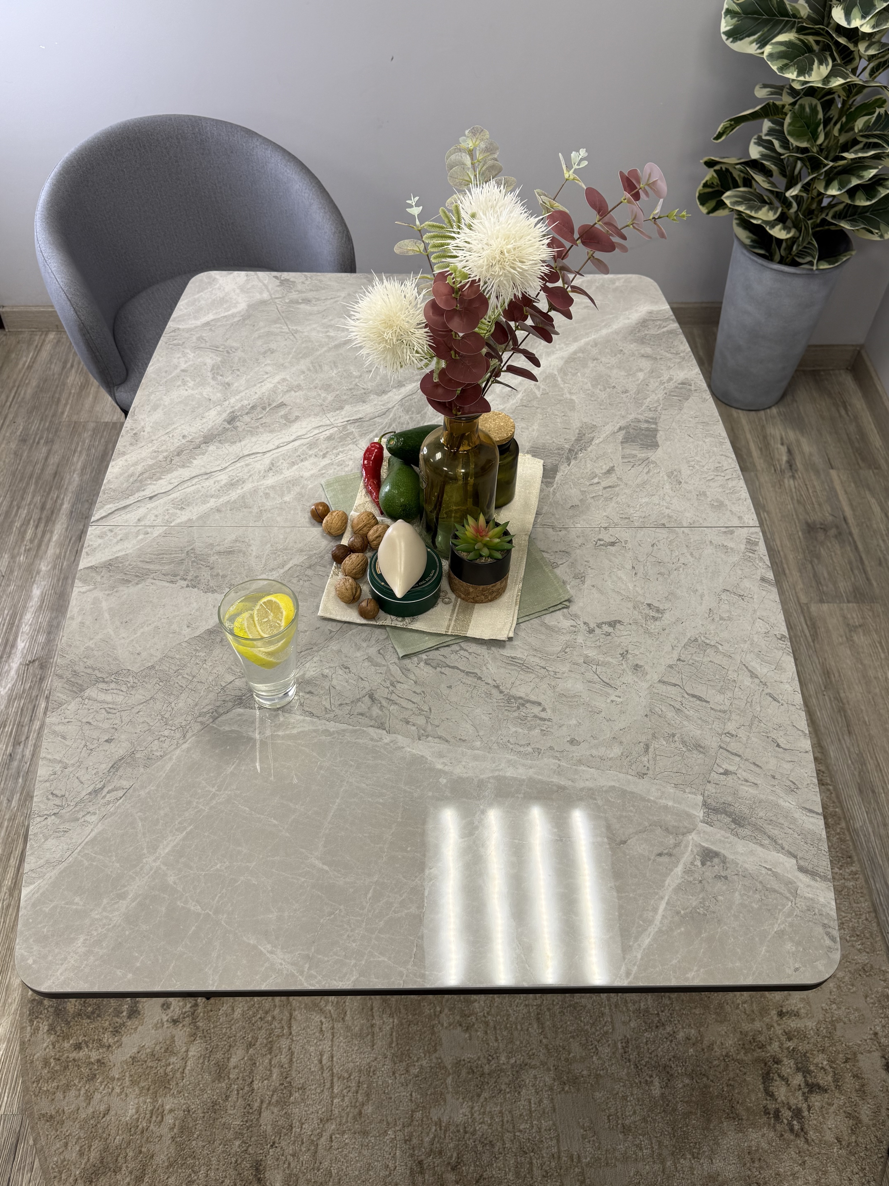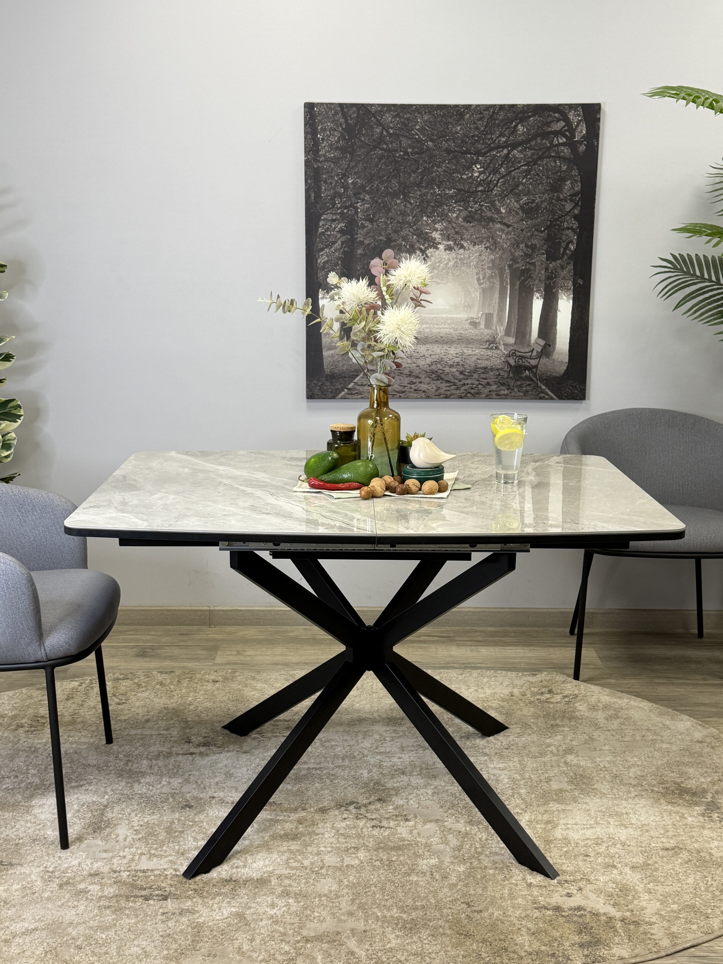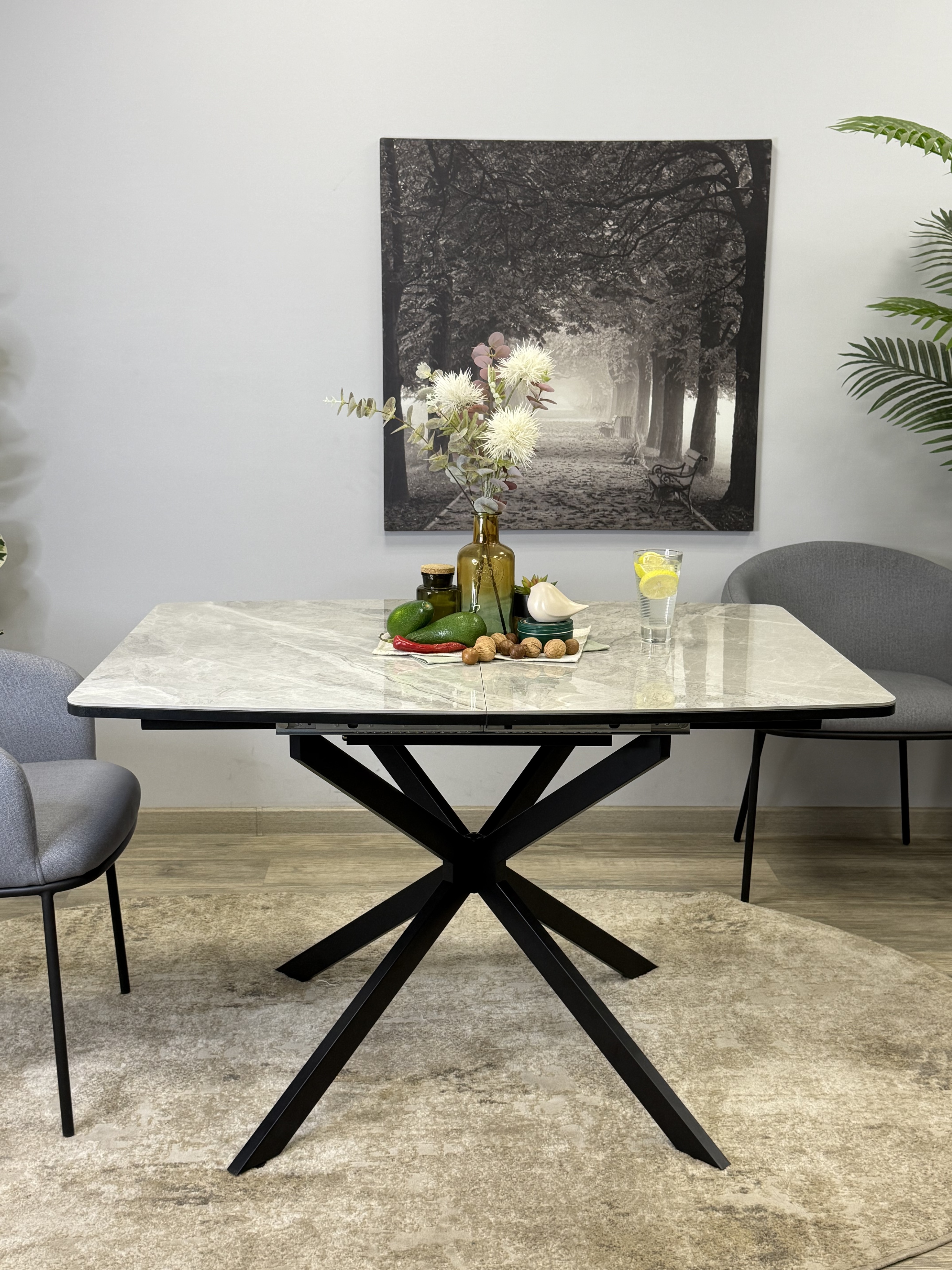 Современный стол на центральных металлических опорах, большого сечения, керамической столешницей с декором "мрамор белый". Стол в сложенном состоянии спокойно размещает 8 человек и 12 человек в разложенном. Большим преимуществом стола является торцевой механизм раскладки. . Механизм не перекашивается при открывании одной рукой, на каждое крыло может спокойно опереться человек.