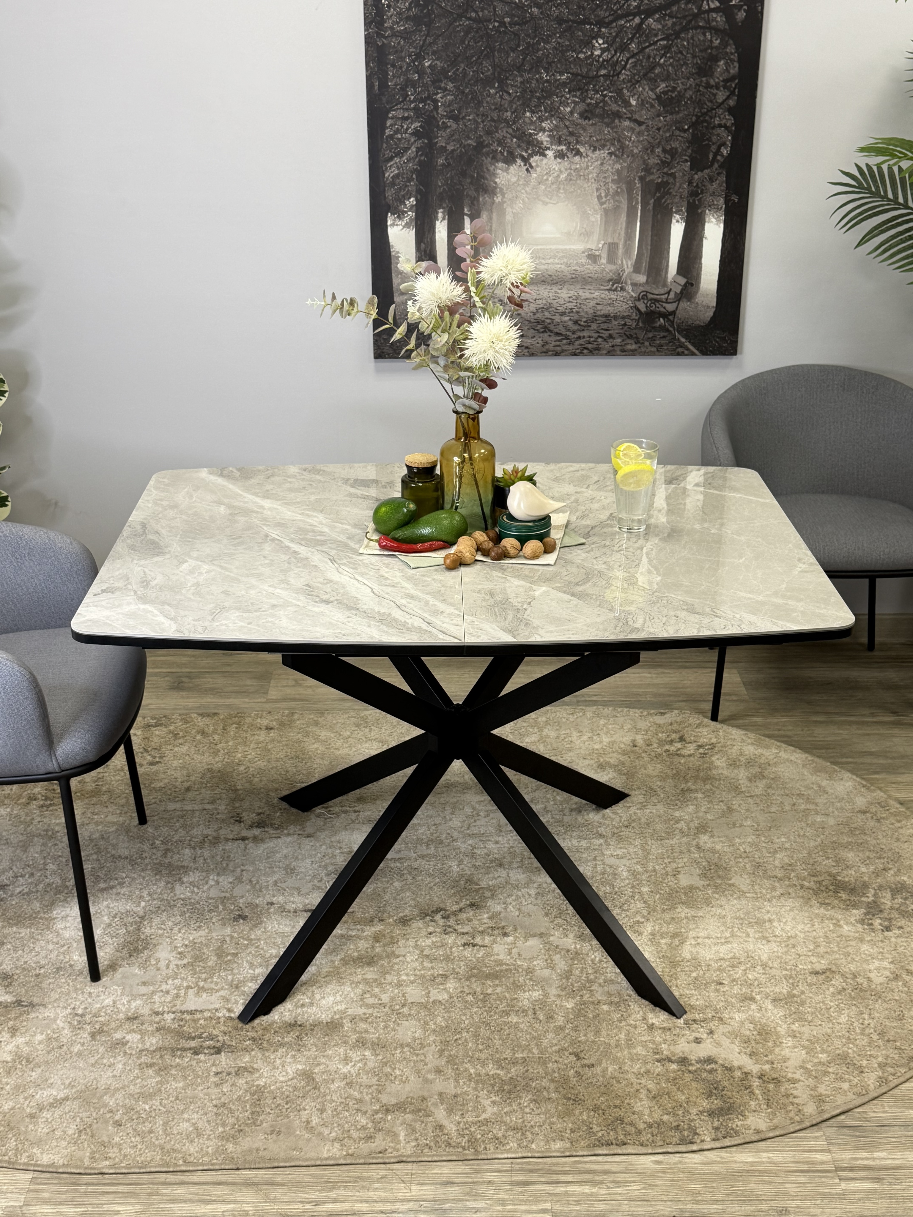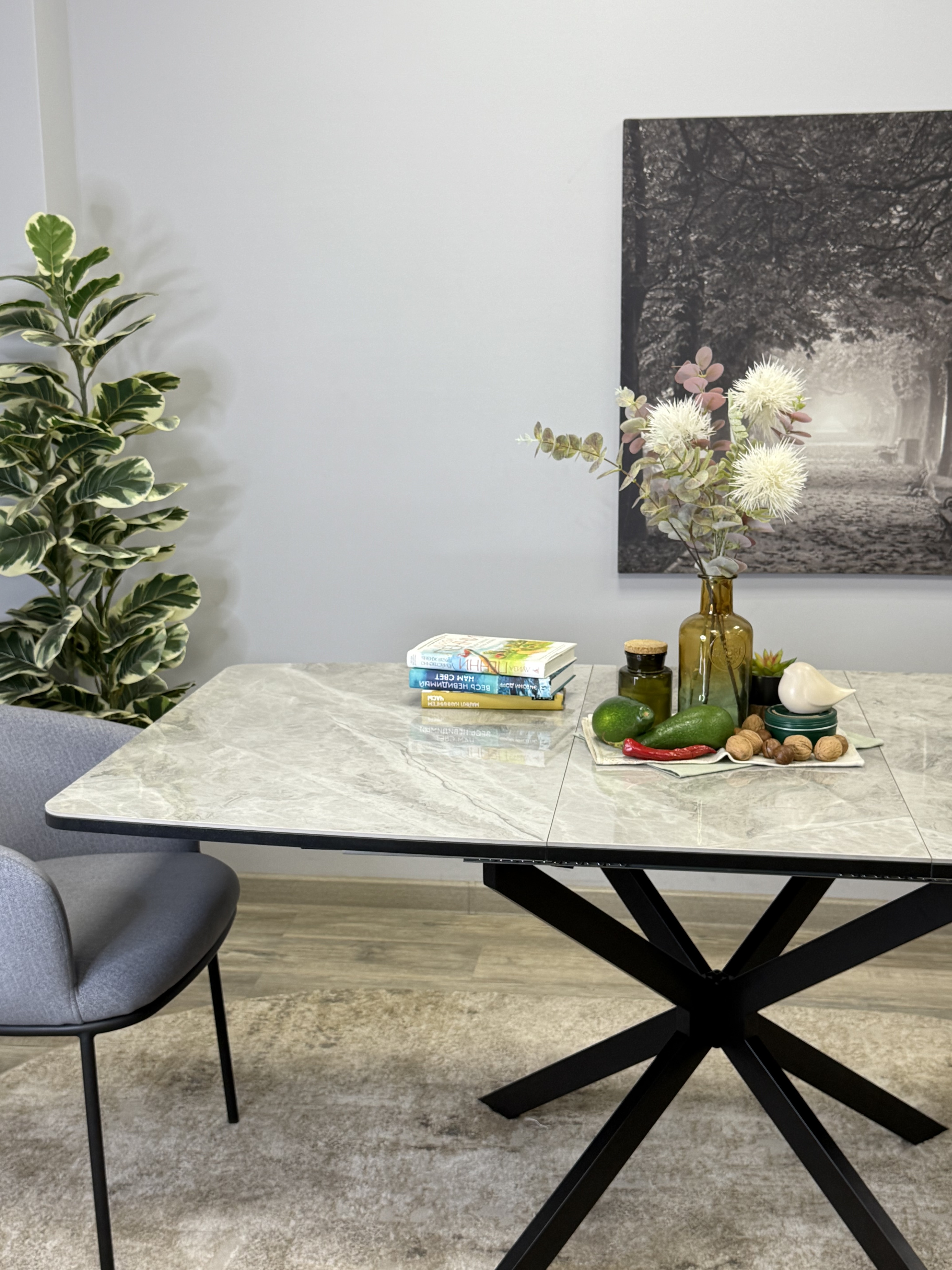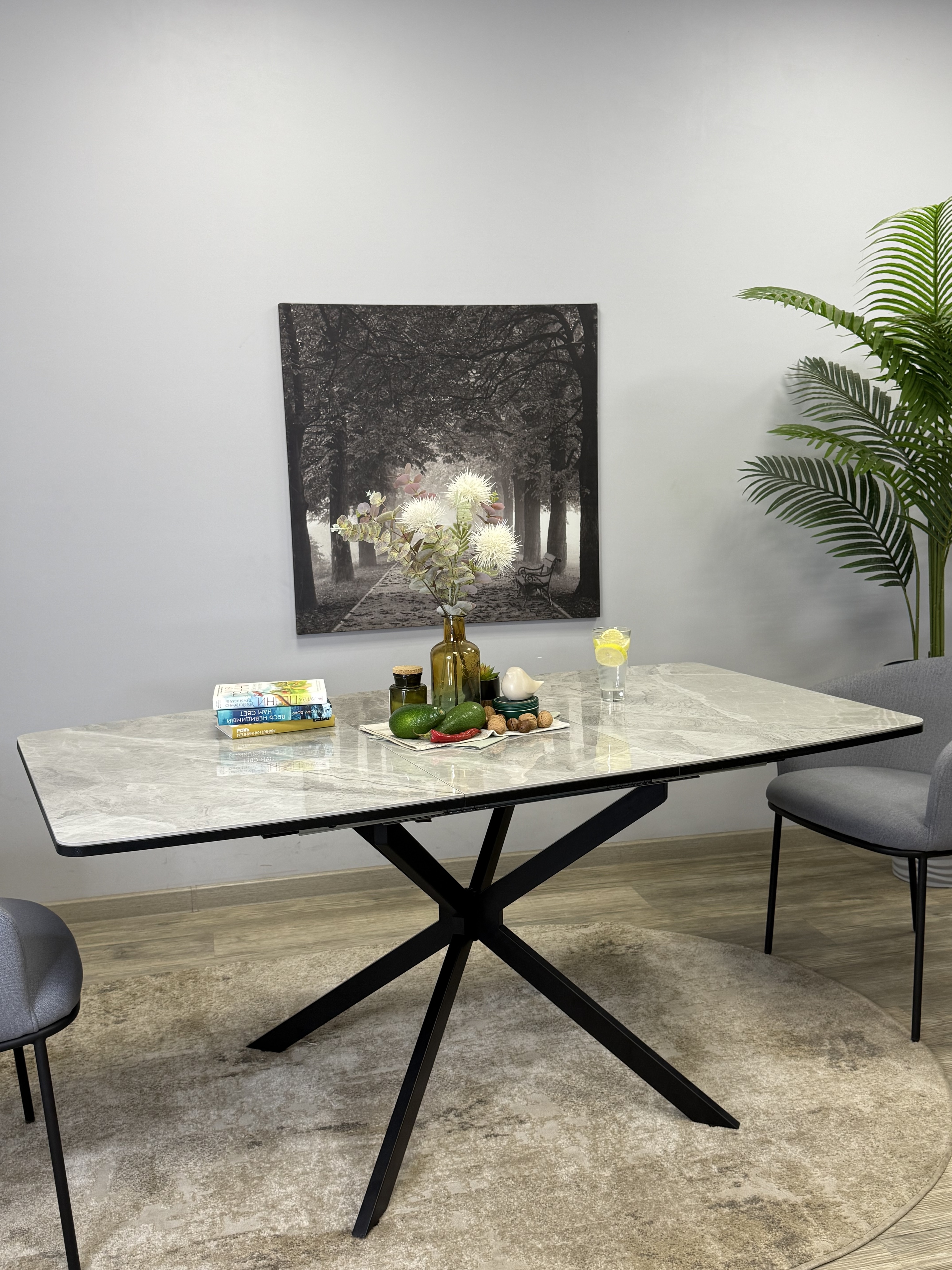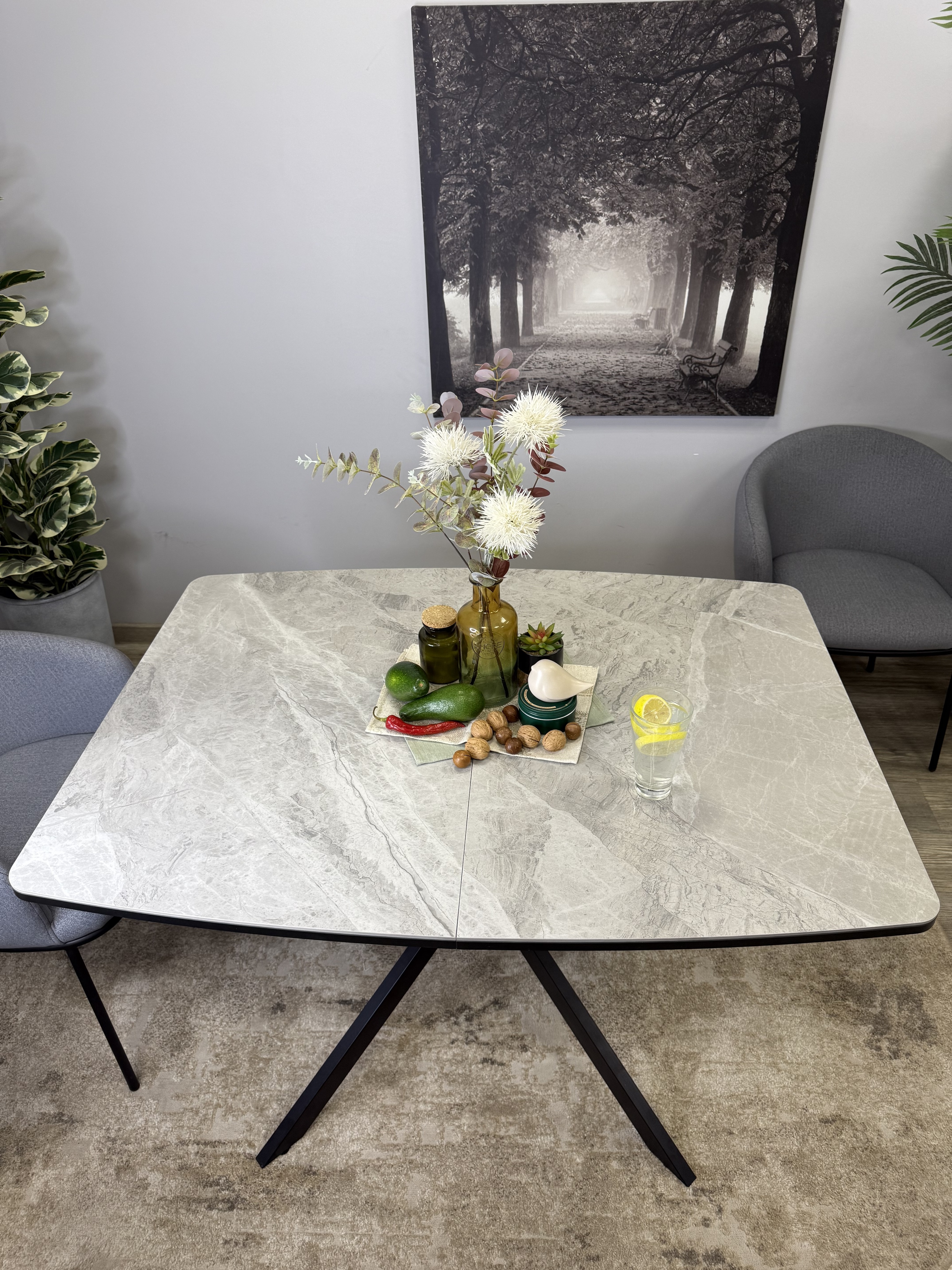 Современный стол на центральных металлических опорах, большого сечения, керамической столешницей с декором "мрамор белый". Стол в сложенном состоянии спокойно размещает 8 человек и 12 человек в разложенном. Большим преимуществом стола является торцевой механизм раскладки. . Механизм не перекашивается при открывании одной рукой, на каждое крыло может спокойно опереться человек.