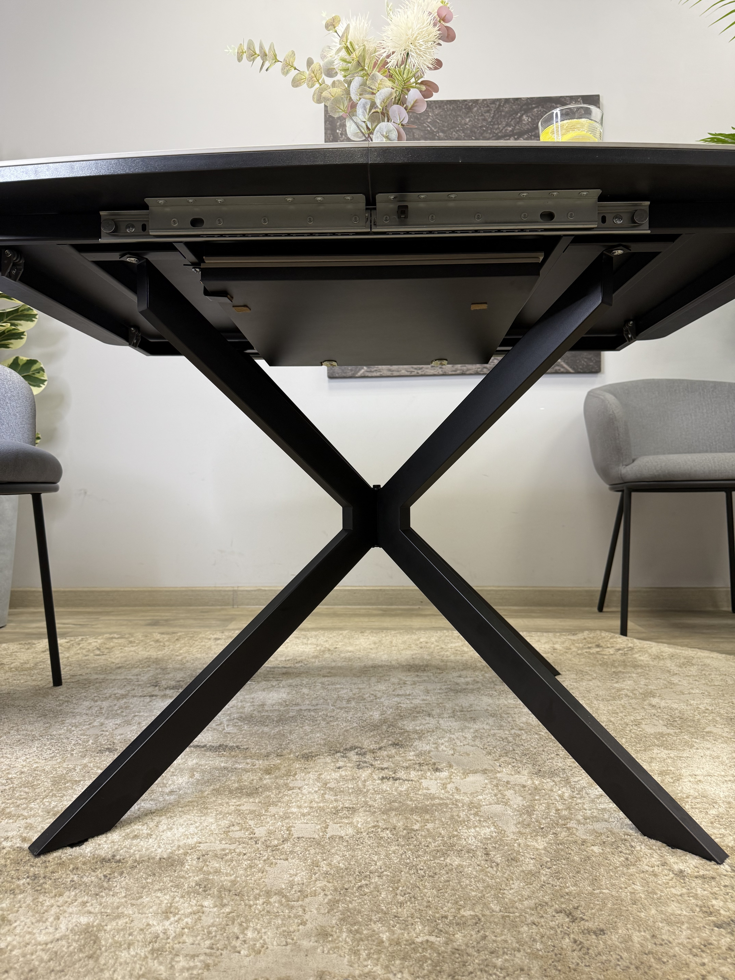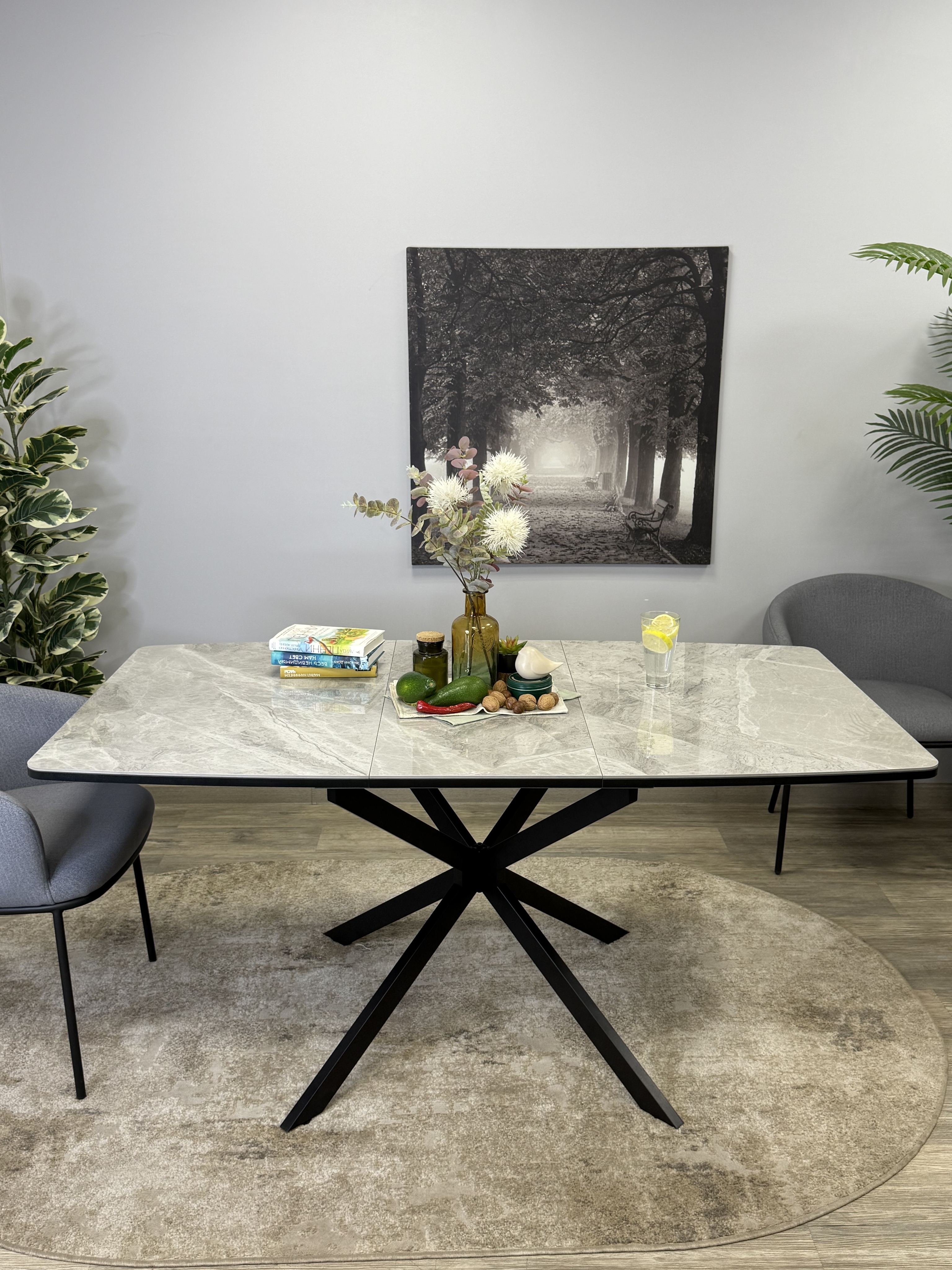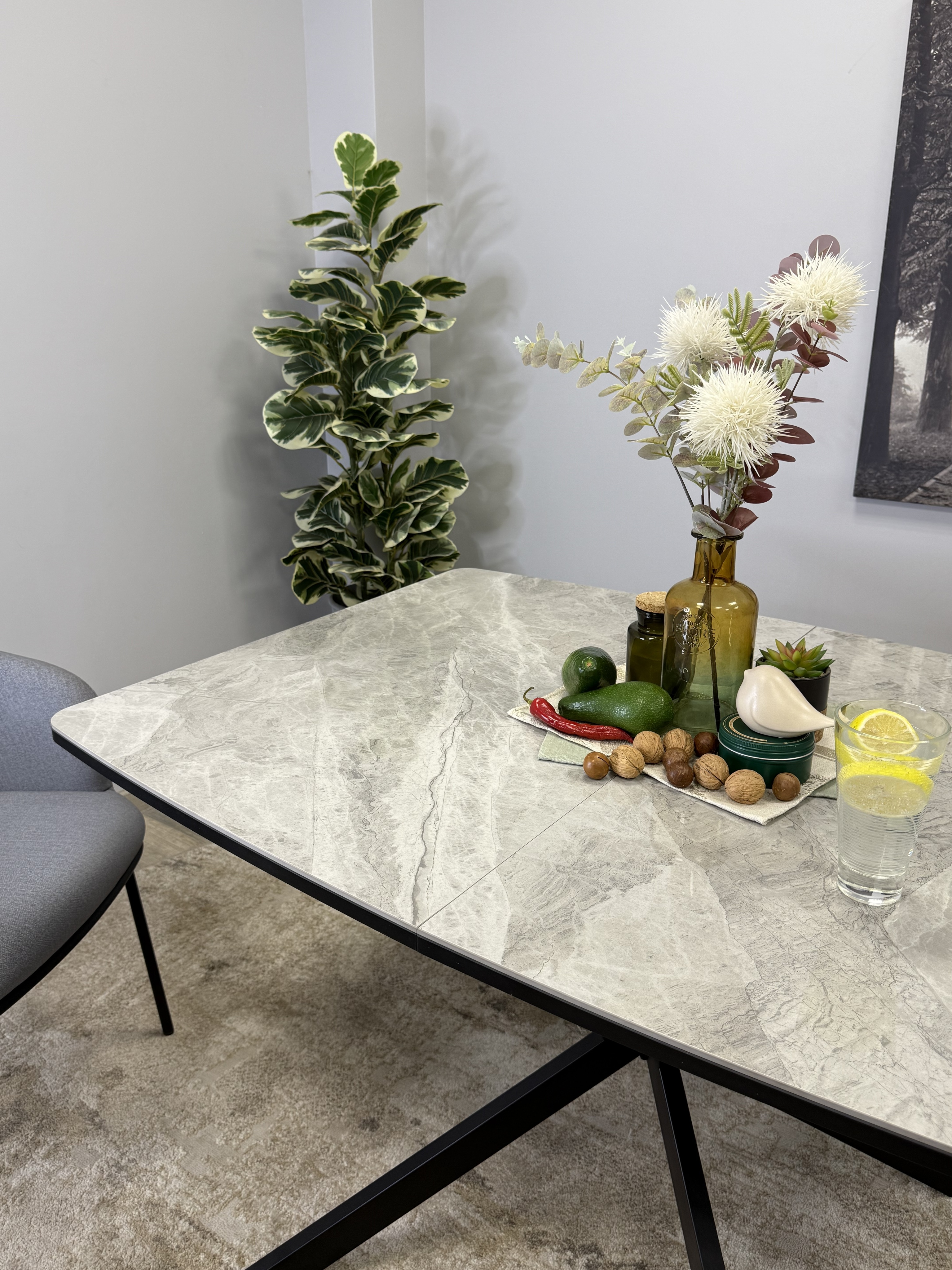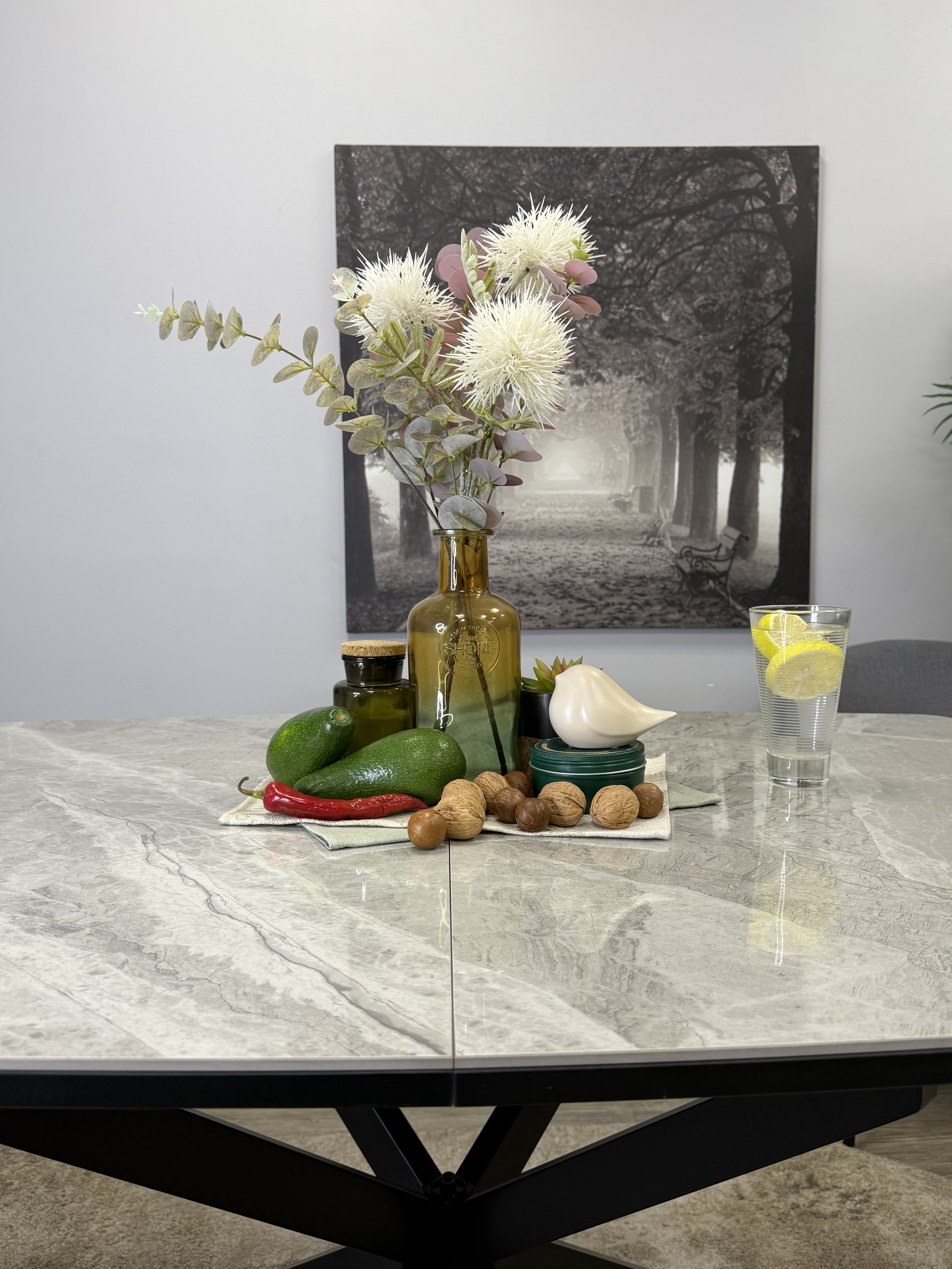 Современный стол на центральных металлических опорах, большого сечения, керамической столешницей с декором "мрамор белый". Стол в сложенном состоянии спокойно размещает 8 человек и 12 человек в разложенном. Большим преимуществом стола является торцевой механизм раскладки. . Механизм не перекашивается при открывании одной рукой, на каждое крыло может спокойно опереться человек.