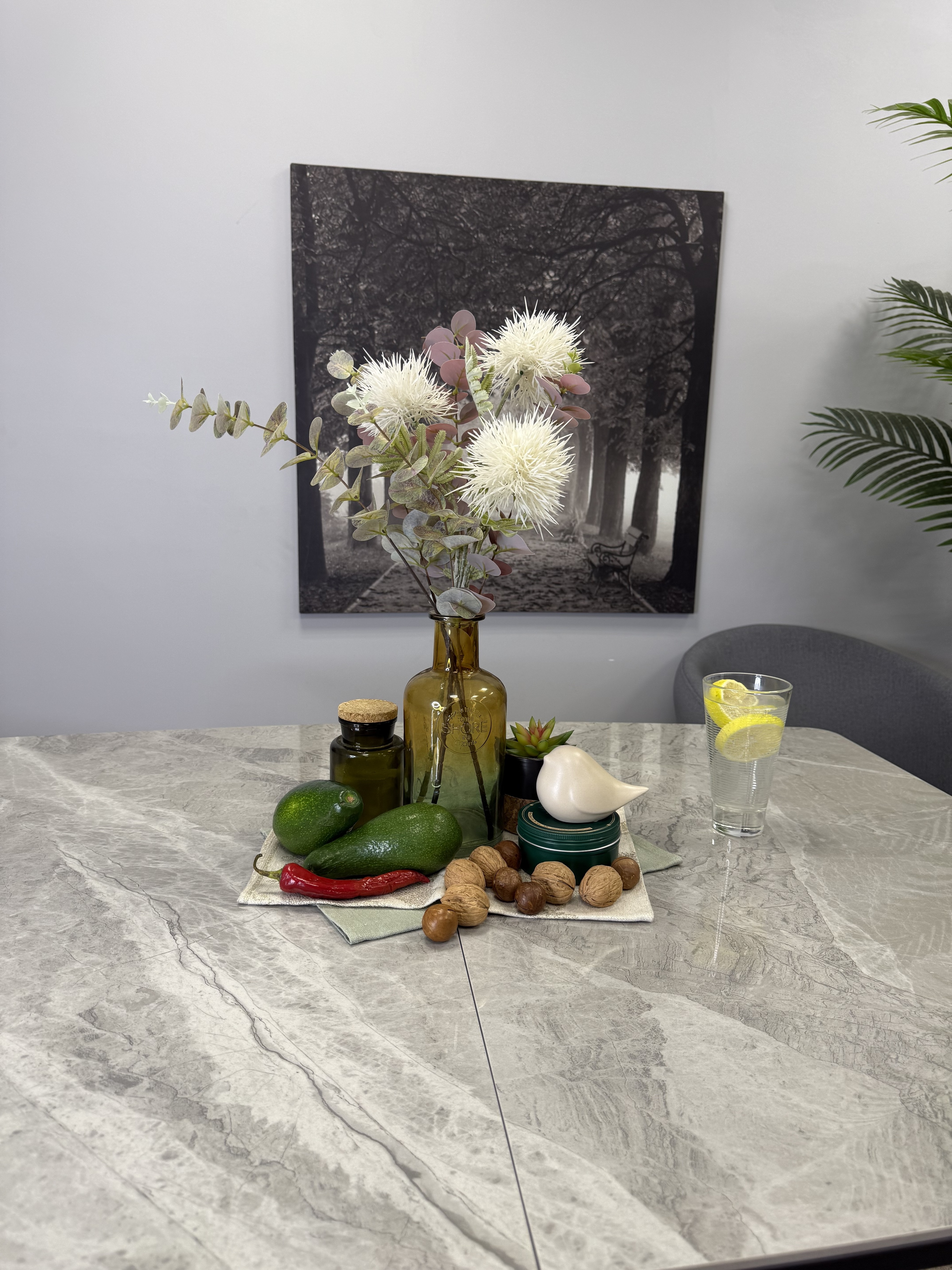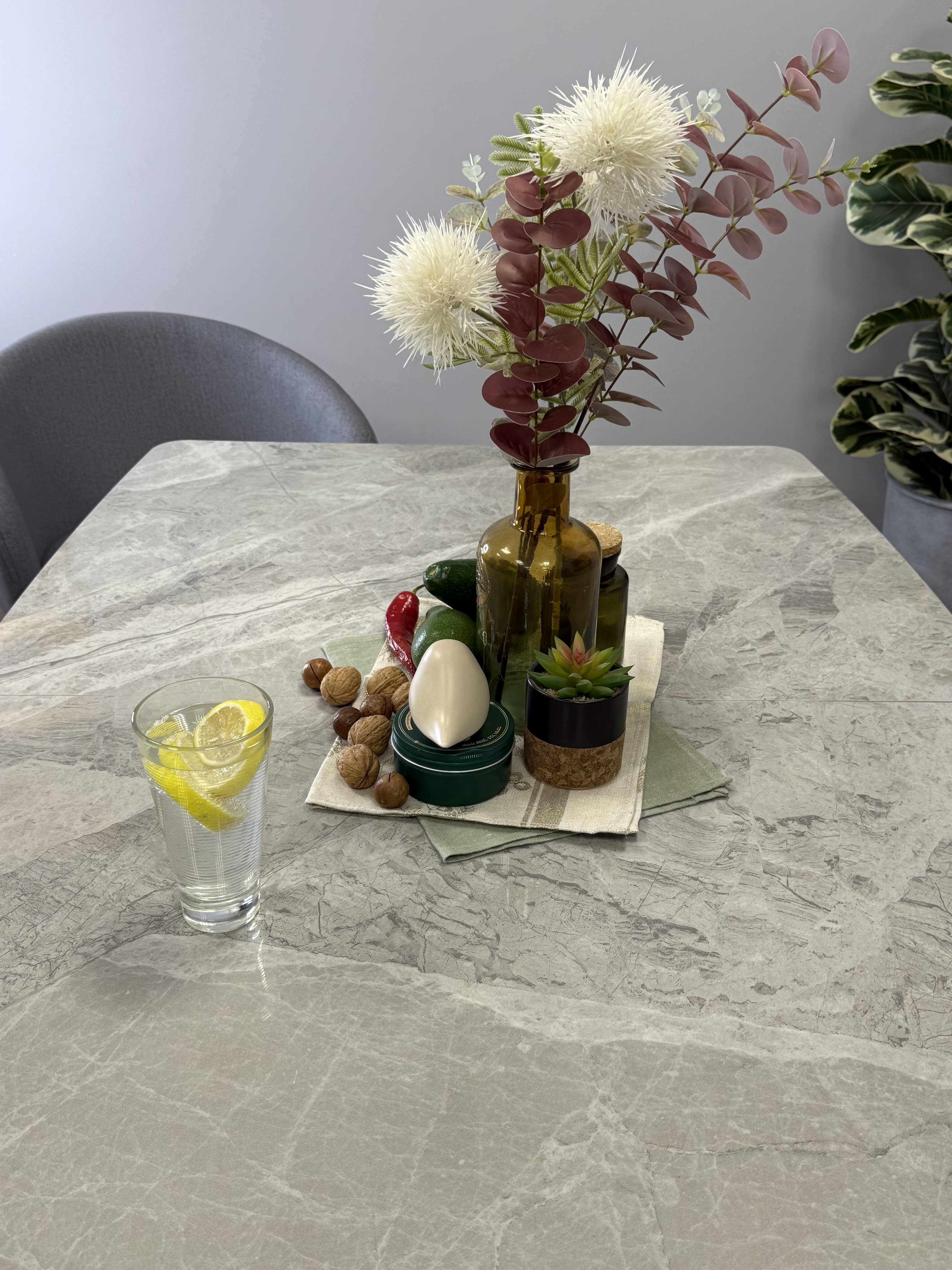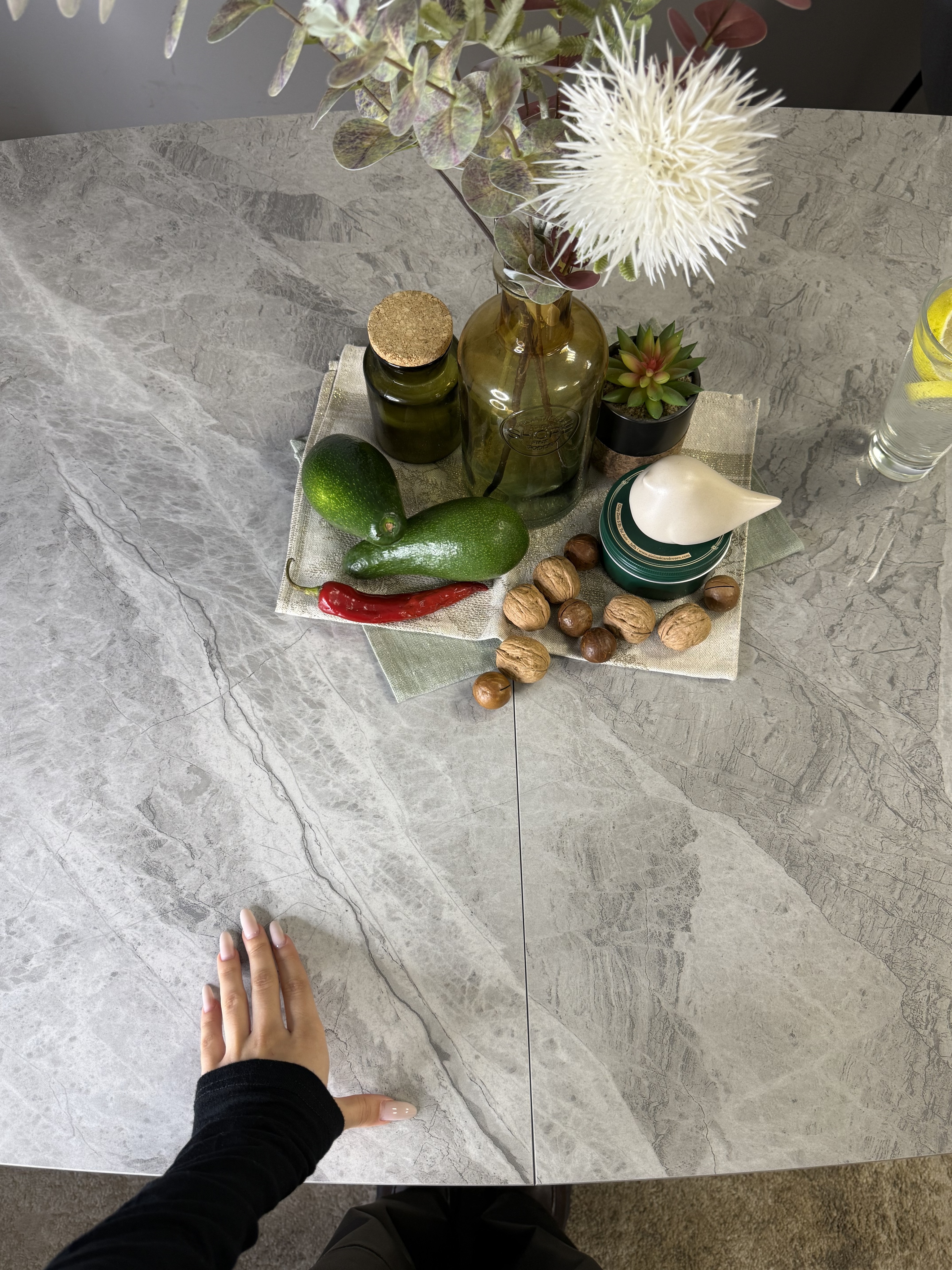 Столешница с покрытием из натуральной керамики сплошная, без щелей, что облегчает уход и ежедневную эксплуатацию. Керамика - наилучший и самый дорогой материал для обеденного стола. Она не портится от влаги, выдерживает температуру до 1000°С. Плотность керамики выше плотности металла и на ней не останутся следы от столовых приборов. Кроме того, это 100% натуральный материал в отличие от разного вида пластиков