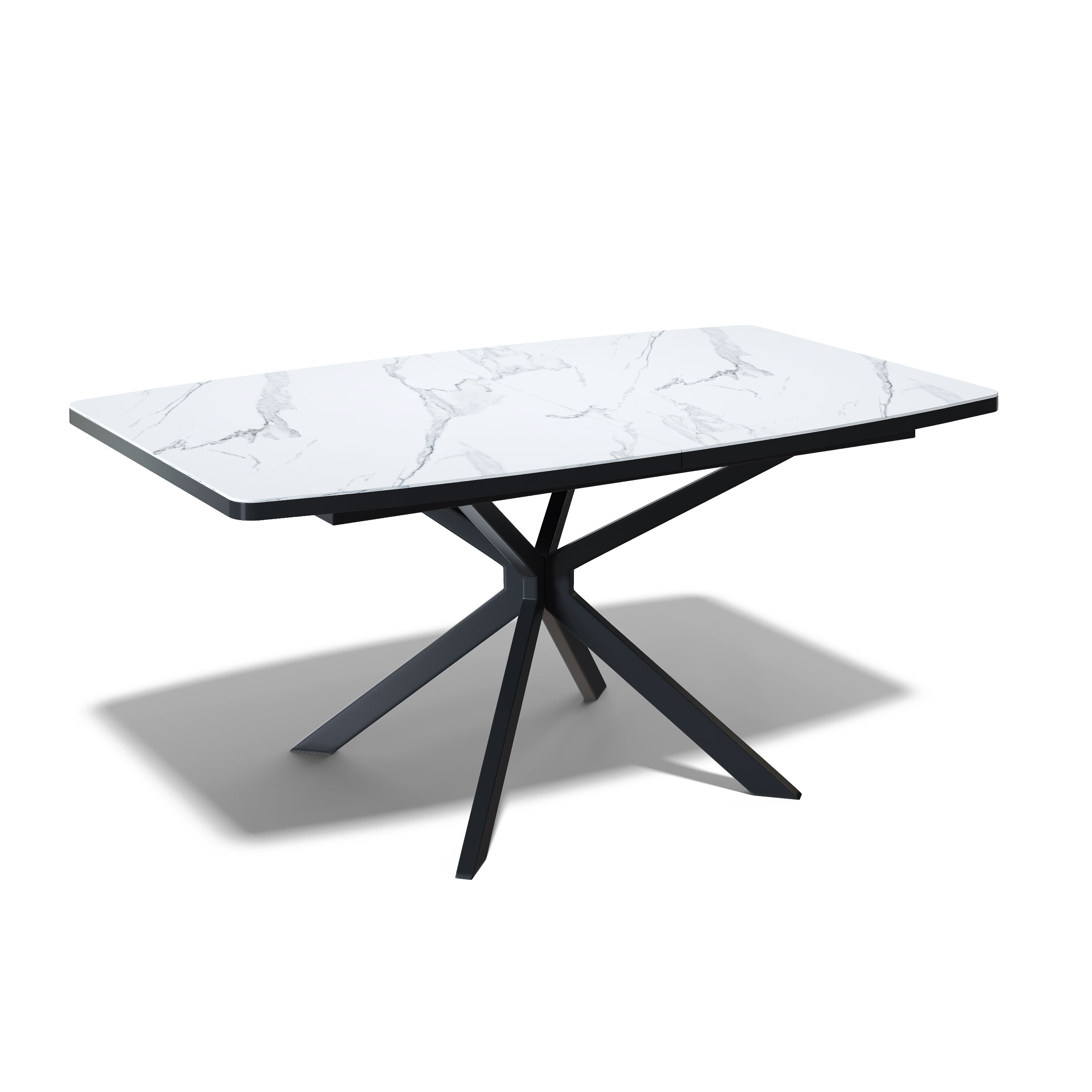 Современный стол на центральных металлических опорах, большого сечения, керамической столешницей с декором "мрамор белый". Стол в сложенном состоянии спокойно размещает 8 человек и 12 человек в разложенном. Большим преимуществом стола является торцевой механизм раскладки. . Механизм не перекашивается при открывании одной рукой, на каждое крыло может спокойно опереться человек.