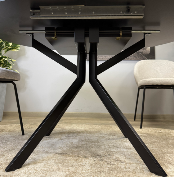 Опоры стола раскладываются необычным образом - столешница раздвигается вместе с опорами. Это решает сразу несколько проблем: опоры не мешают сидеть никому из гостей, широкая столешница не провисает и на нее можно облокачиваться так же уверенно как и в сложенном состоянии