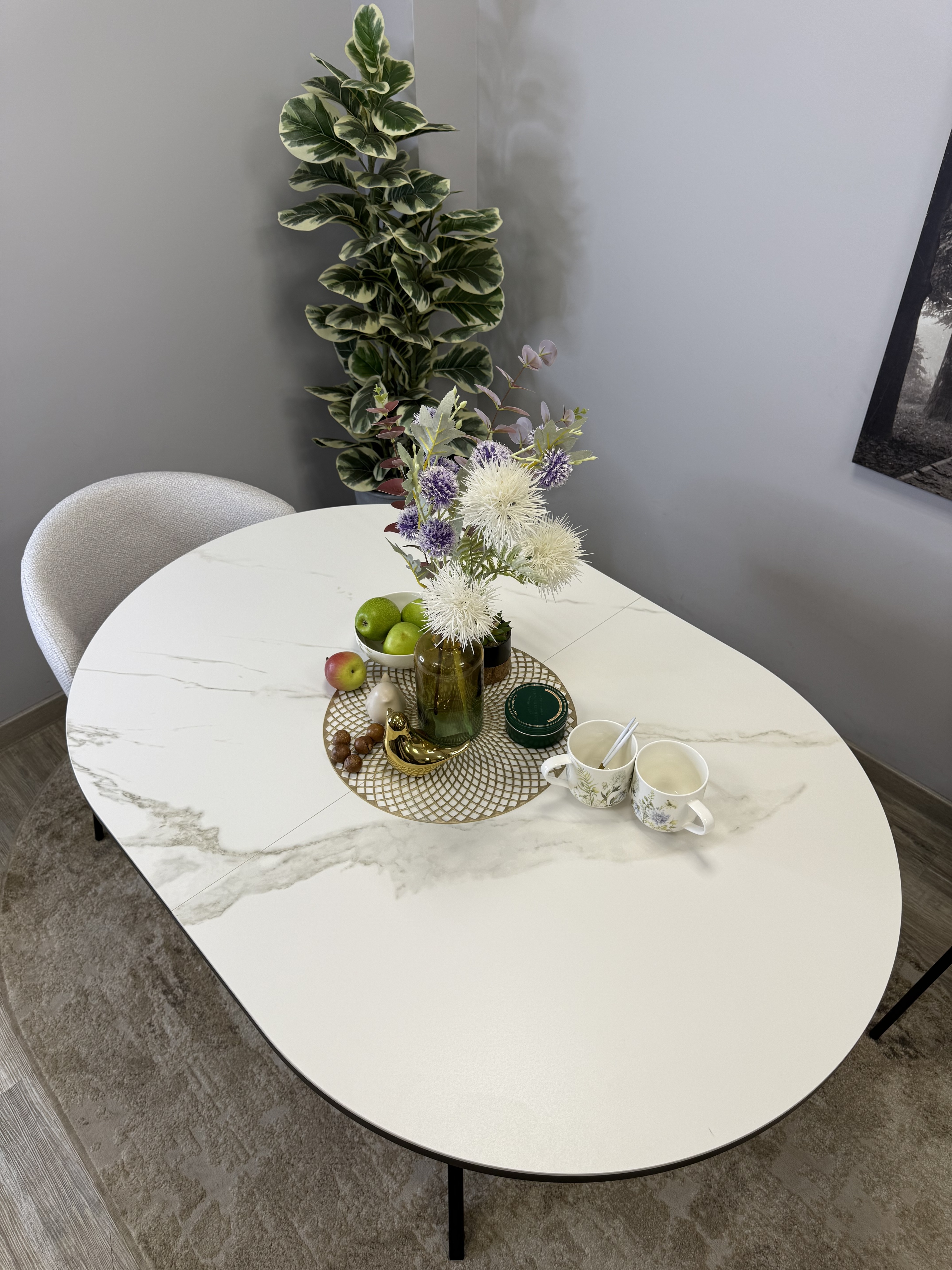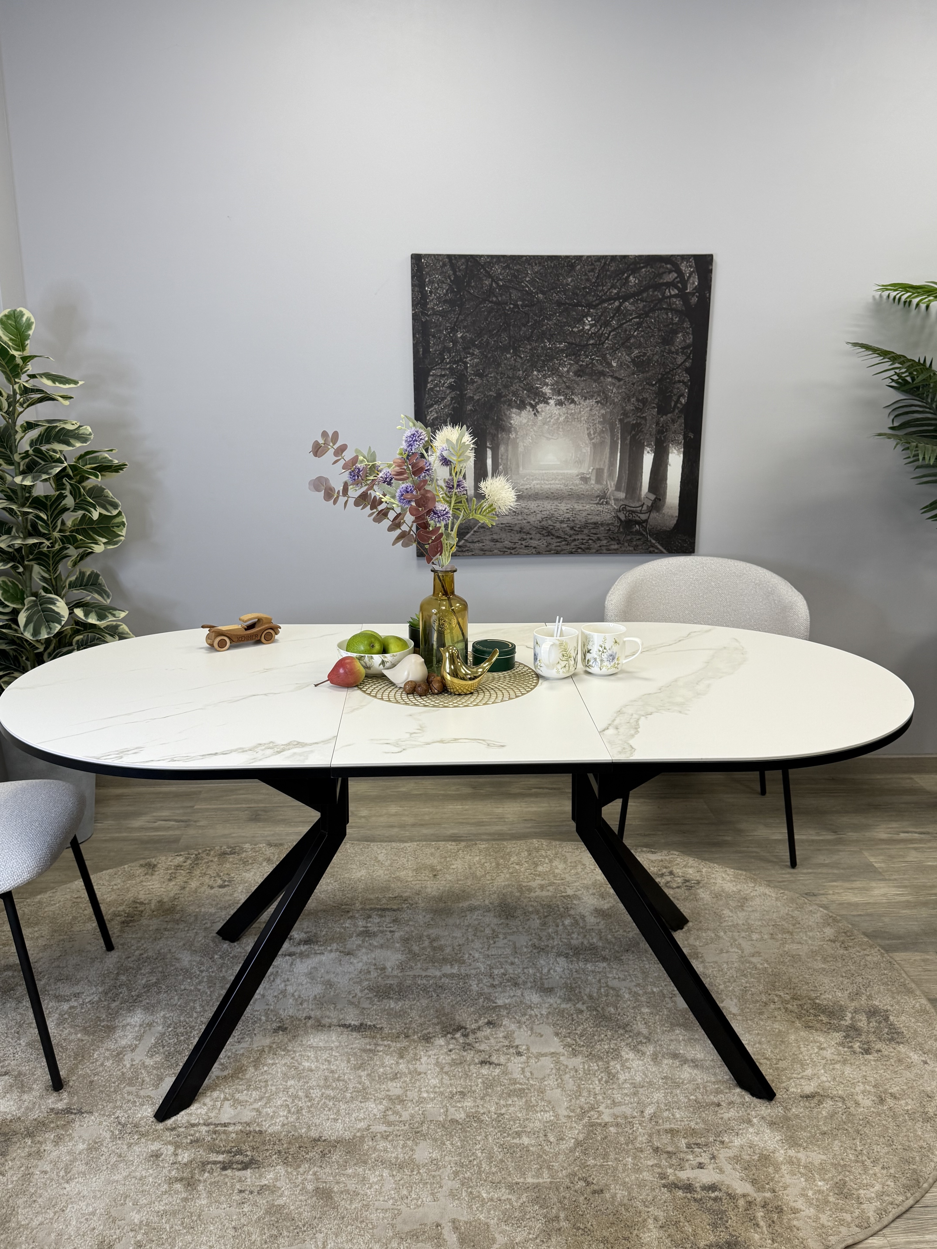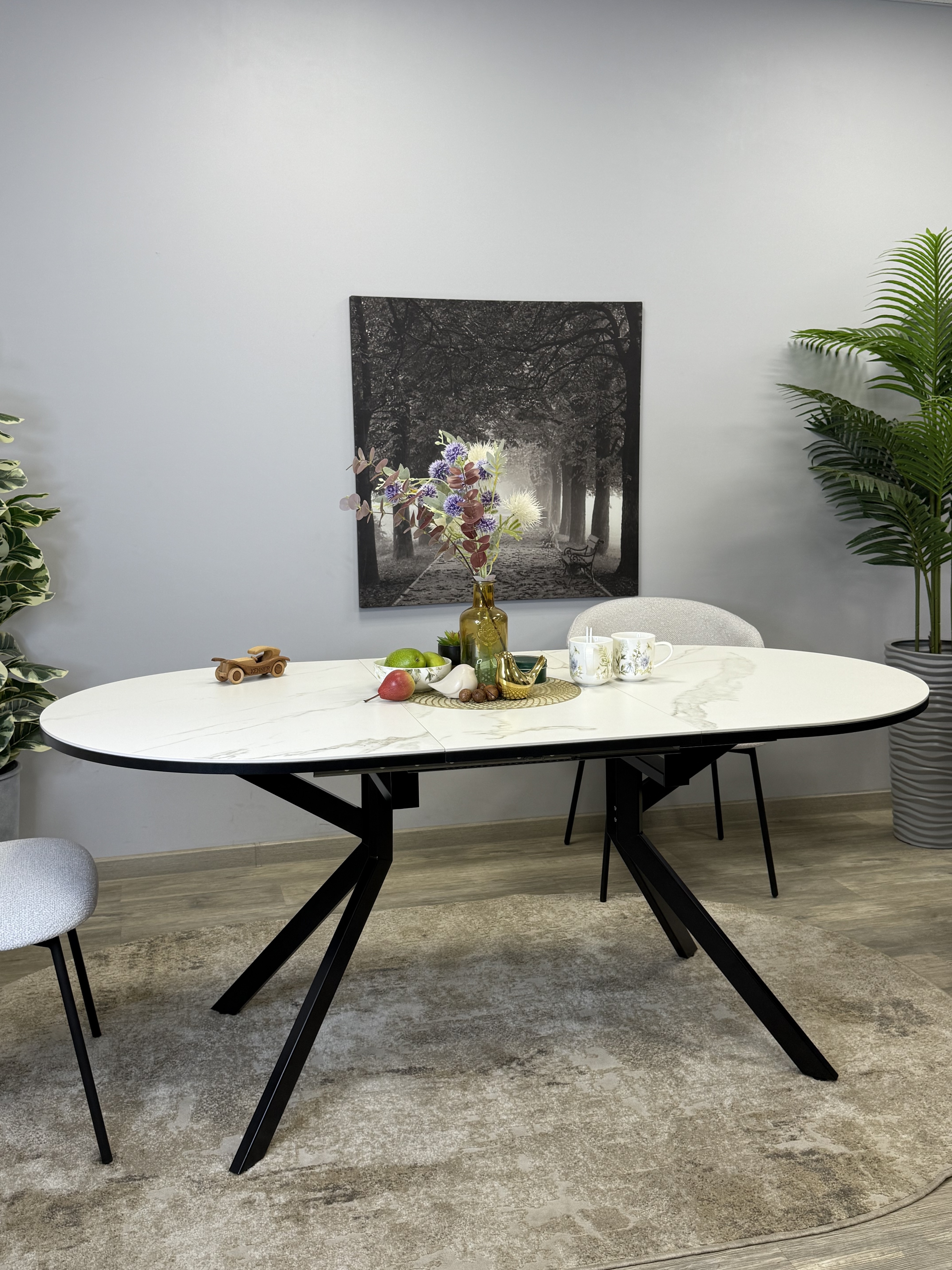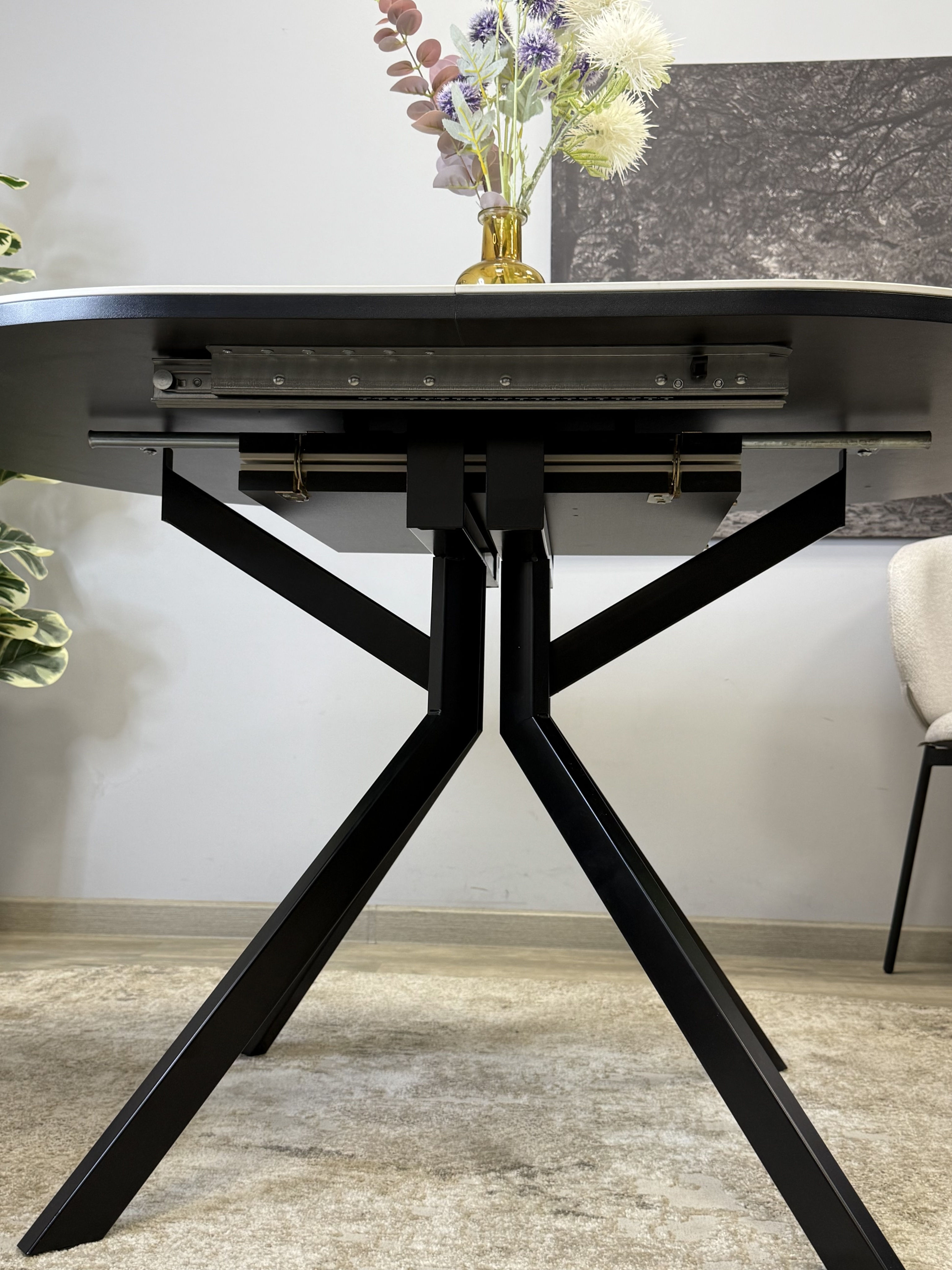 Стол с овальной столешницей, тонкими, но надежными опорами и самой удобной системой раздвижения, из всех которые мы делали до сих пор.