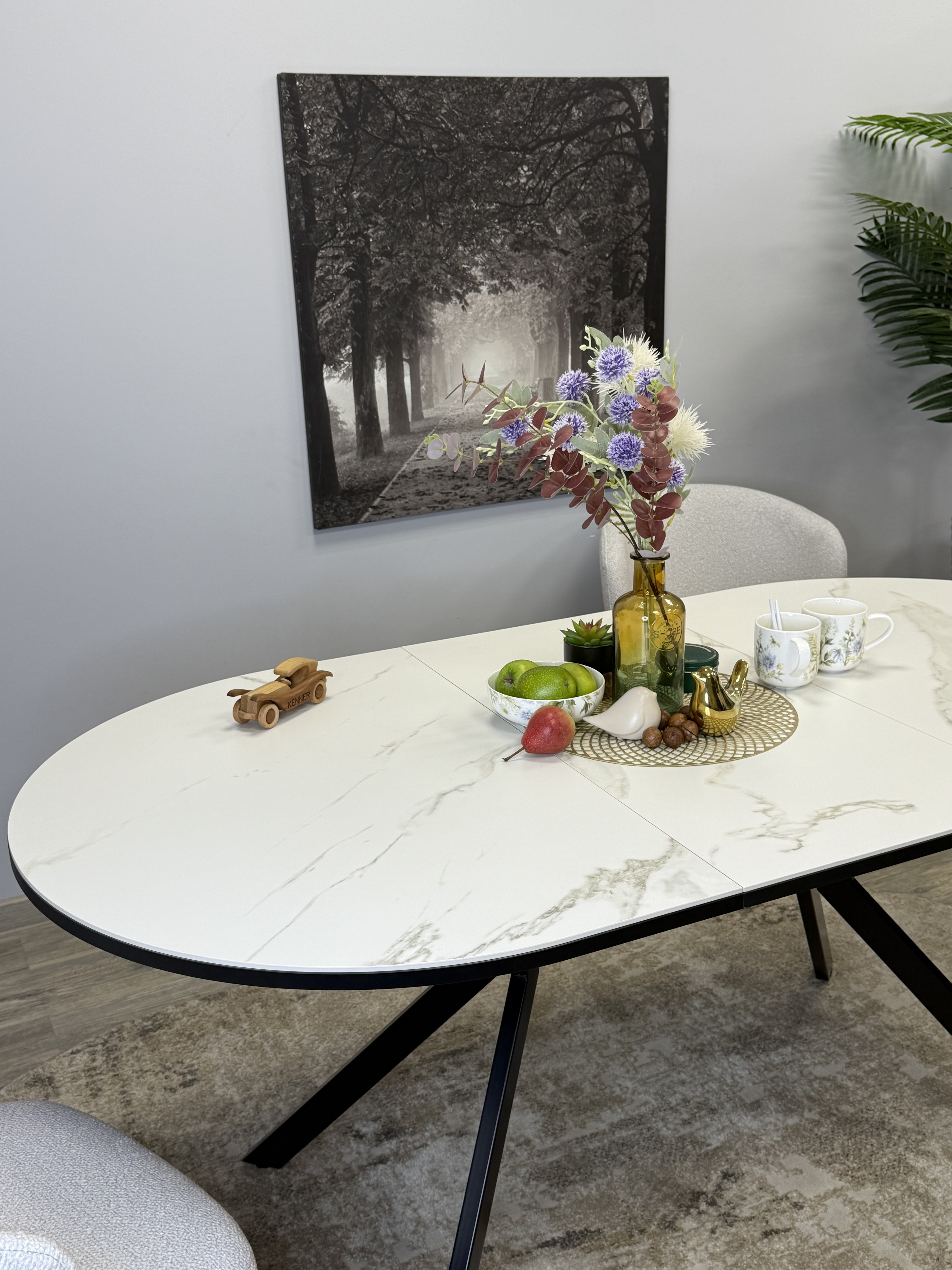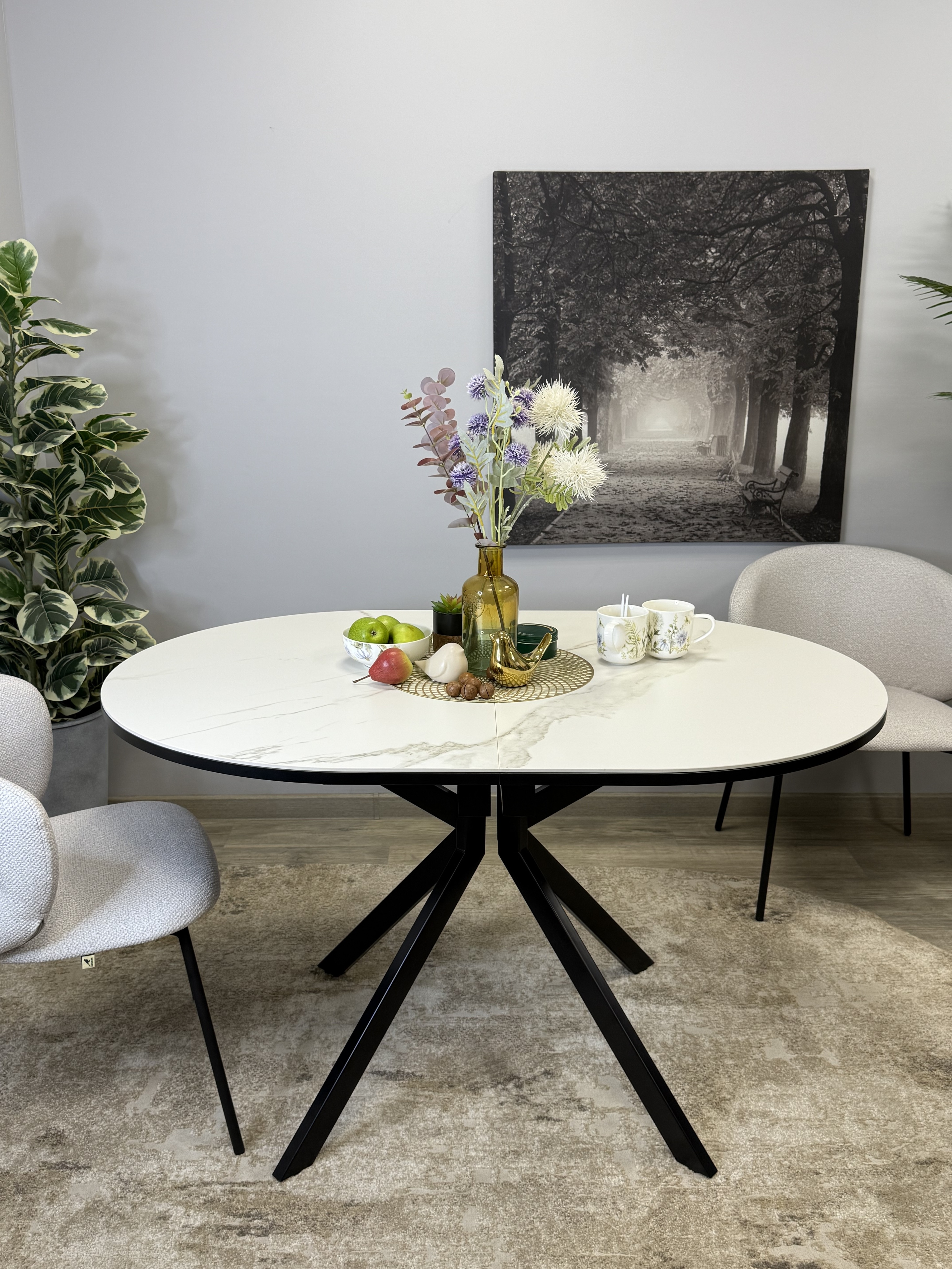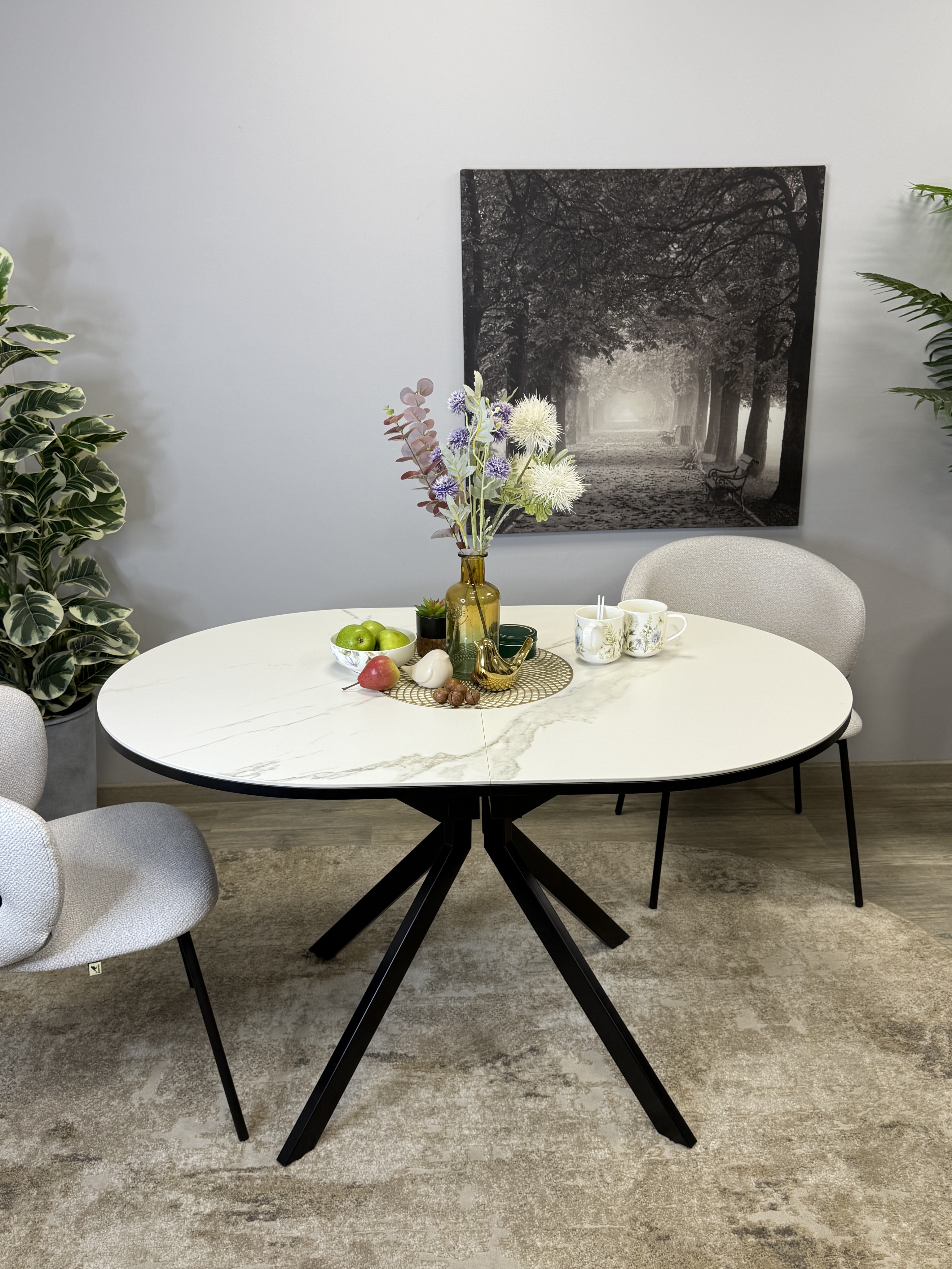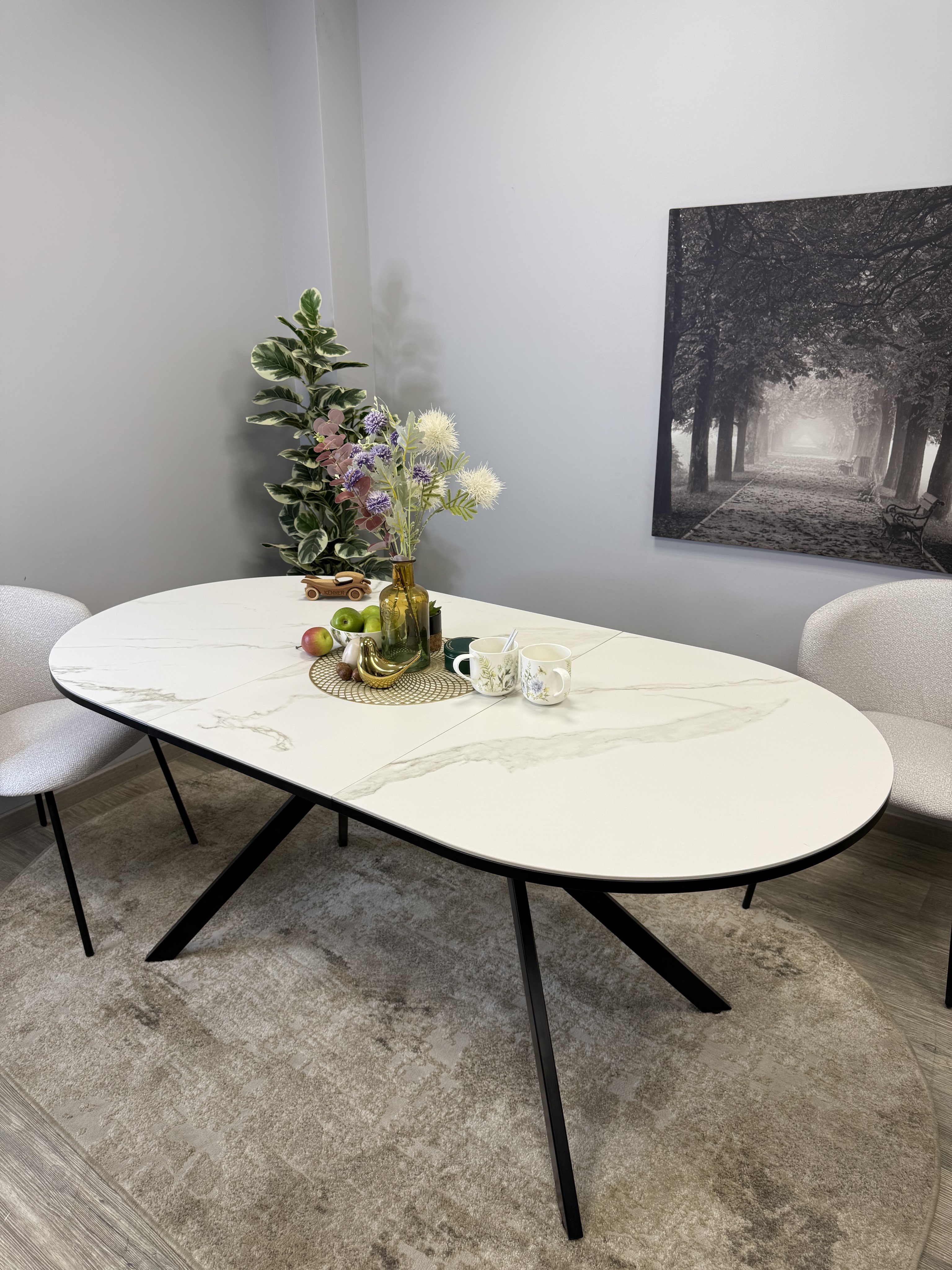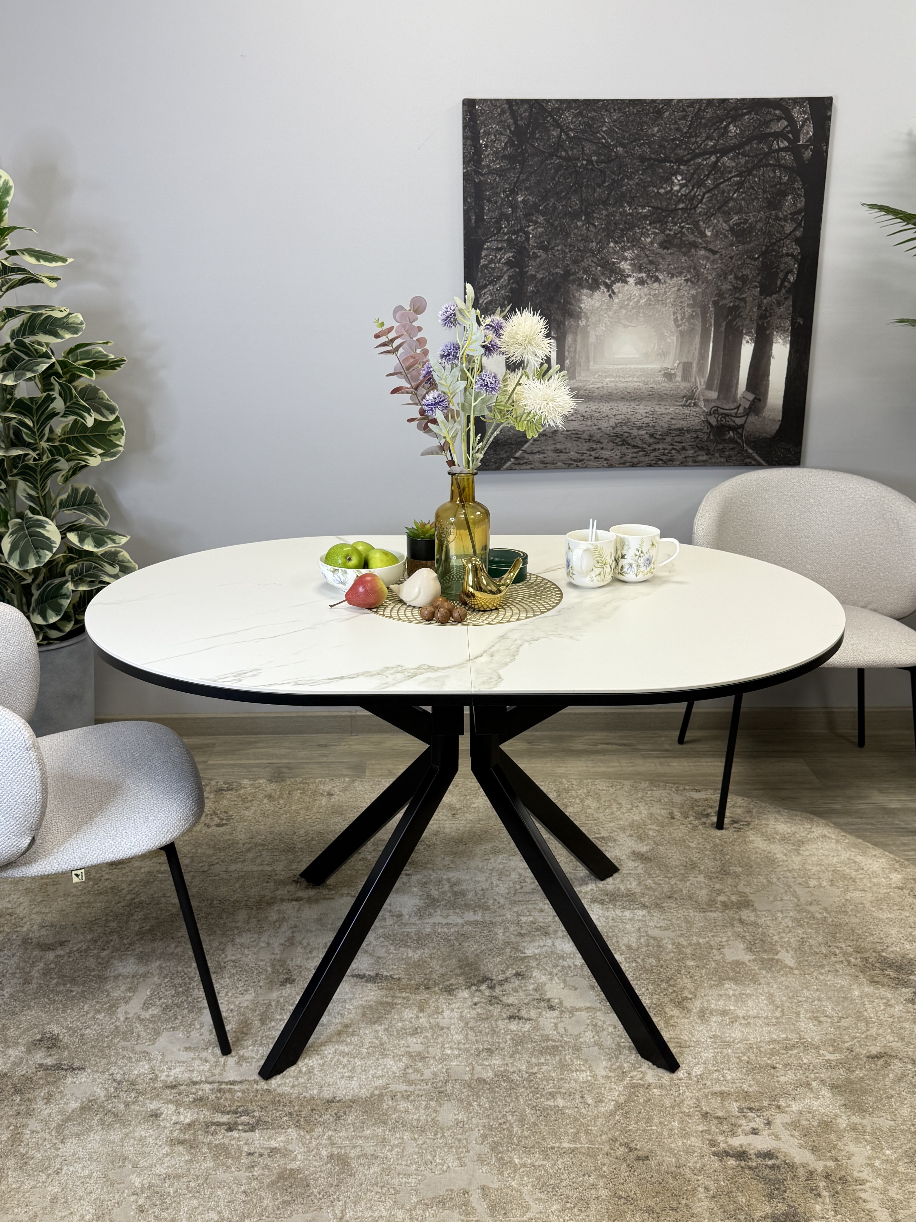 Стол с овальной столешницей, тонкими, но надежными опорами и самой удобной системой раздвижения, из всех которые мы делали до сих пор.