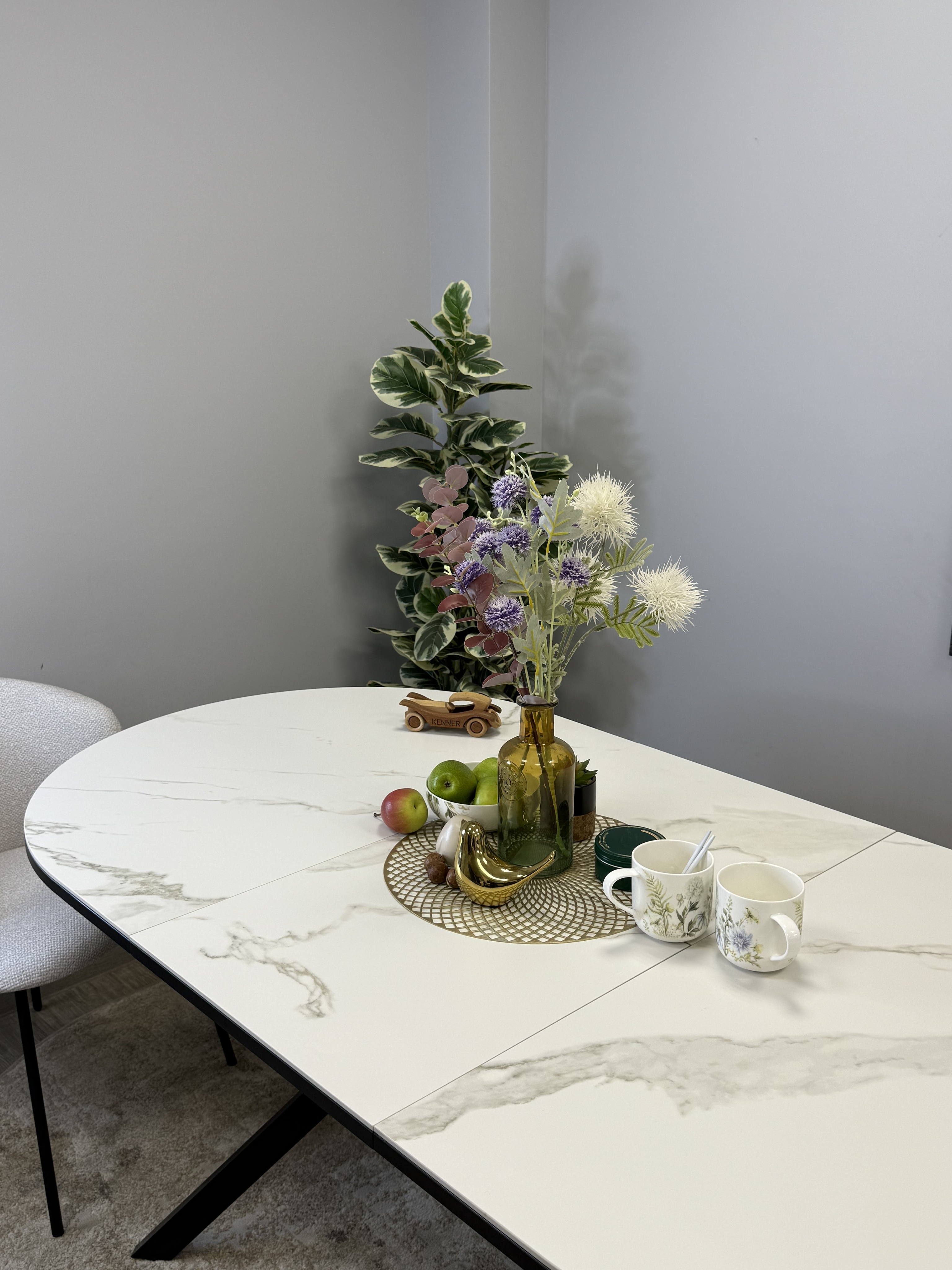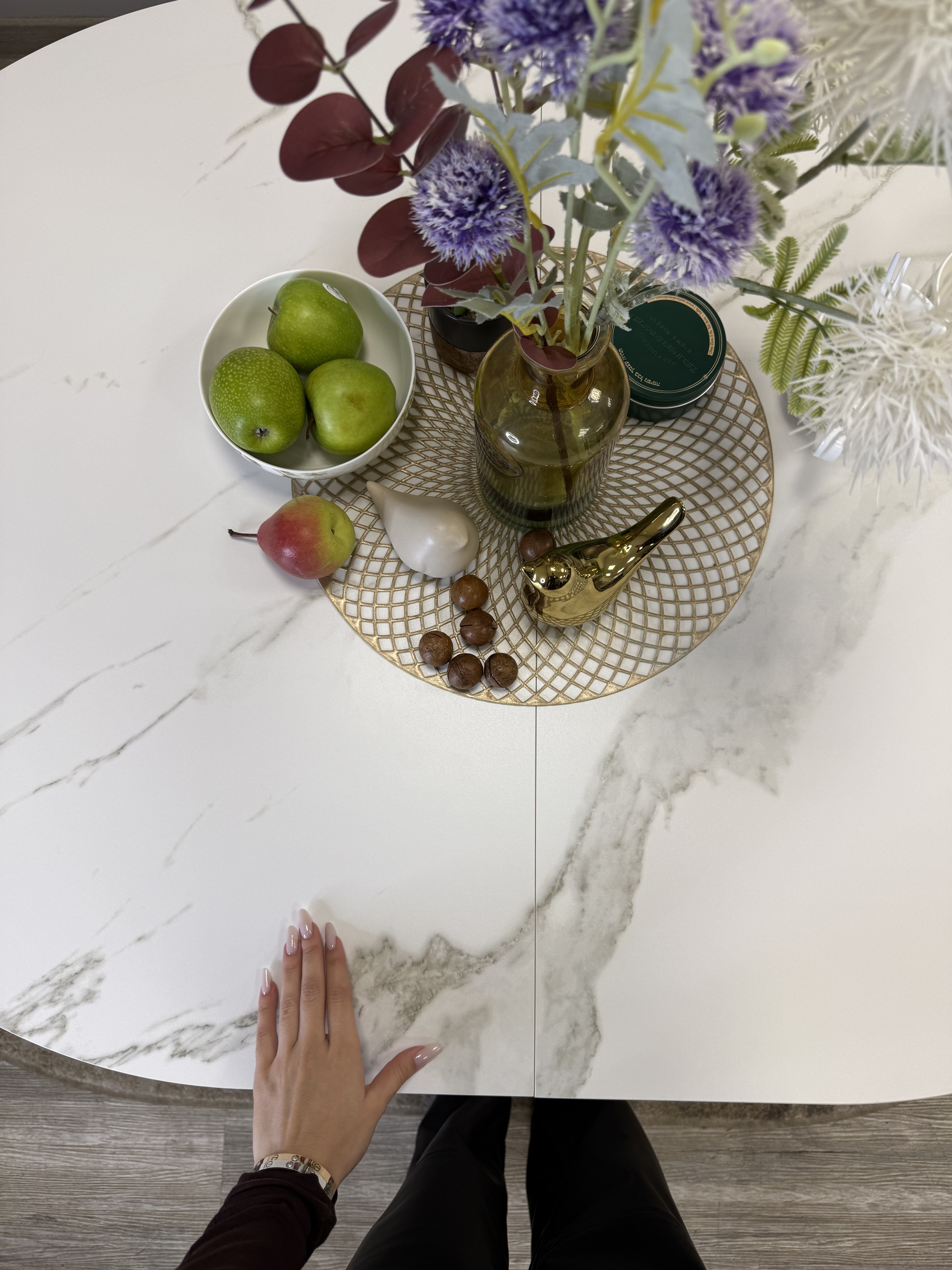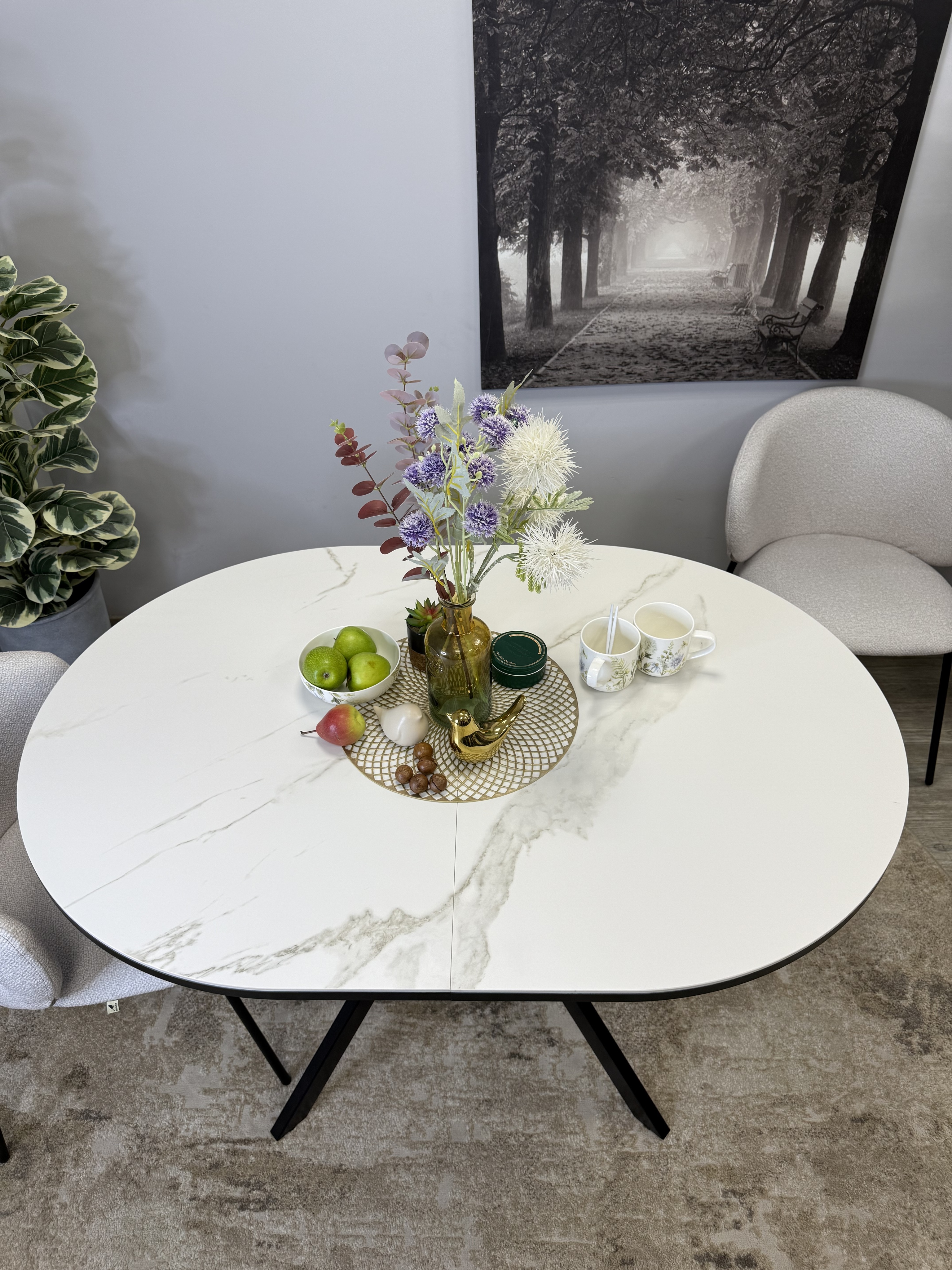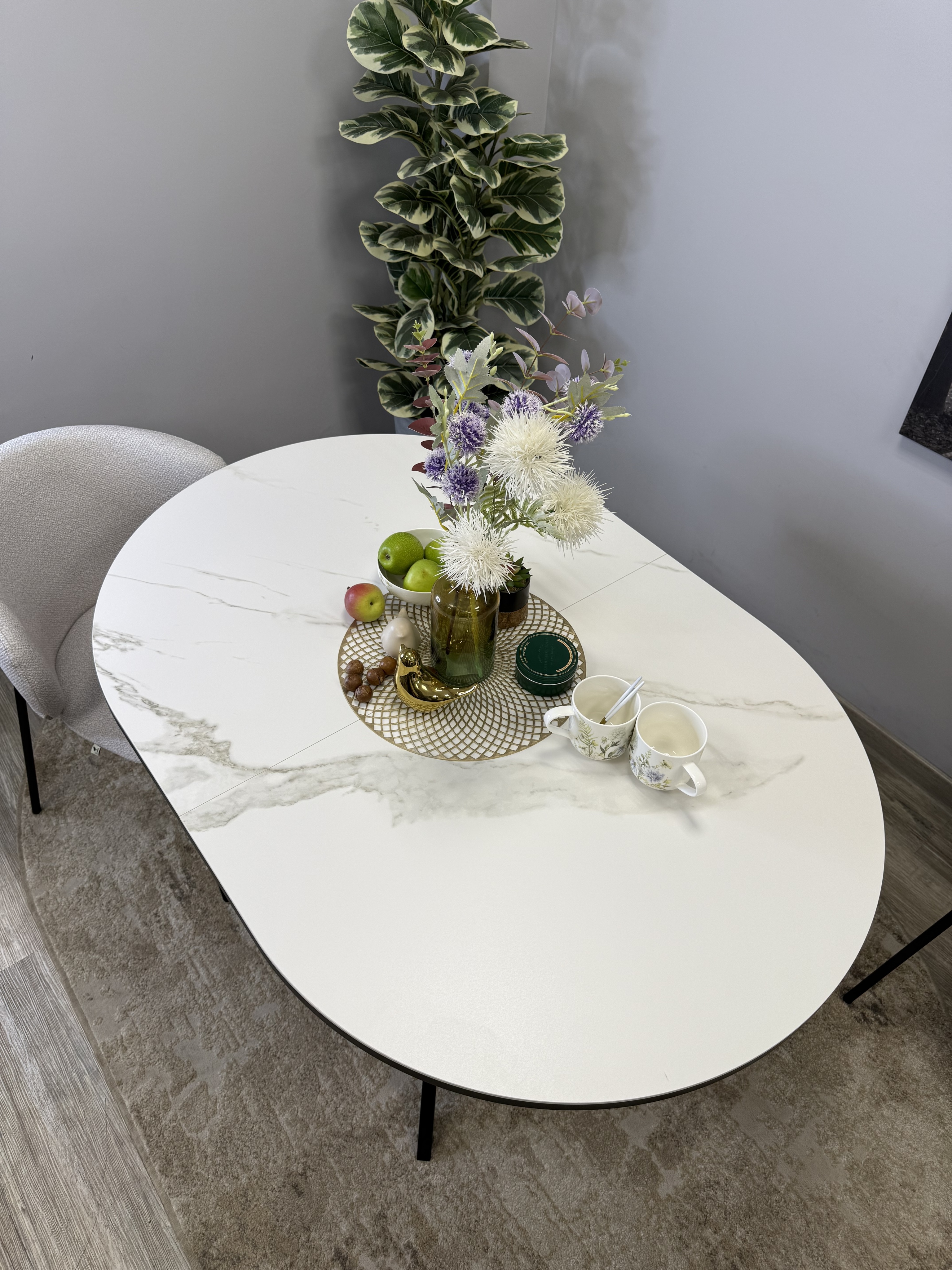 Стол с овальной столешницей, тонкими, но надежными опорами и самой удобной системой раздвижения, из всех которые мы делали до сих пор.