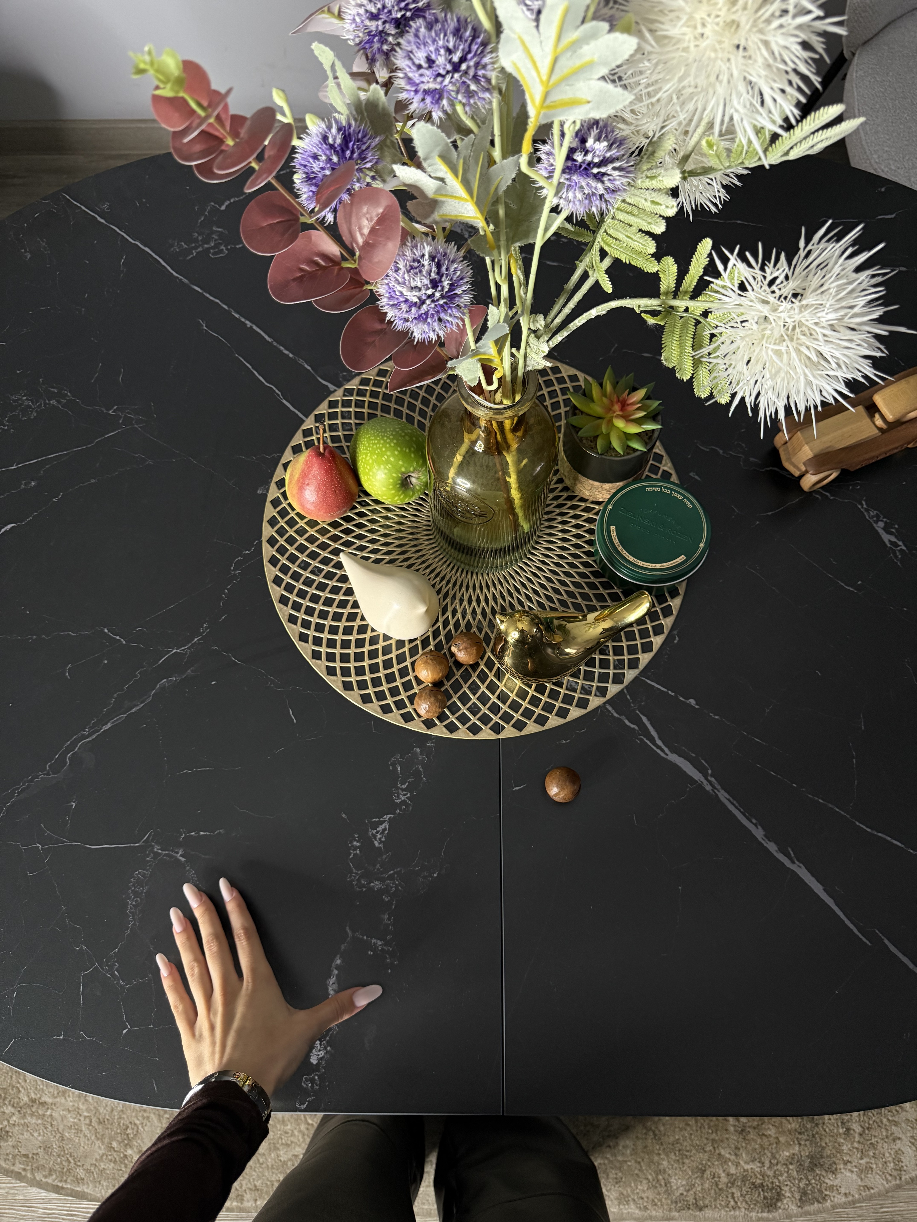 Опоры стола раскладываются необычным образом - столешница раздвигается вместе с опорами. Это решает сразу несколько проблем: опоры не мешают сидеть никому из гостей, широкая столешница не провисает и на нее можно облокачиваться так же уверенно, как и в сложенном состоянии
