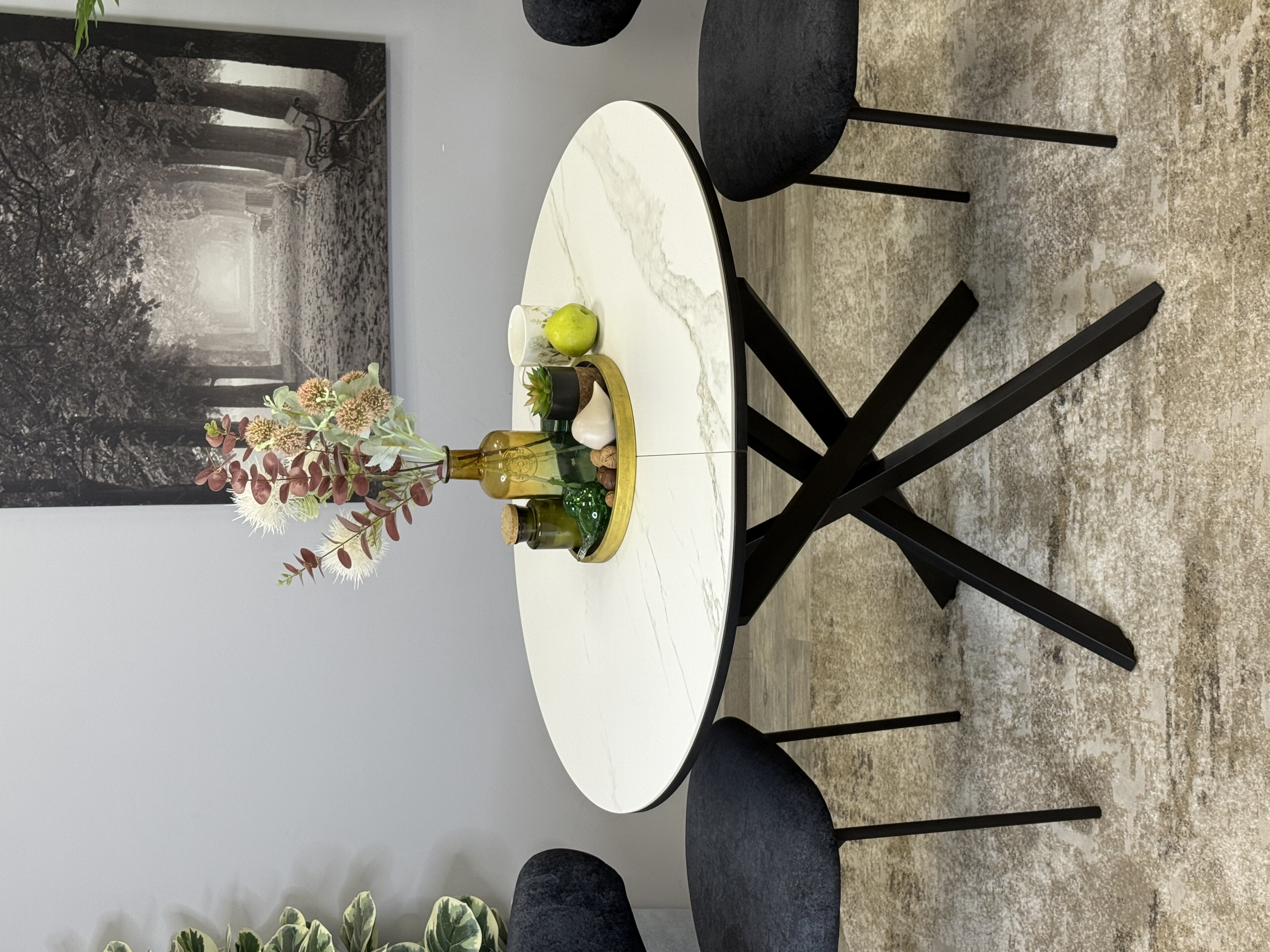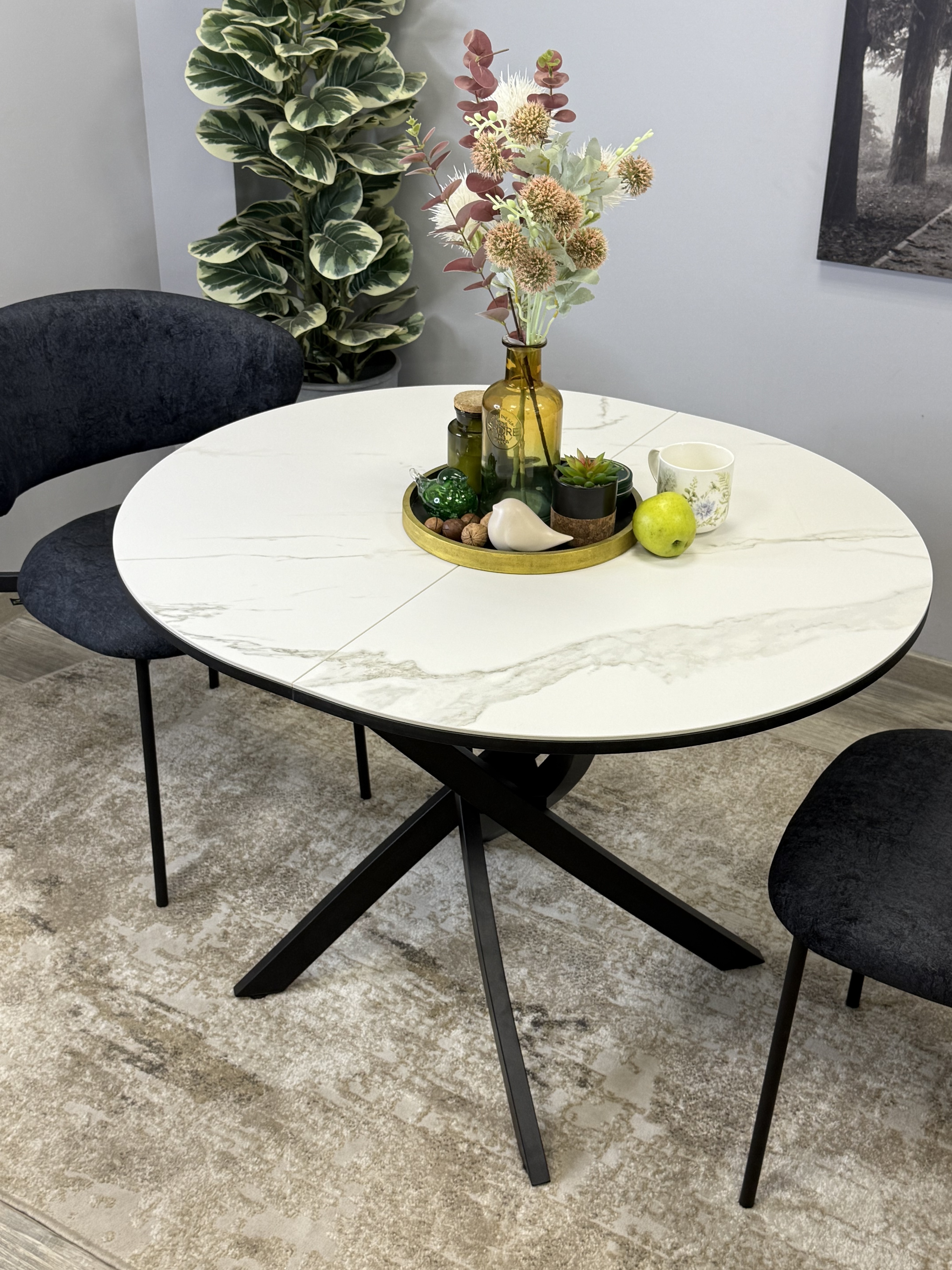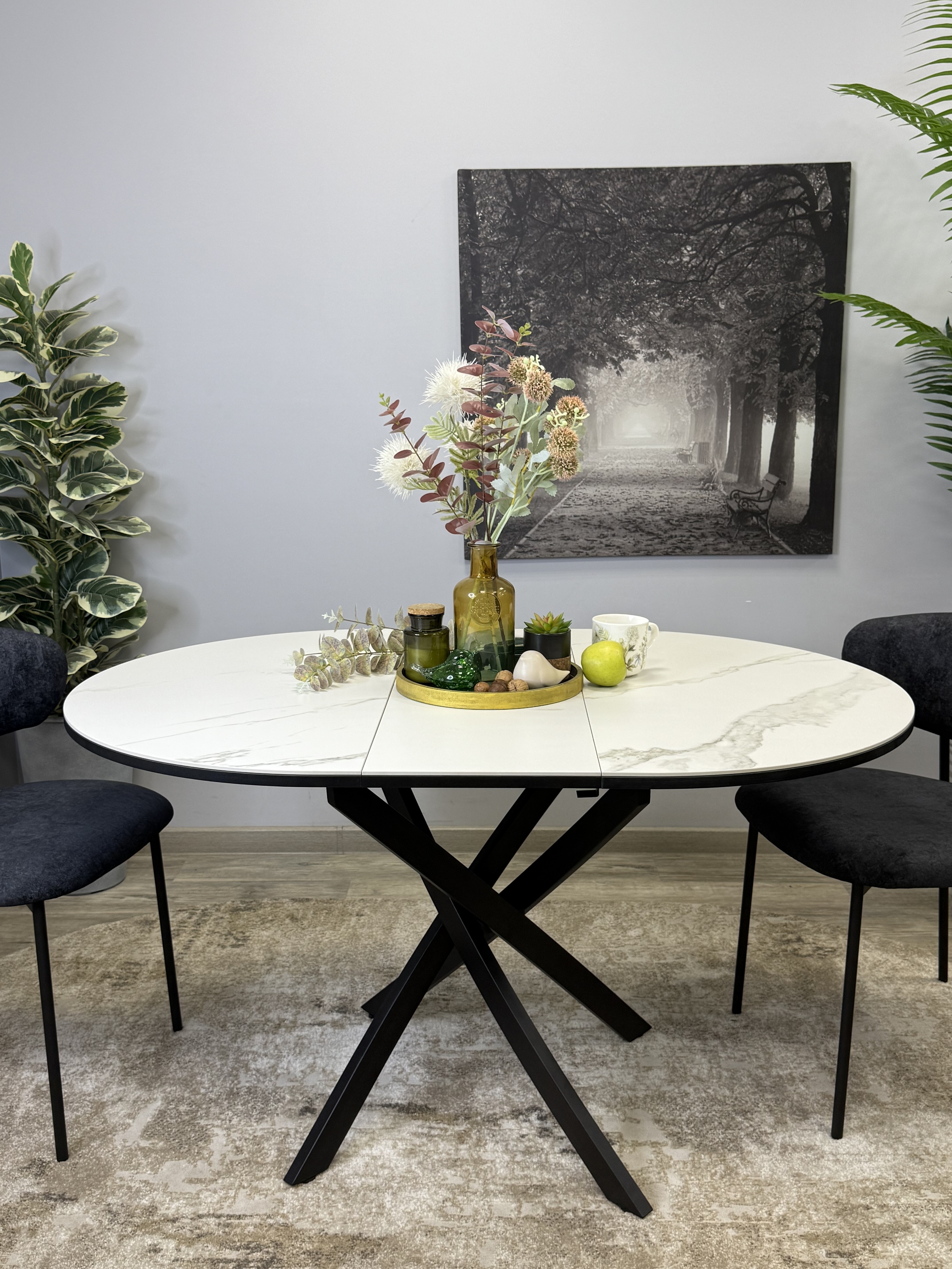 Ключевой особенностью этого стола является керамическая поверхность диаметром 90 см и долговечным, стабильным основанием. Дополняет комплект вставка на 30 см, расширяющая площадь стола.