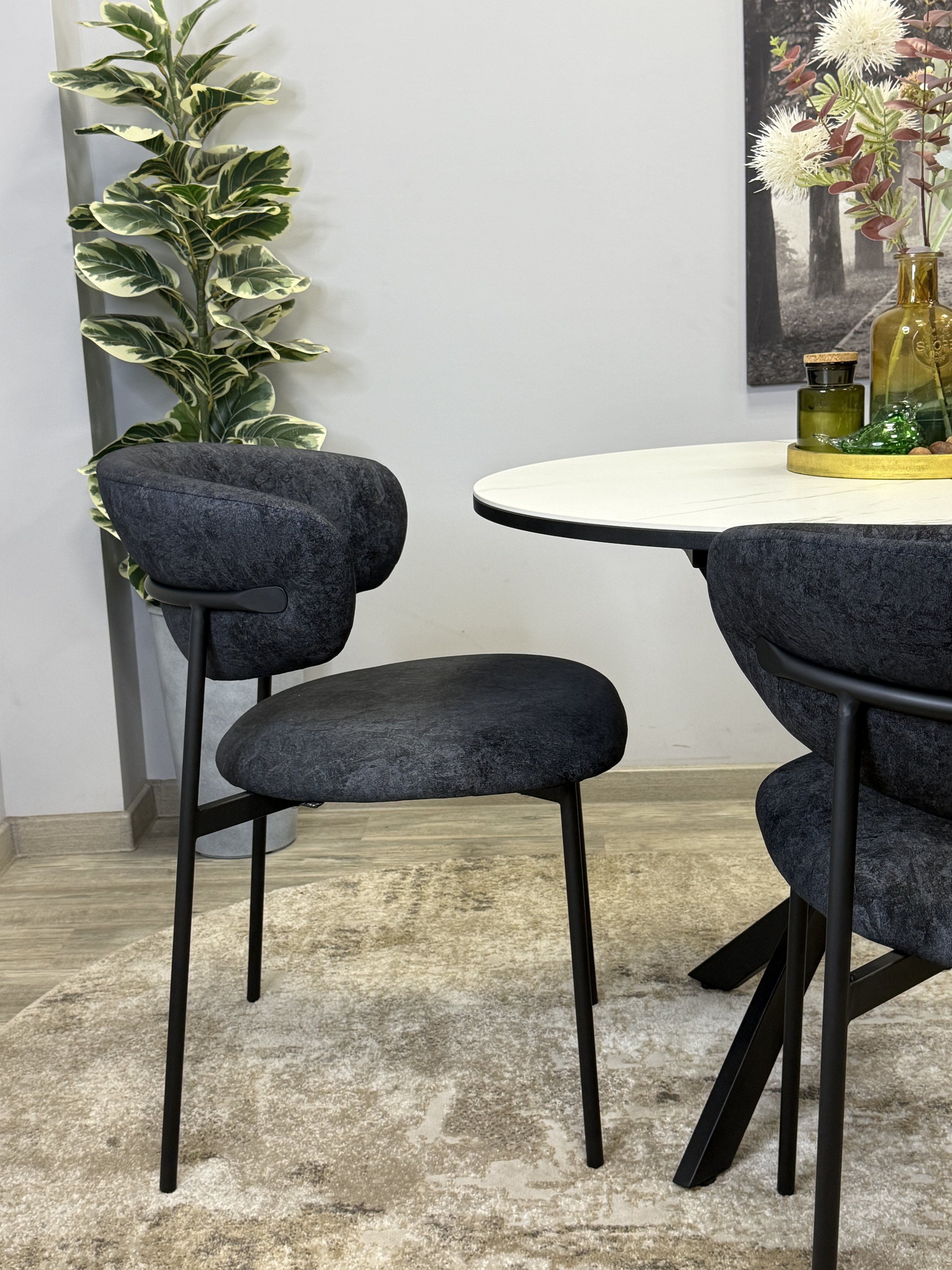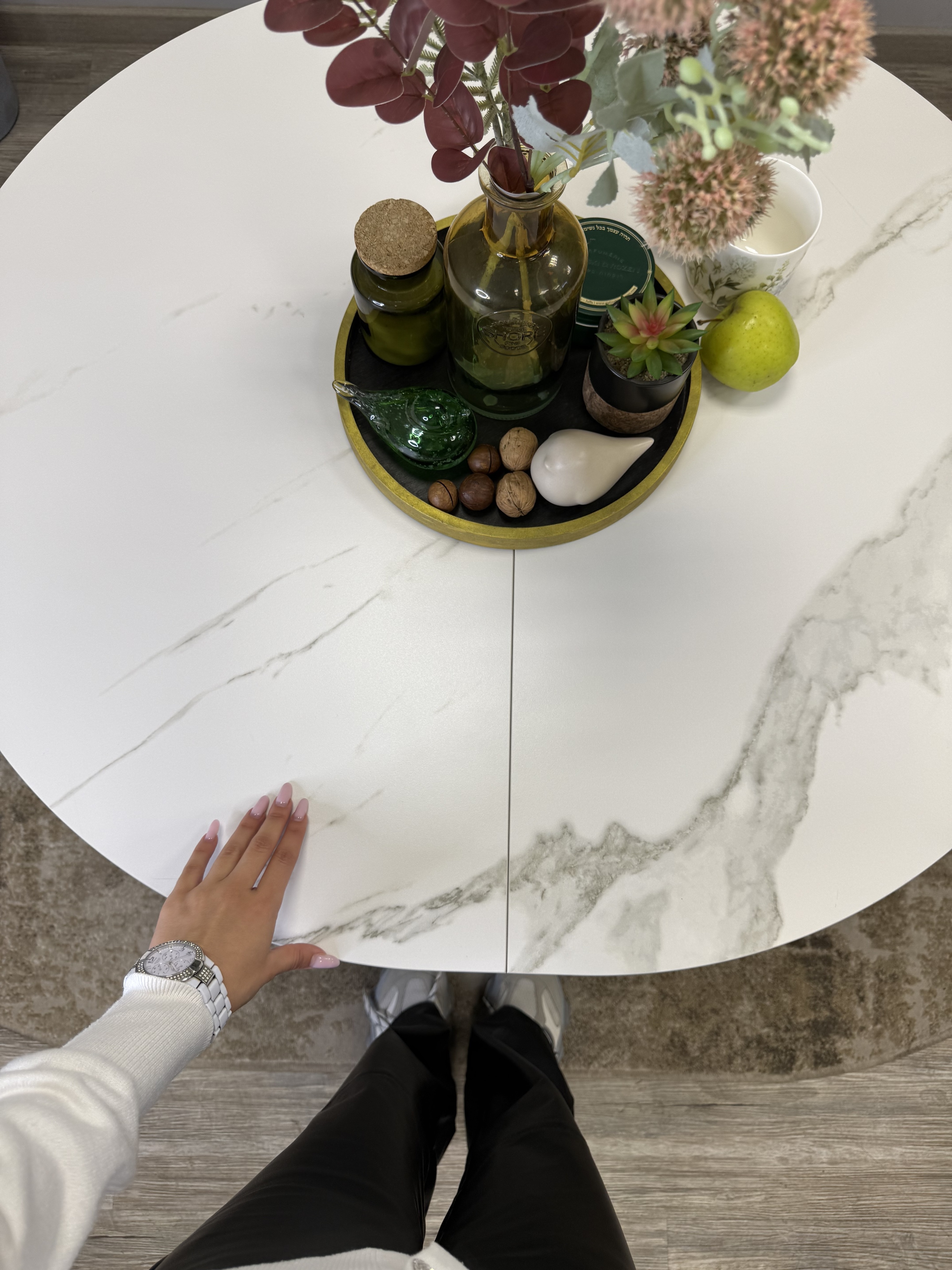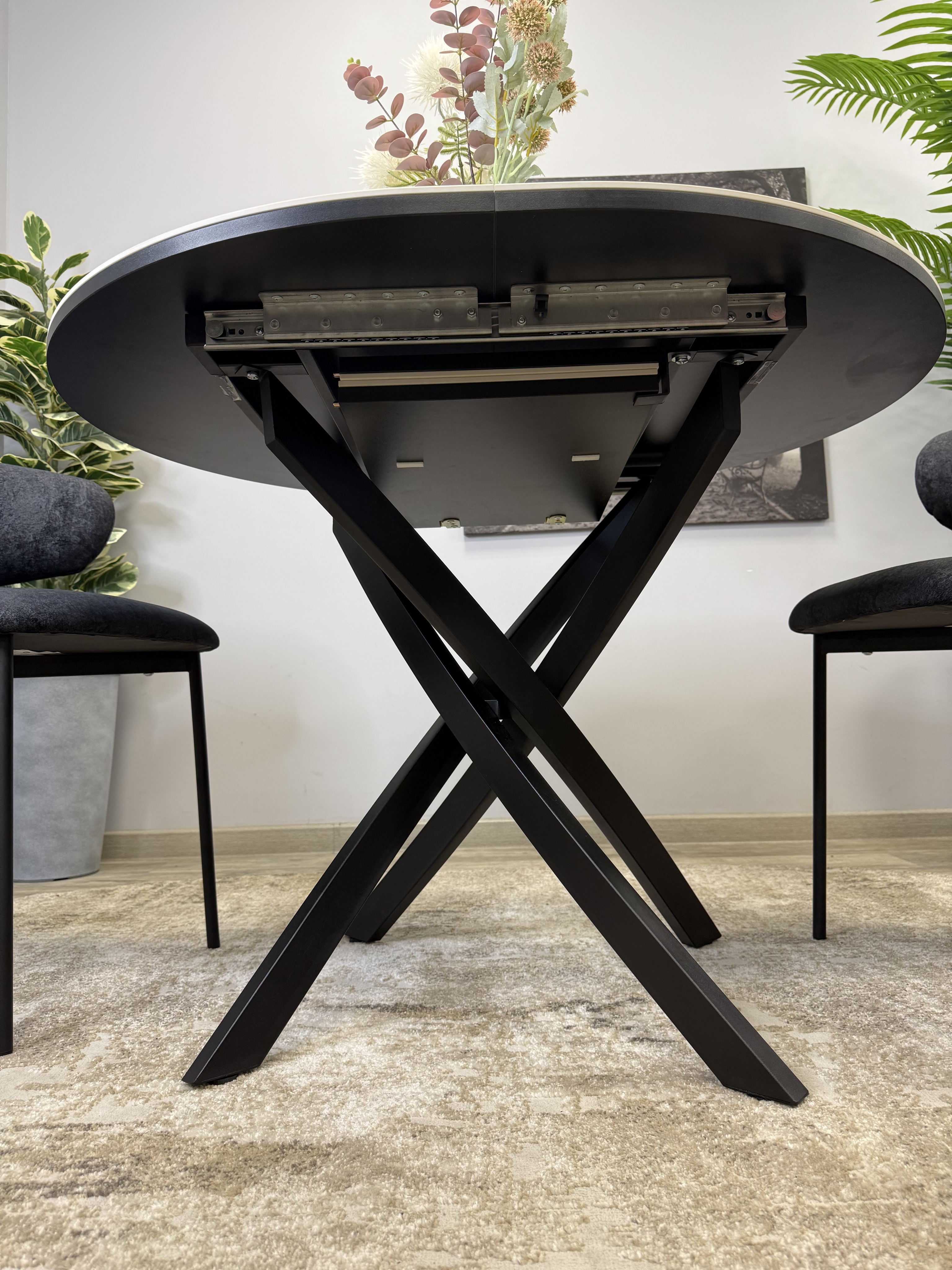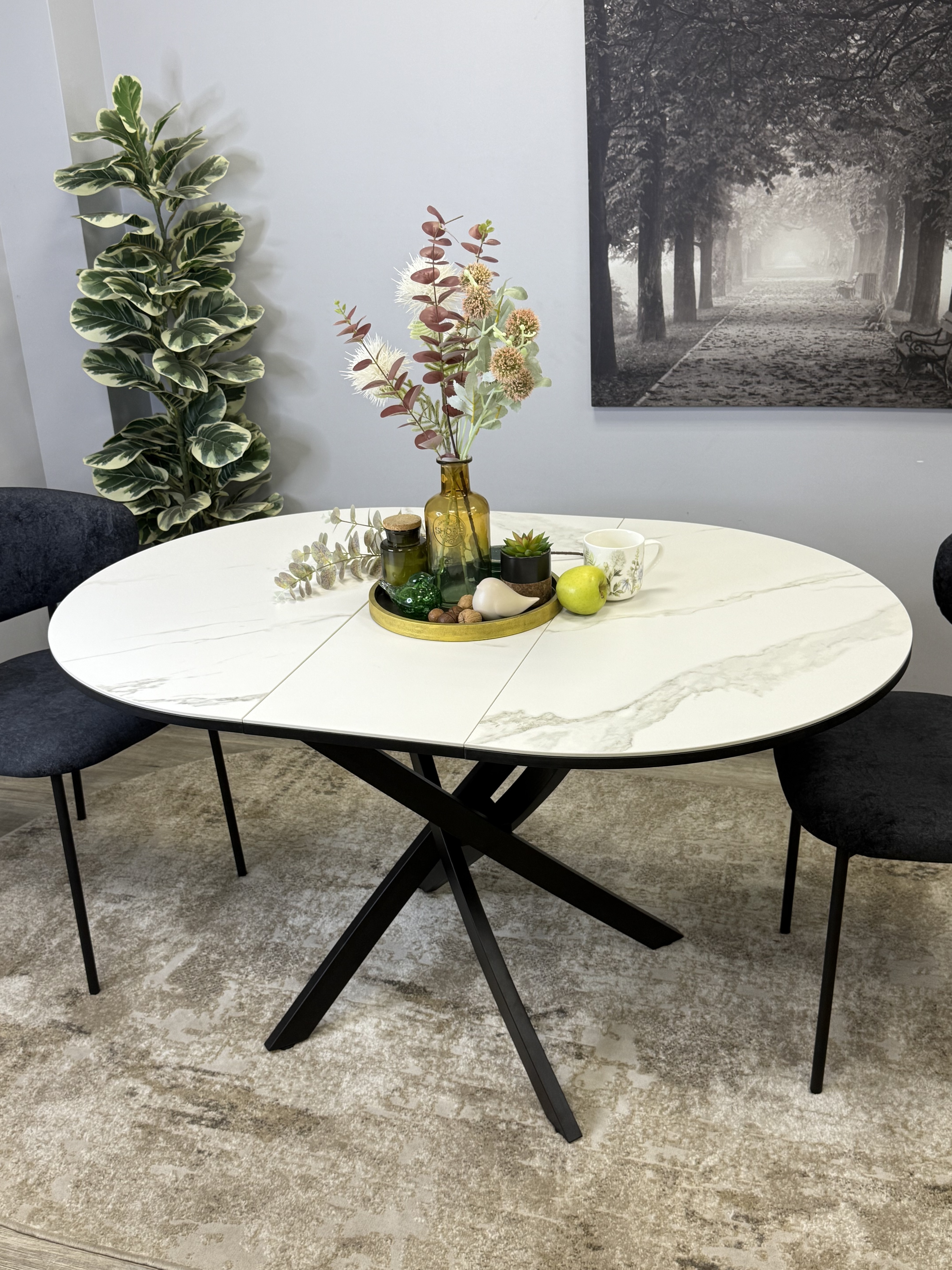 Ключевой особенностью этого стола является керамическая поверхность диаметром 90 см и долговечным, стабильным основанием. Дополняет комплект вставка на 30 см, расширяющая площадь стола.