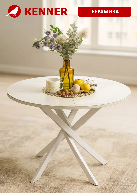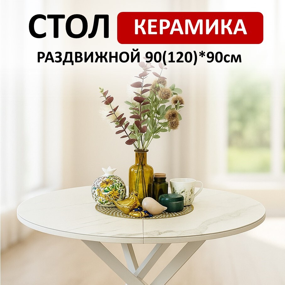 Ключевой особенностью этого стола является керамическая поверхность диаметром 90 см и долговечным, стабильным основанием. Дополняет комплект вставка на 30 см, расширяющая площадь стола.
