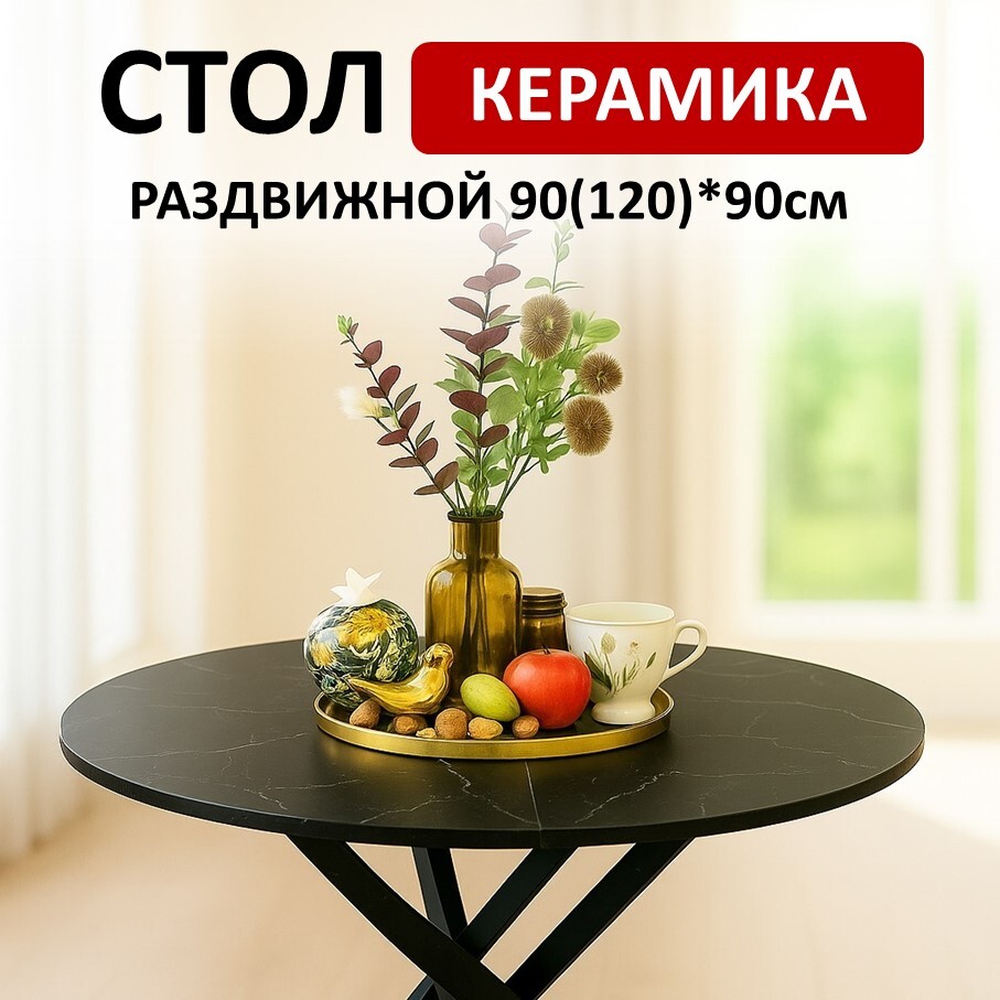 Ключевой особенностью этого стола является керамическая поверхность диаметром 90 см и долговечным, стабильным основанием. Дополняет комплект вставка на 30 см, расширяющая площадь стола.