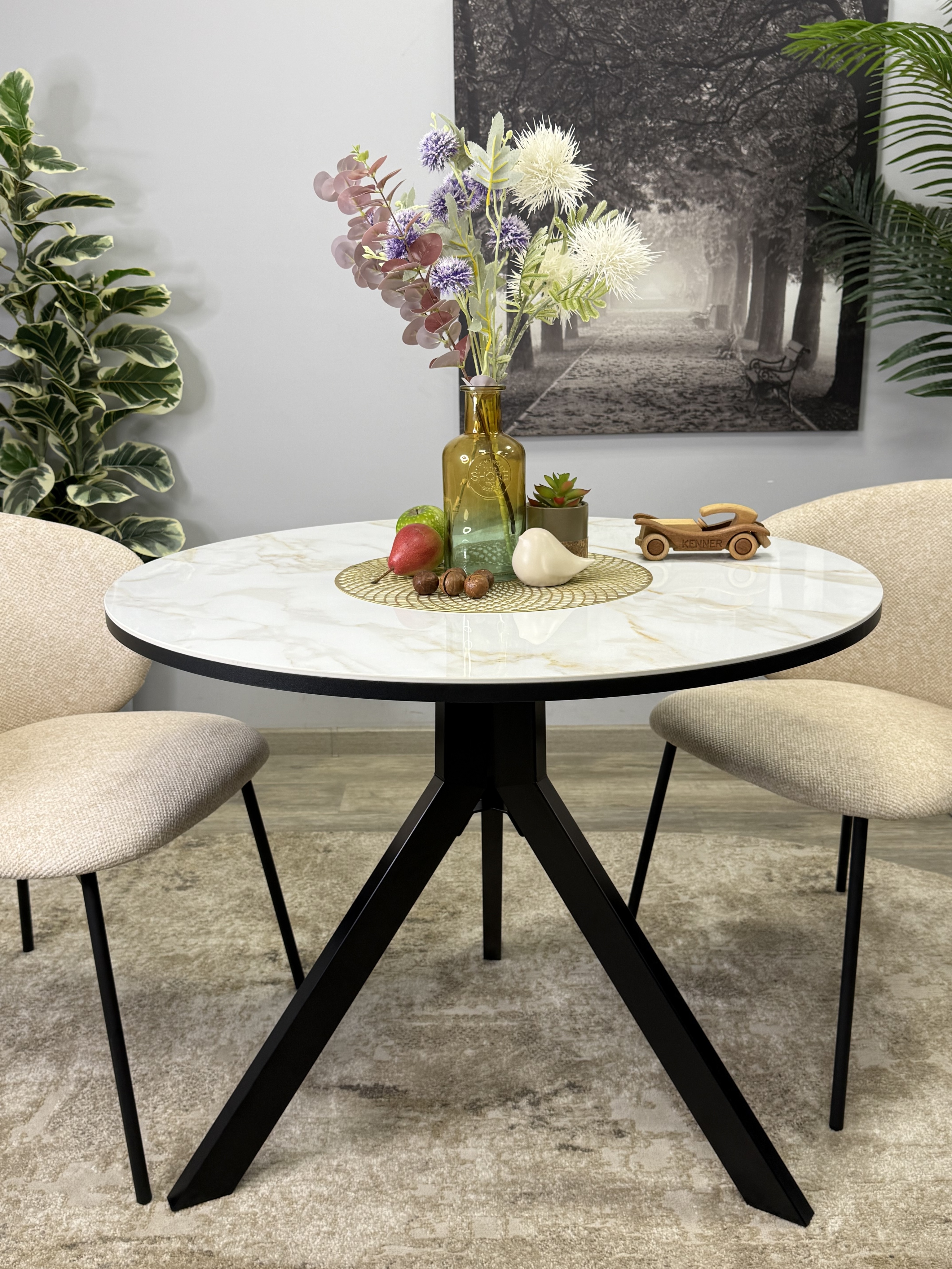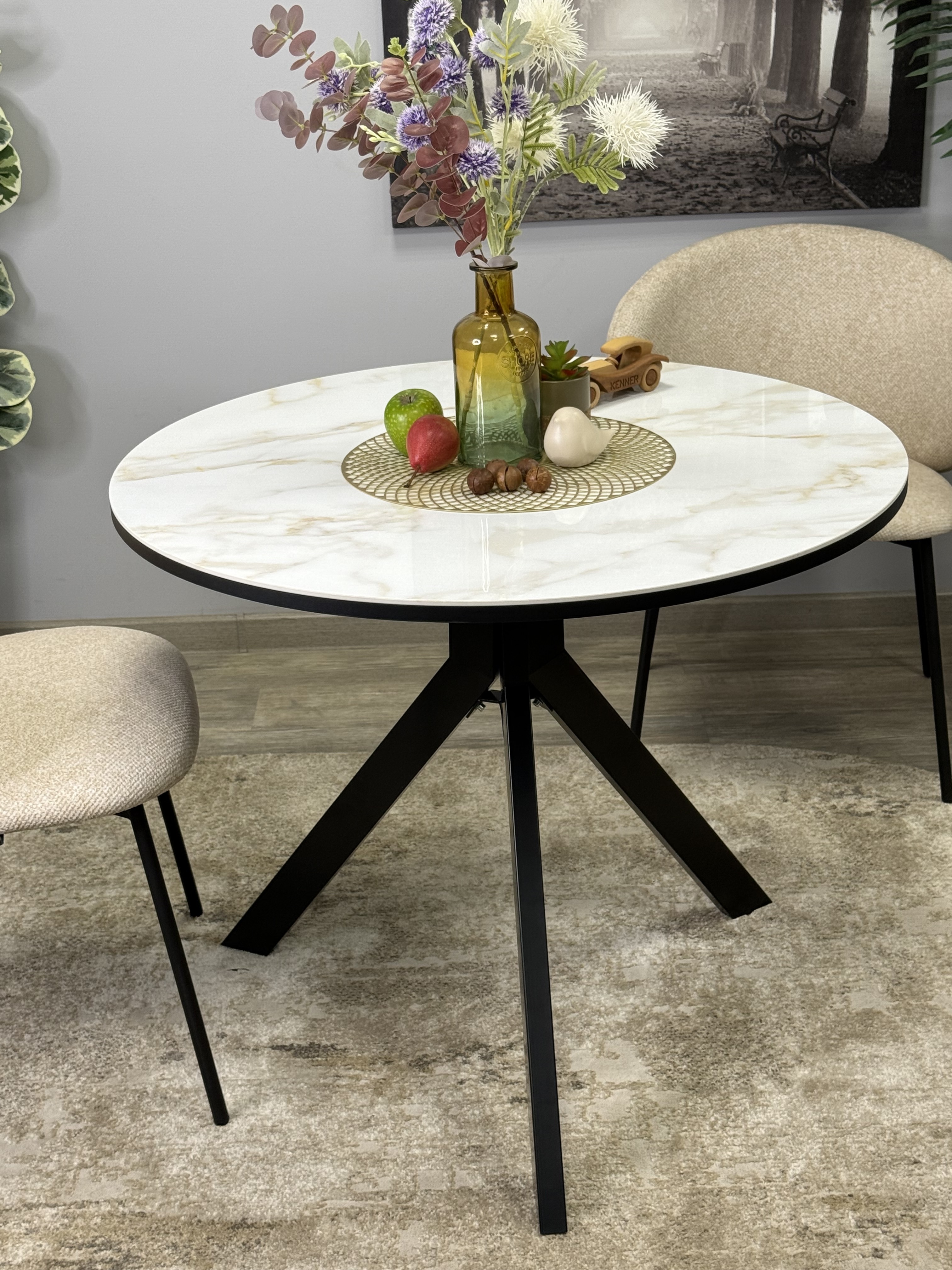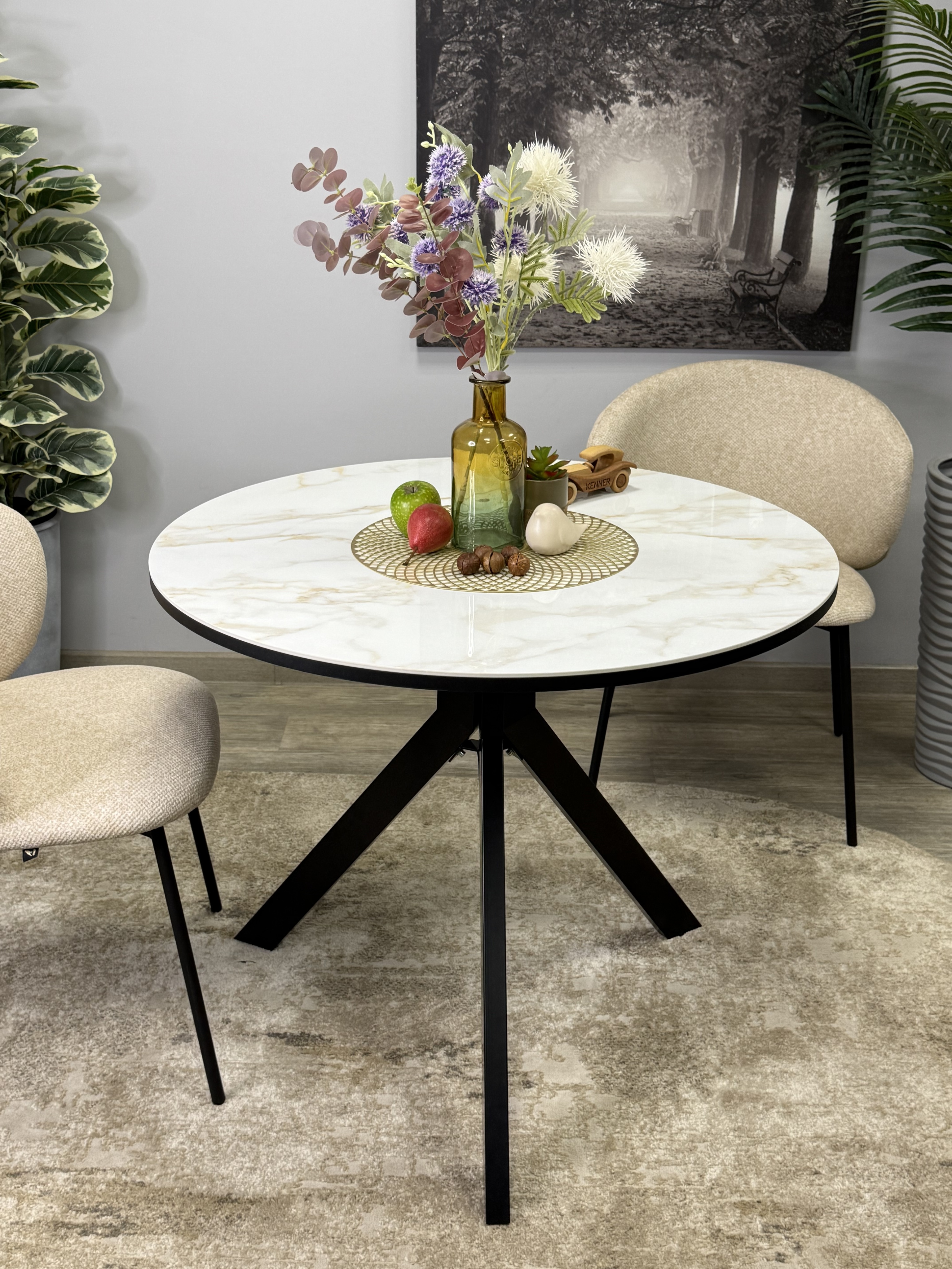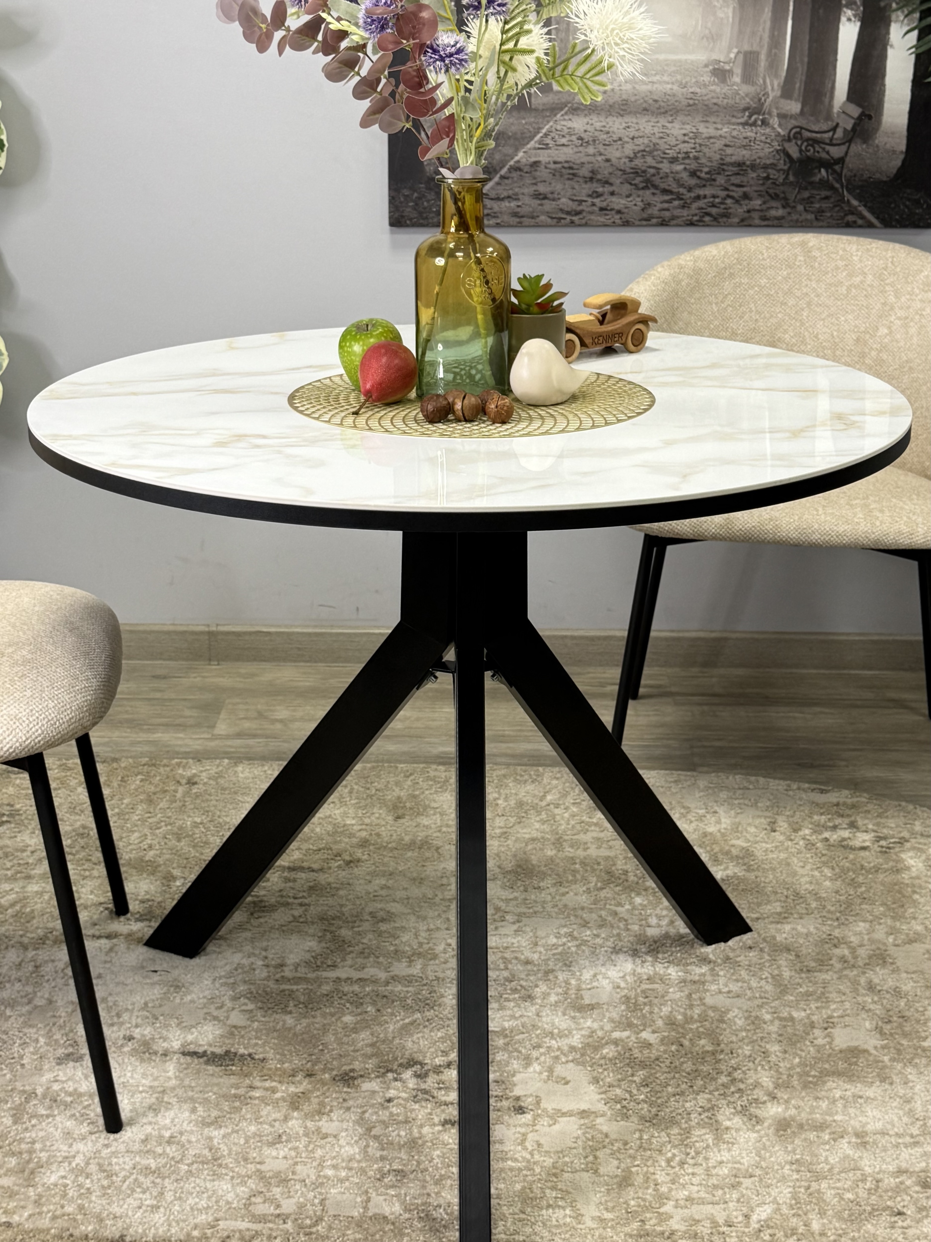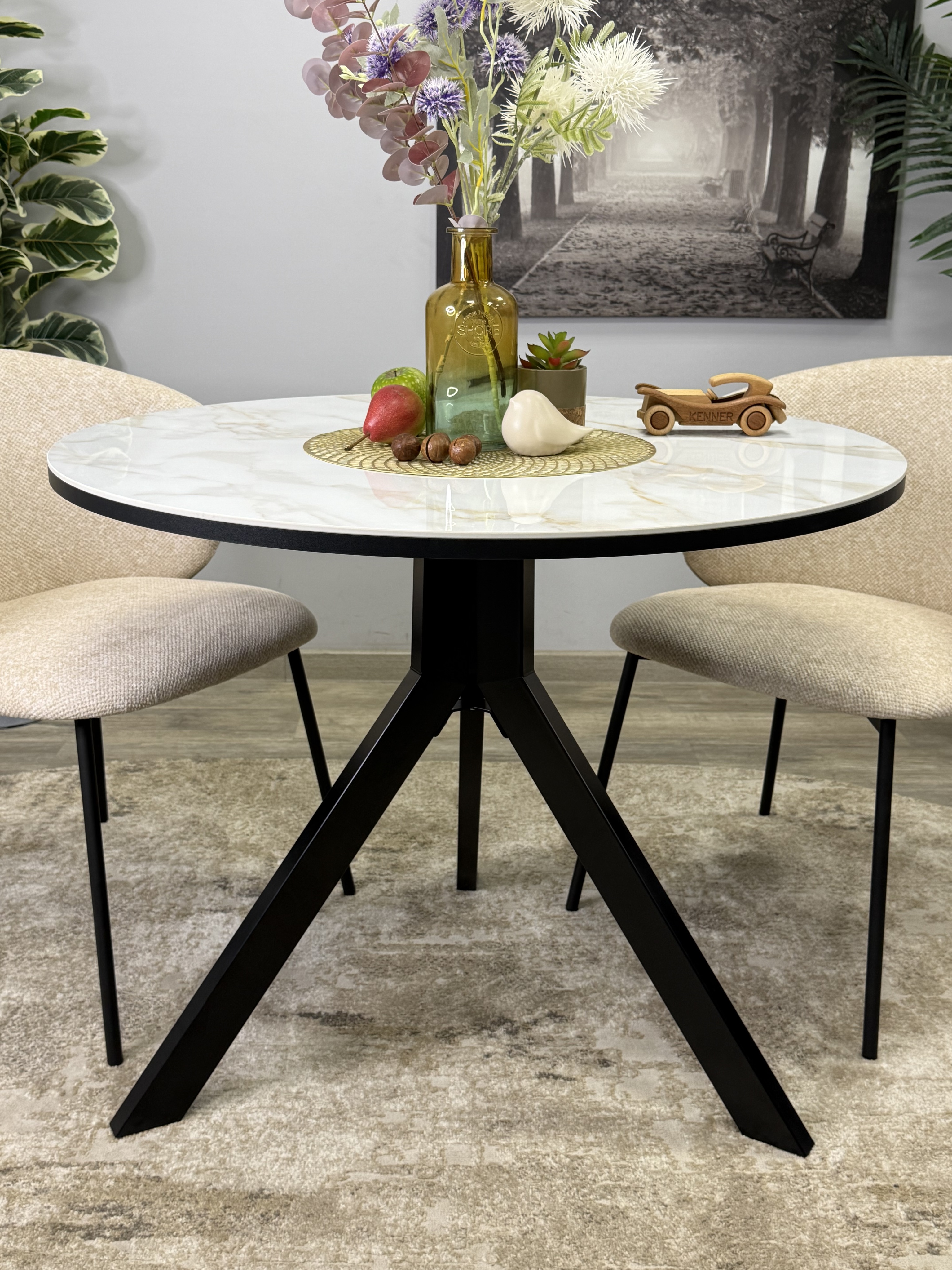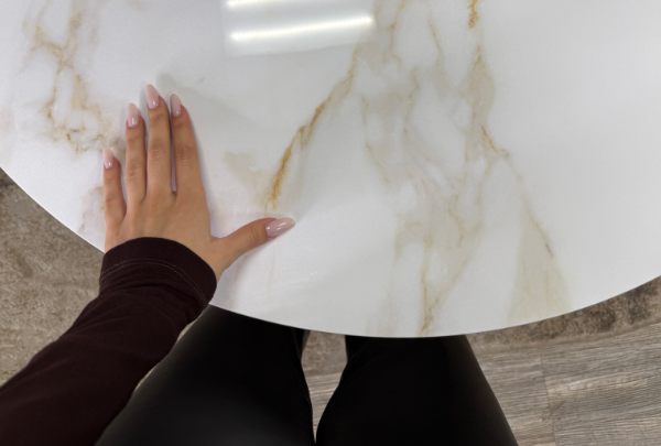 Круглый стол с керамикой защищает стол от любого внешнего воздействия, а ножки выполнены настолько эргономично, что к столу удобно сесть с любой стороны