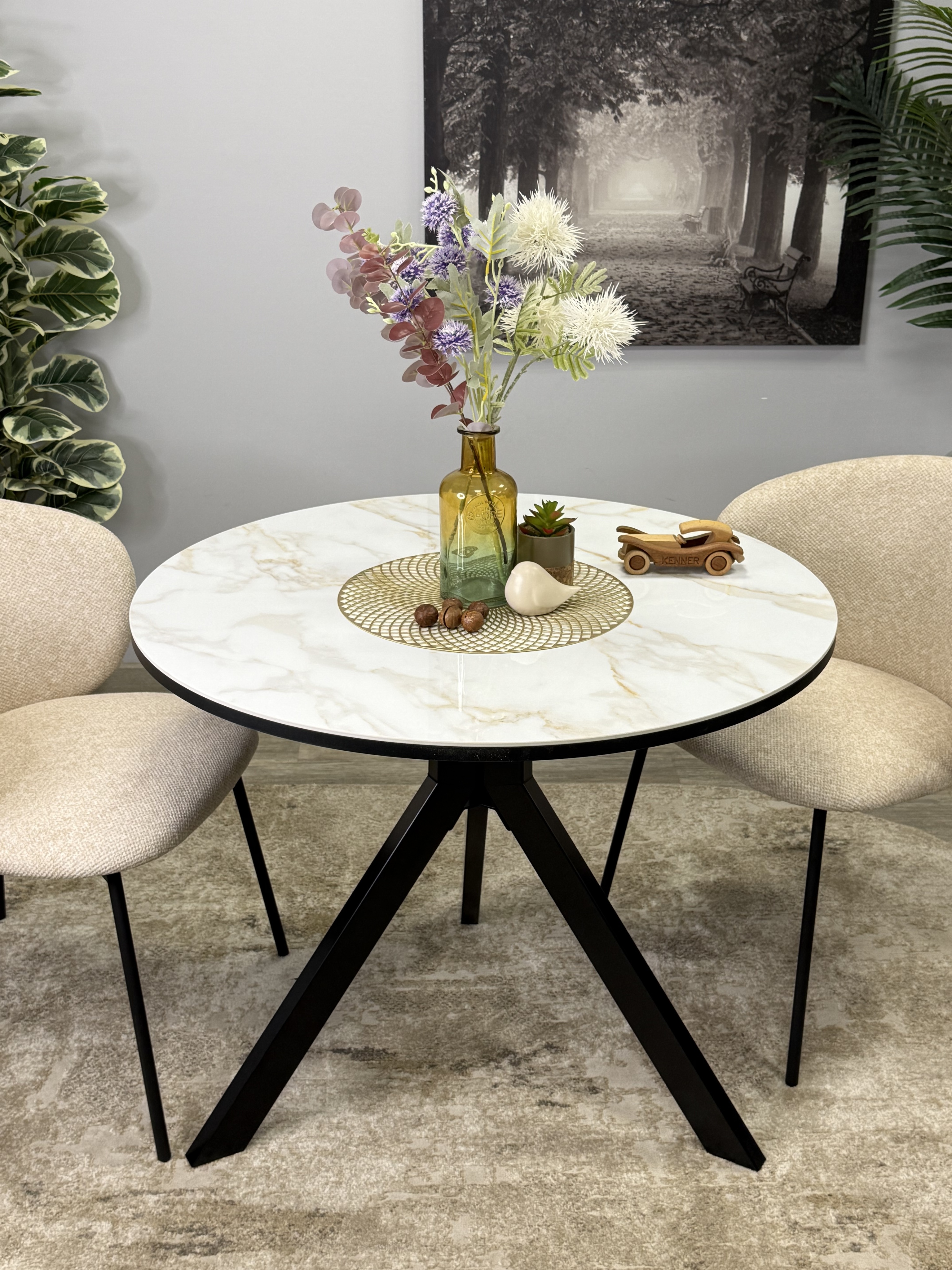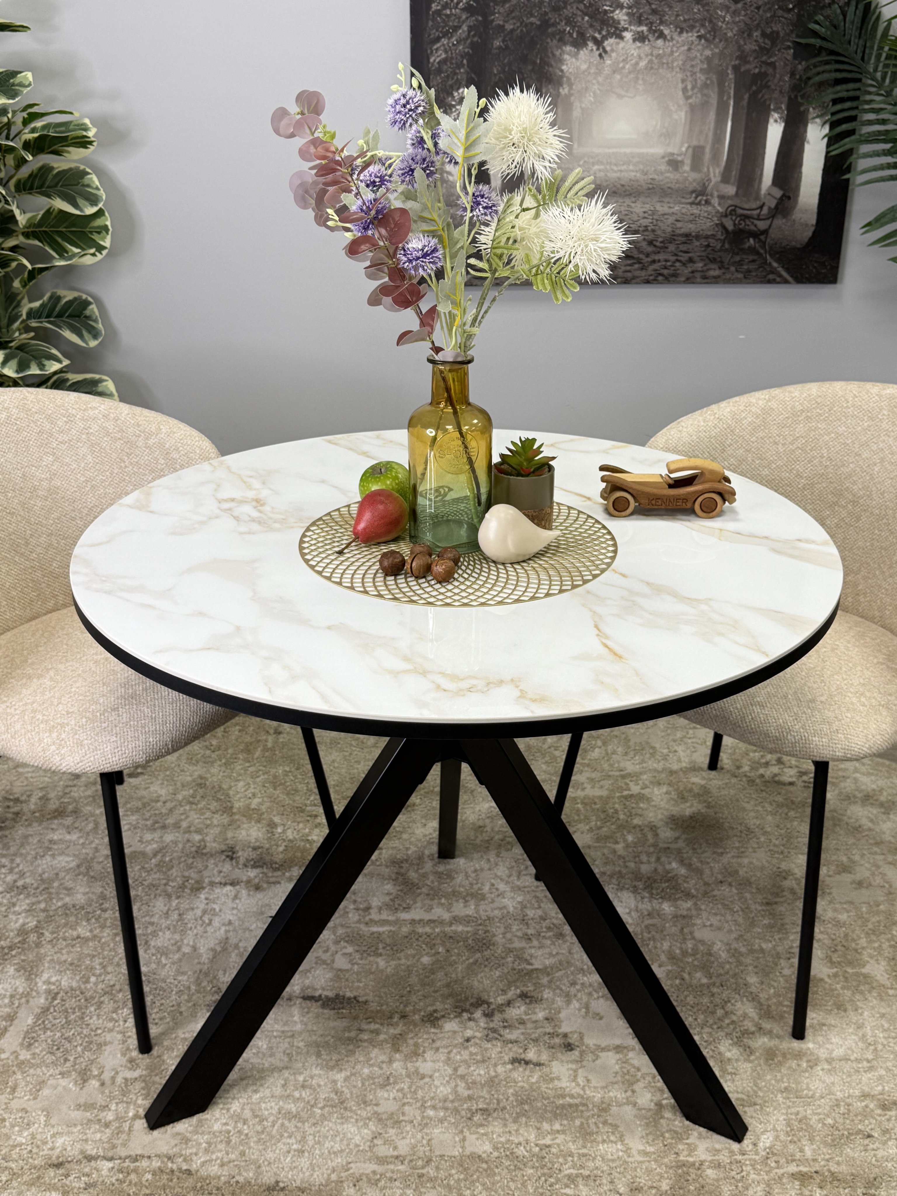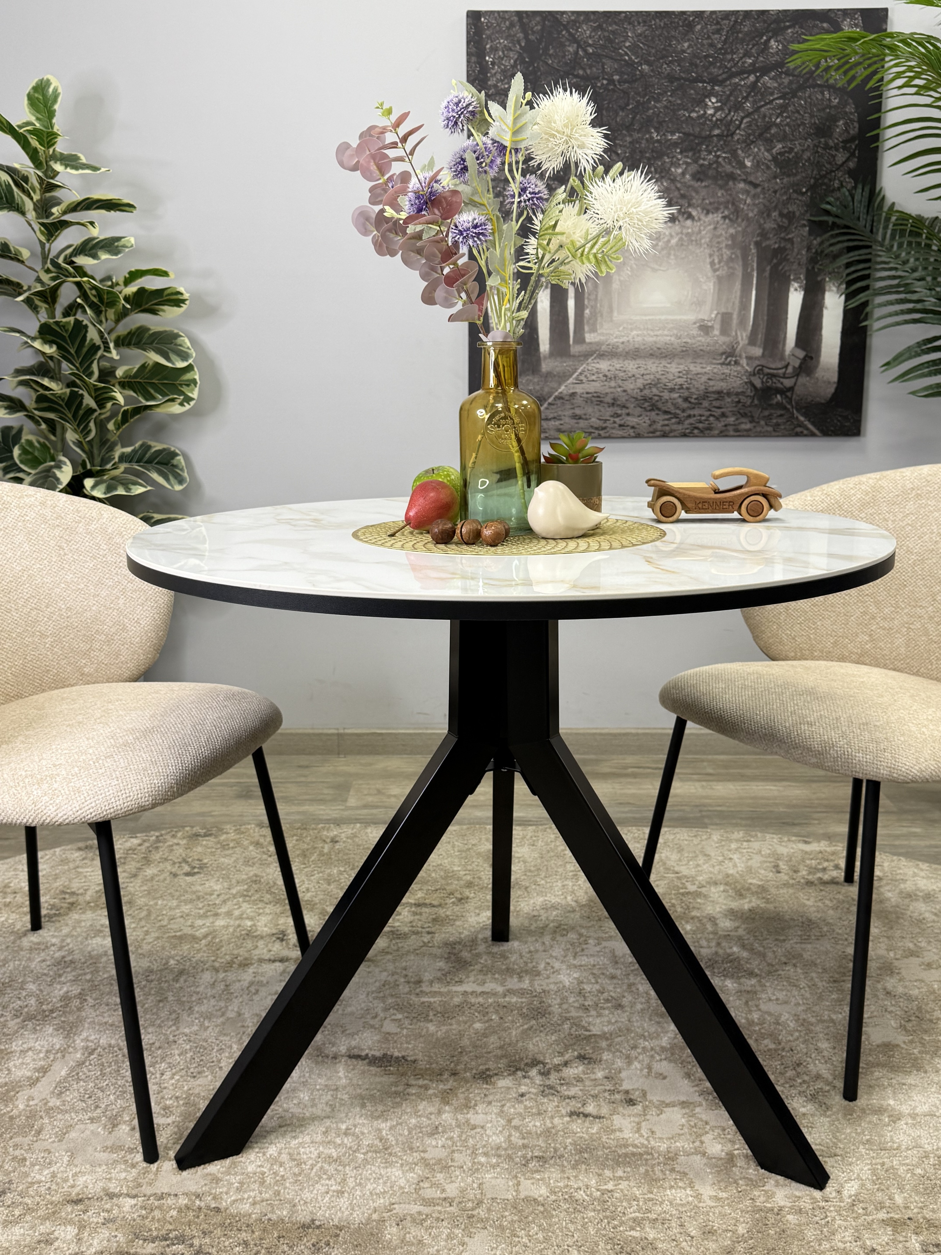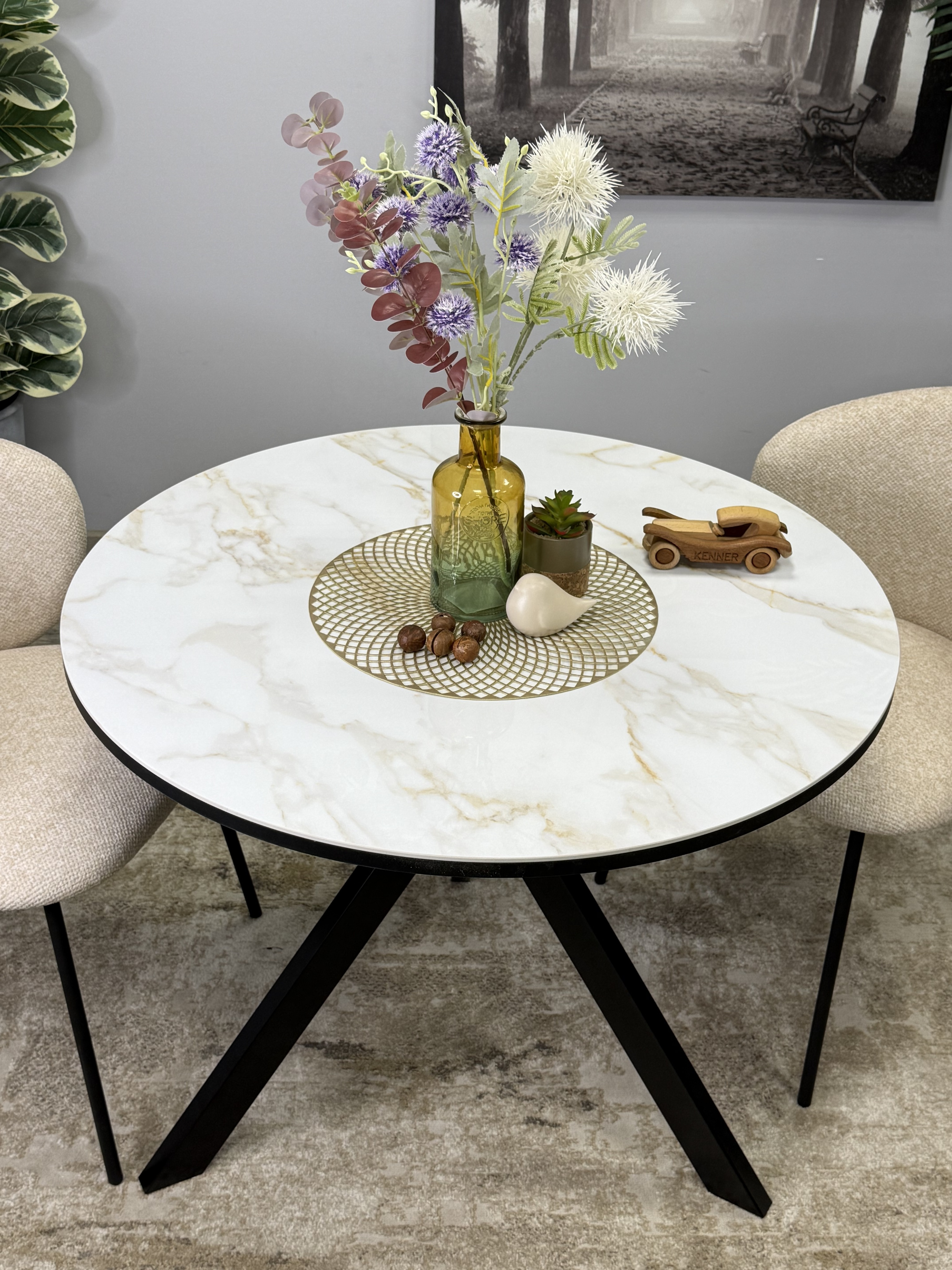 Круглый стол с керамикой защищает стол от любого внешнего воздействия, а ножки выполнены настолько эргономично, что к столу удобно сесть с любой стороны