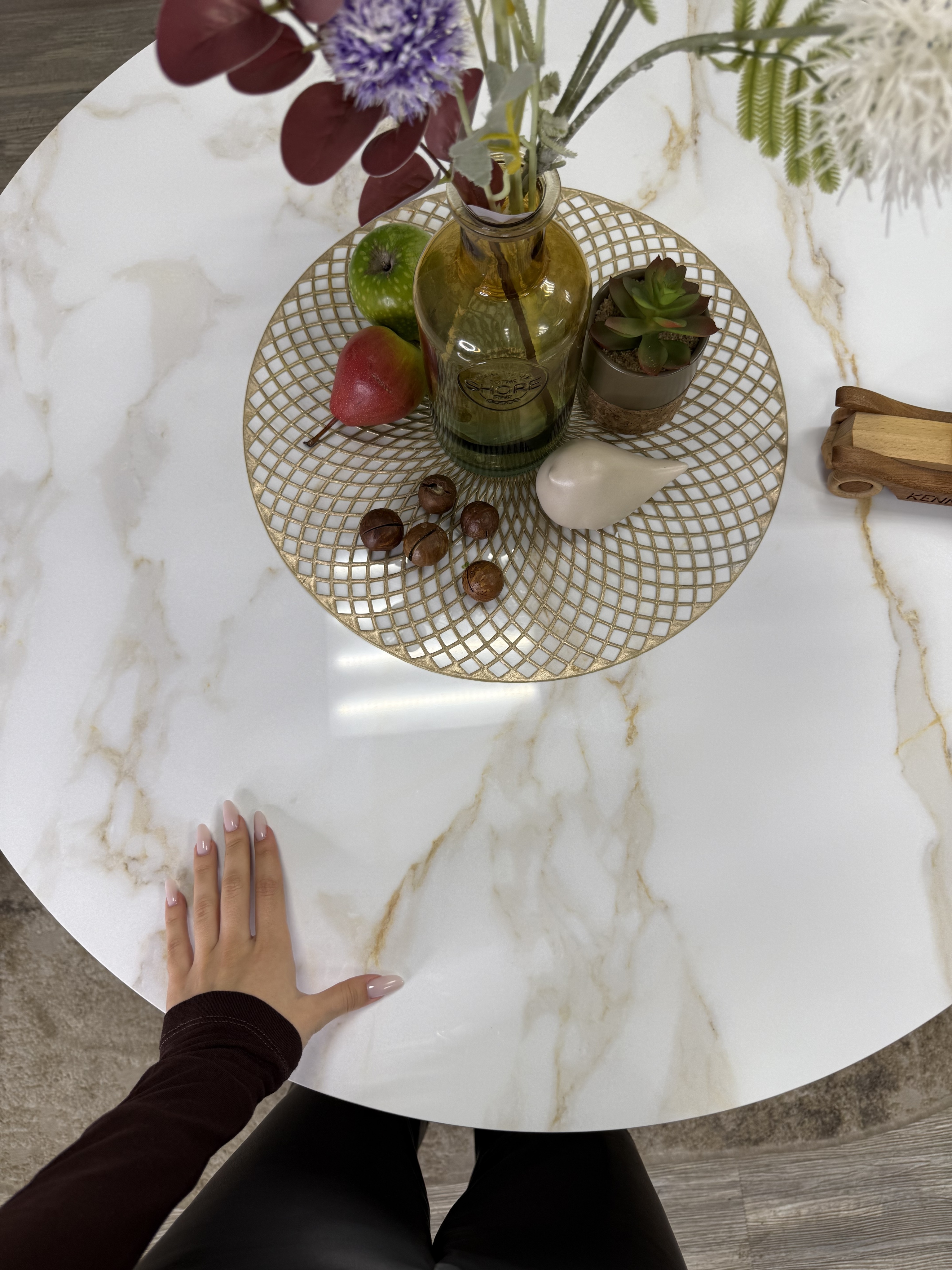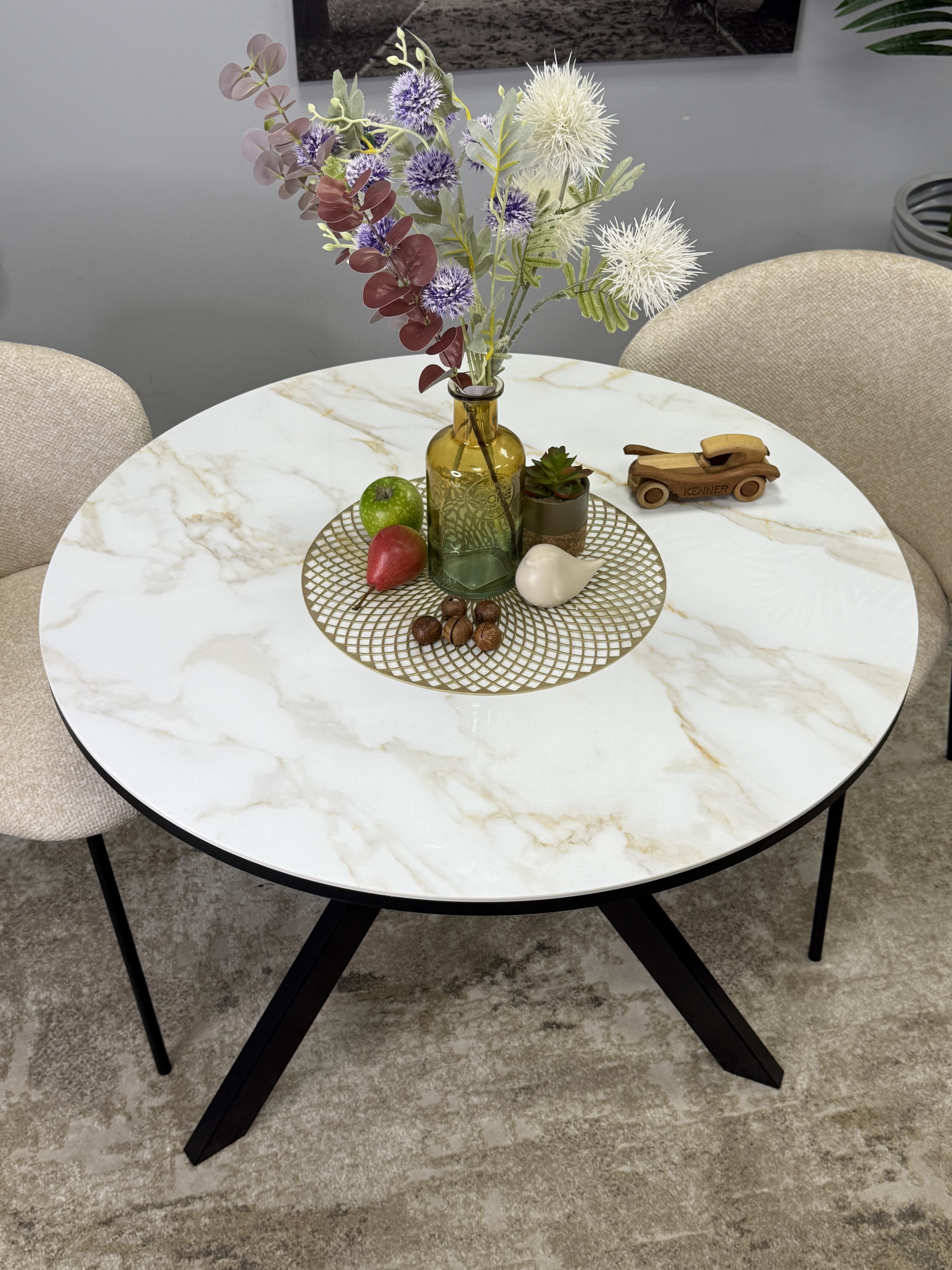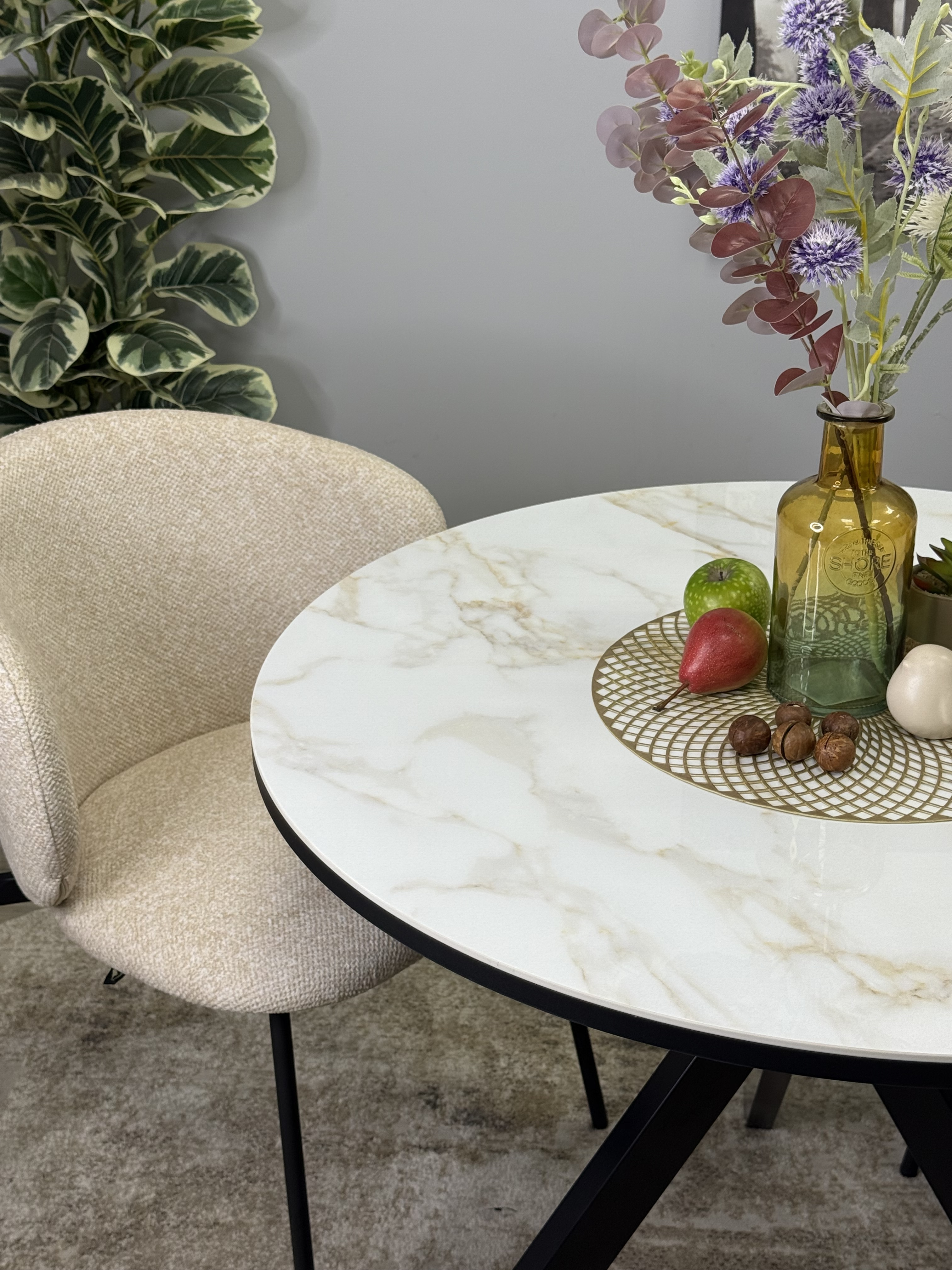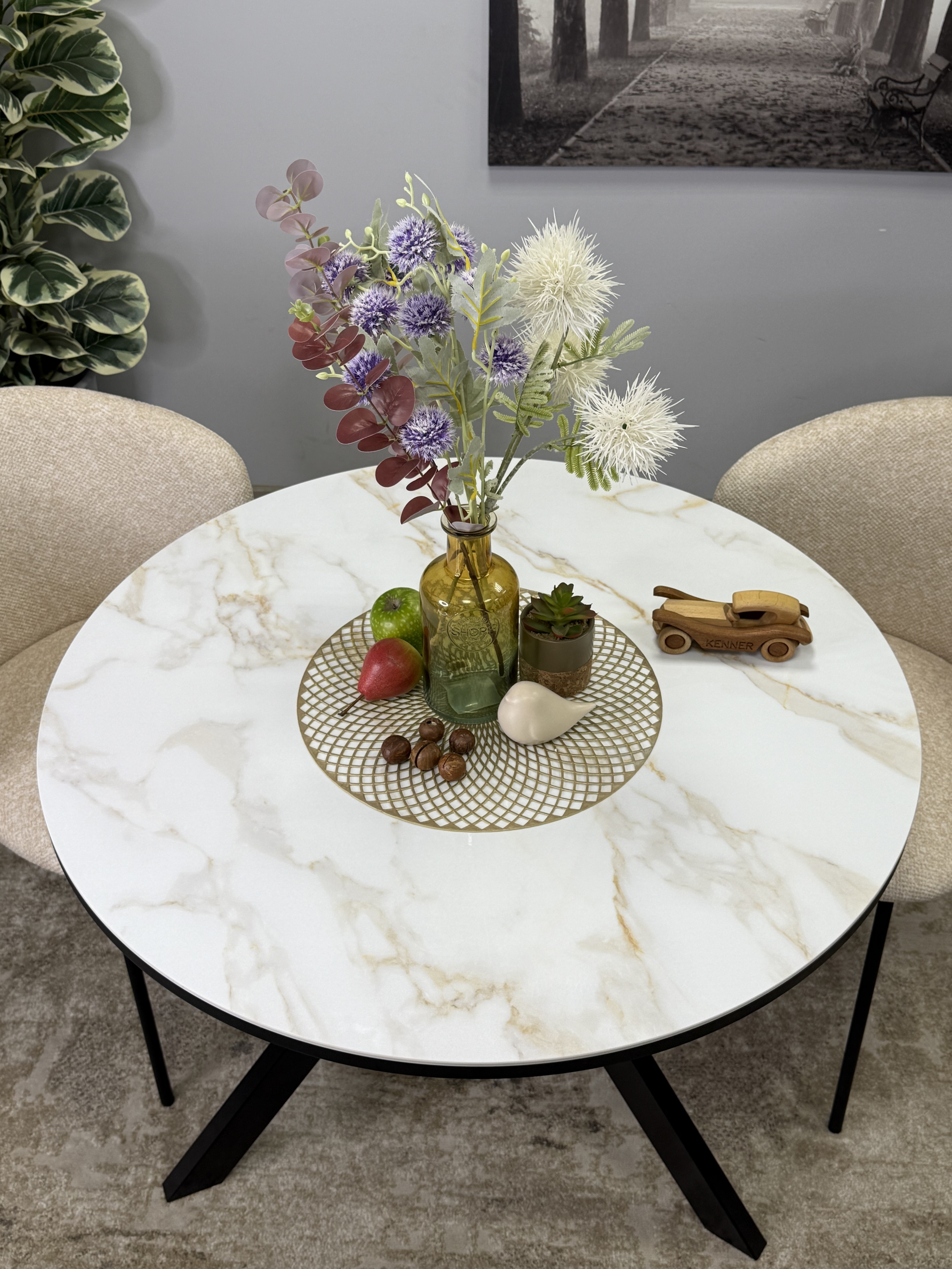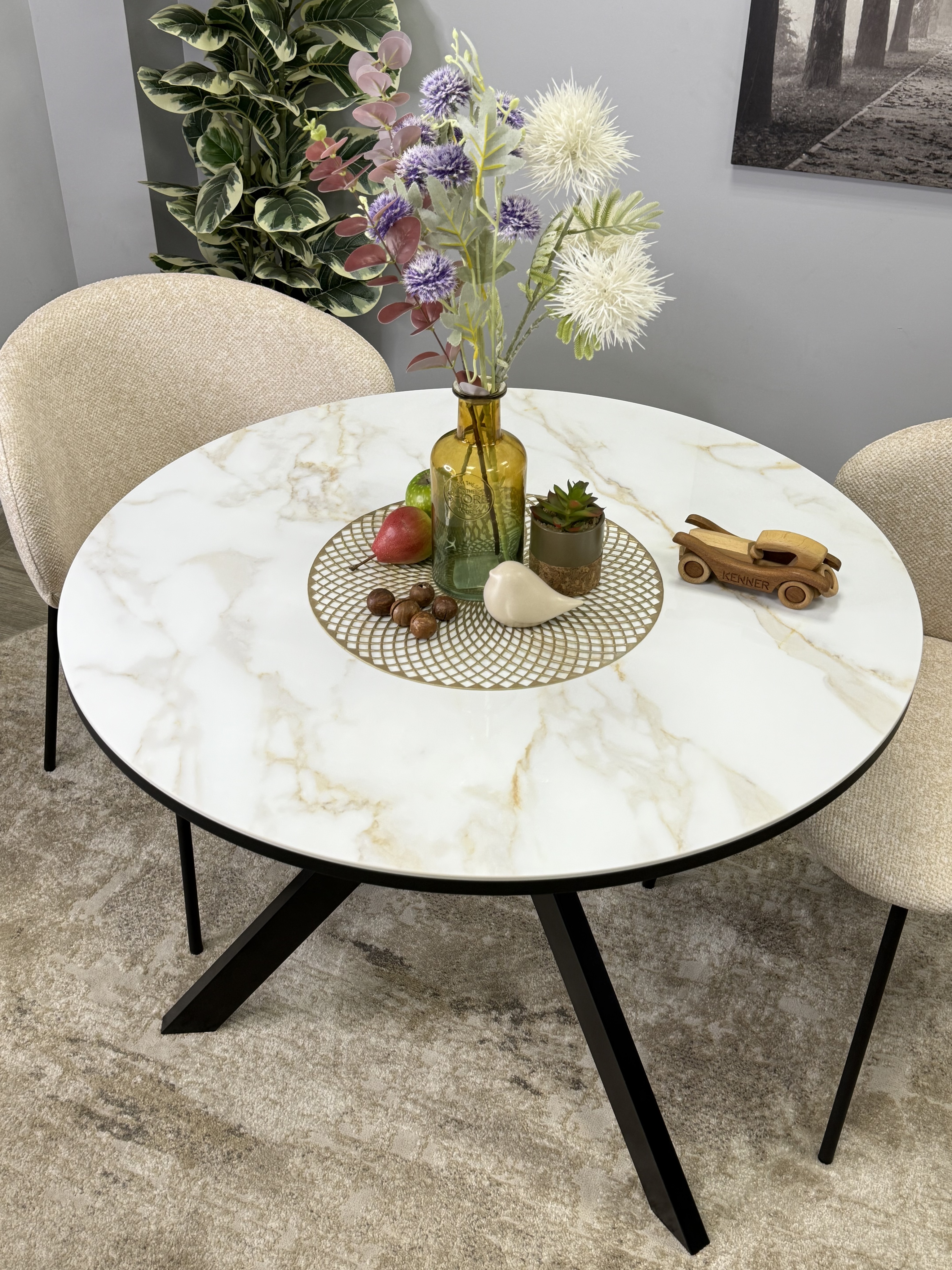 Круглый стол с керамикой защищает стол от любого внешнего воздействия, а ножки выполнены настолько эргономично, что к столу удобно сесть с любой стороны
