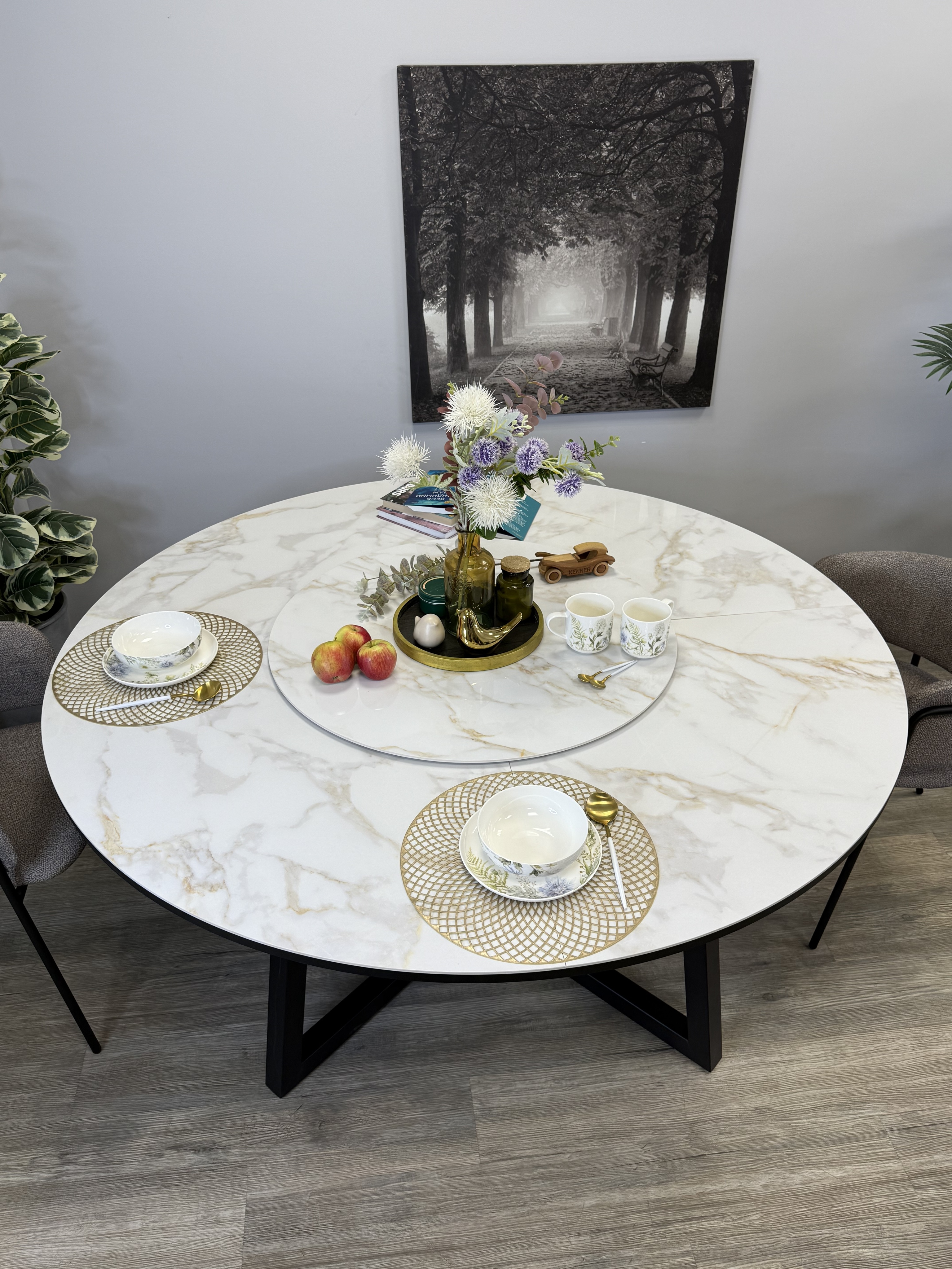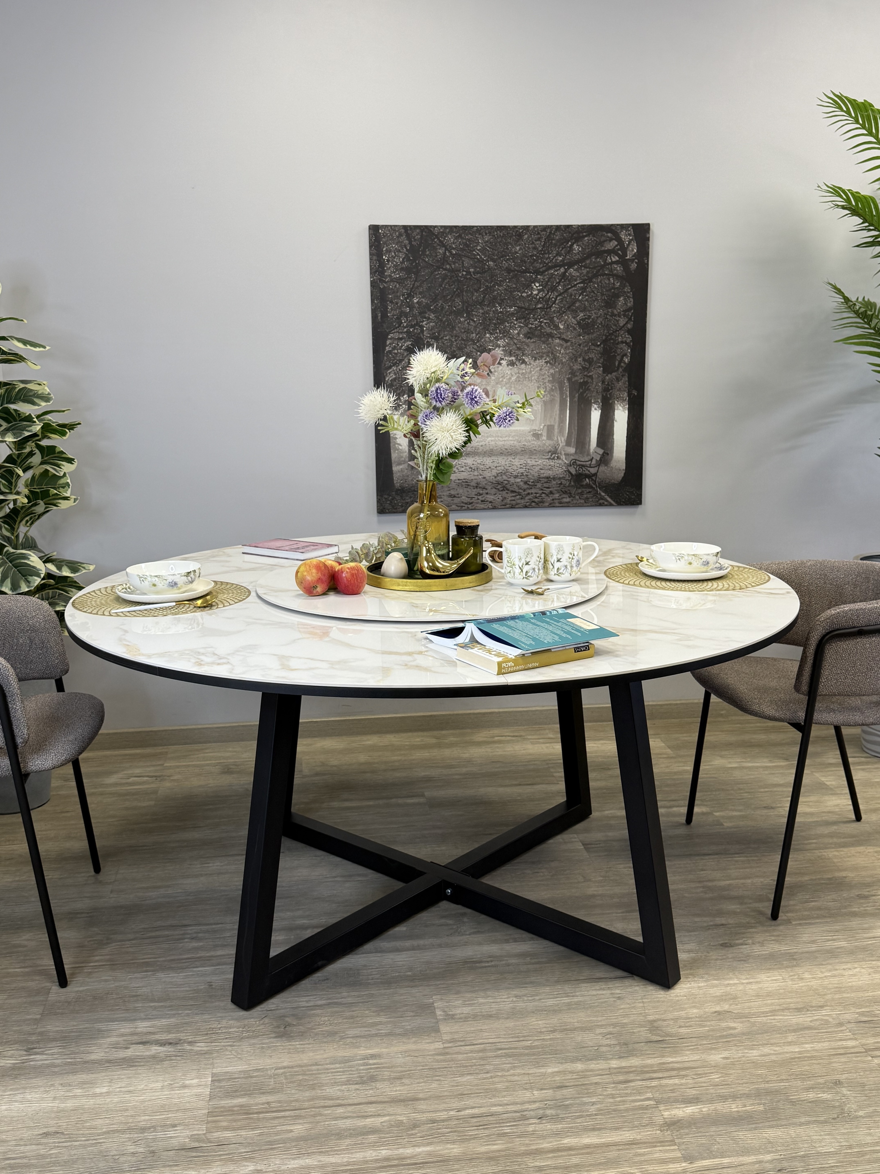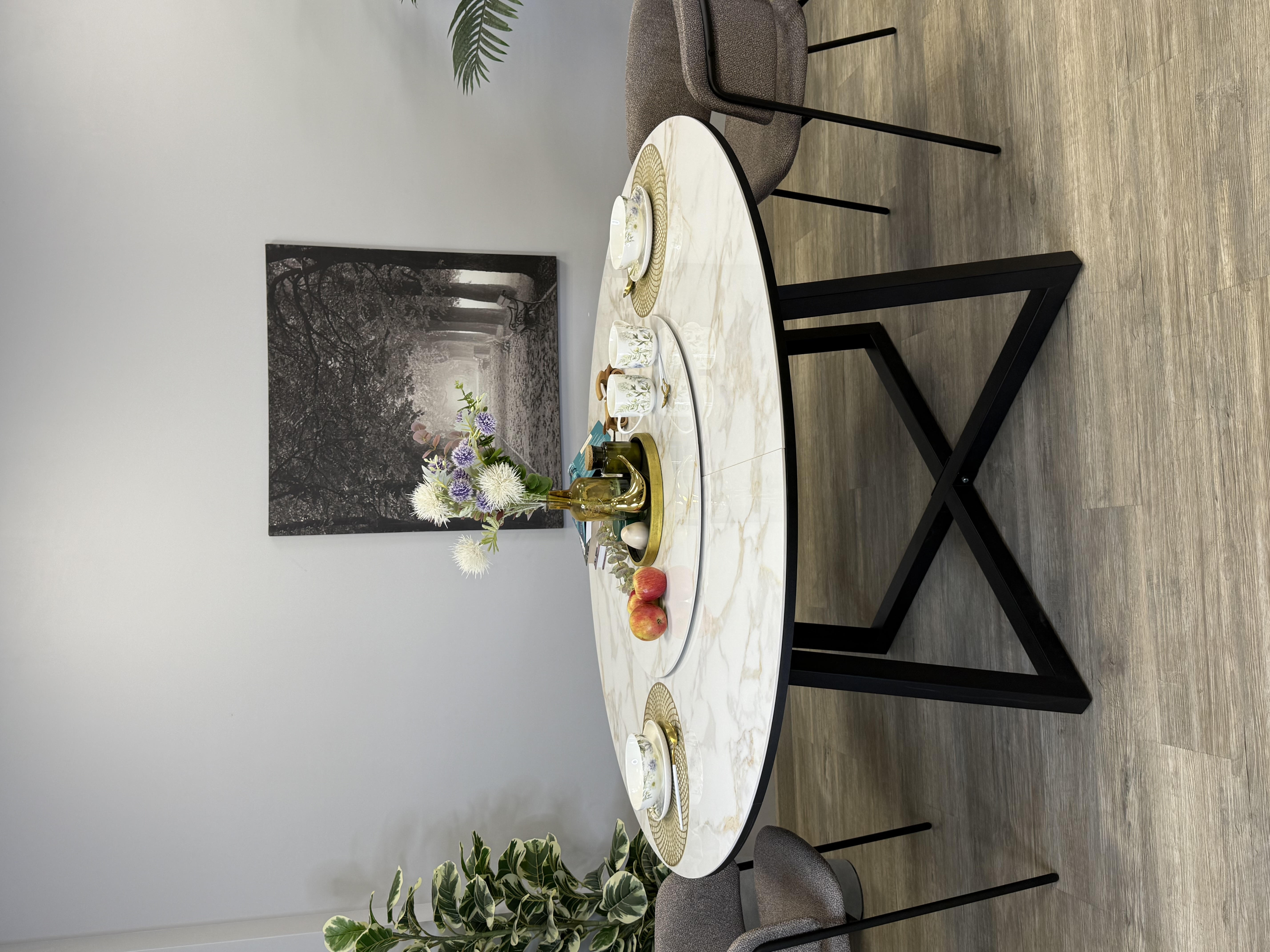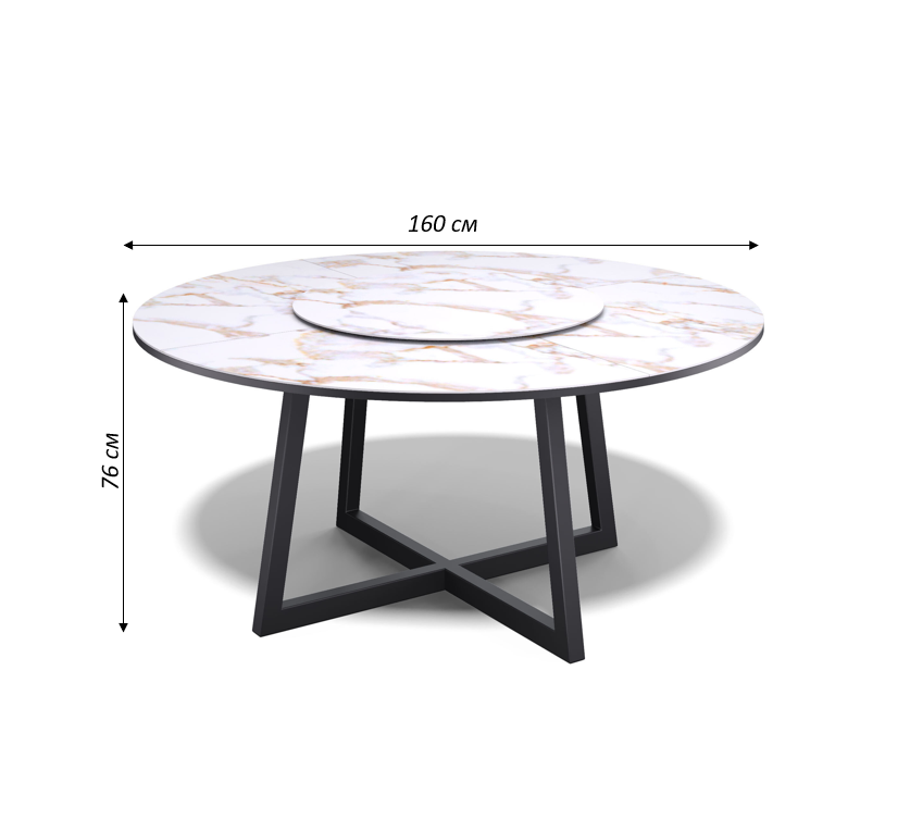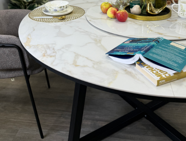 Круглый стол с уникальным механизмом поворотного центра стола, сделанный с керамикой которая защищает стол от любого внешнего воздействия, а опоры выполнены крестообразной формой, что к столу удобно сесть с любой стороны