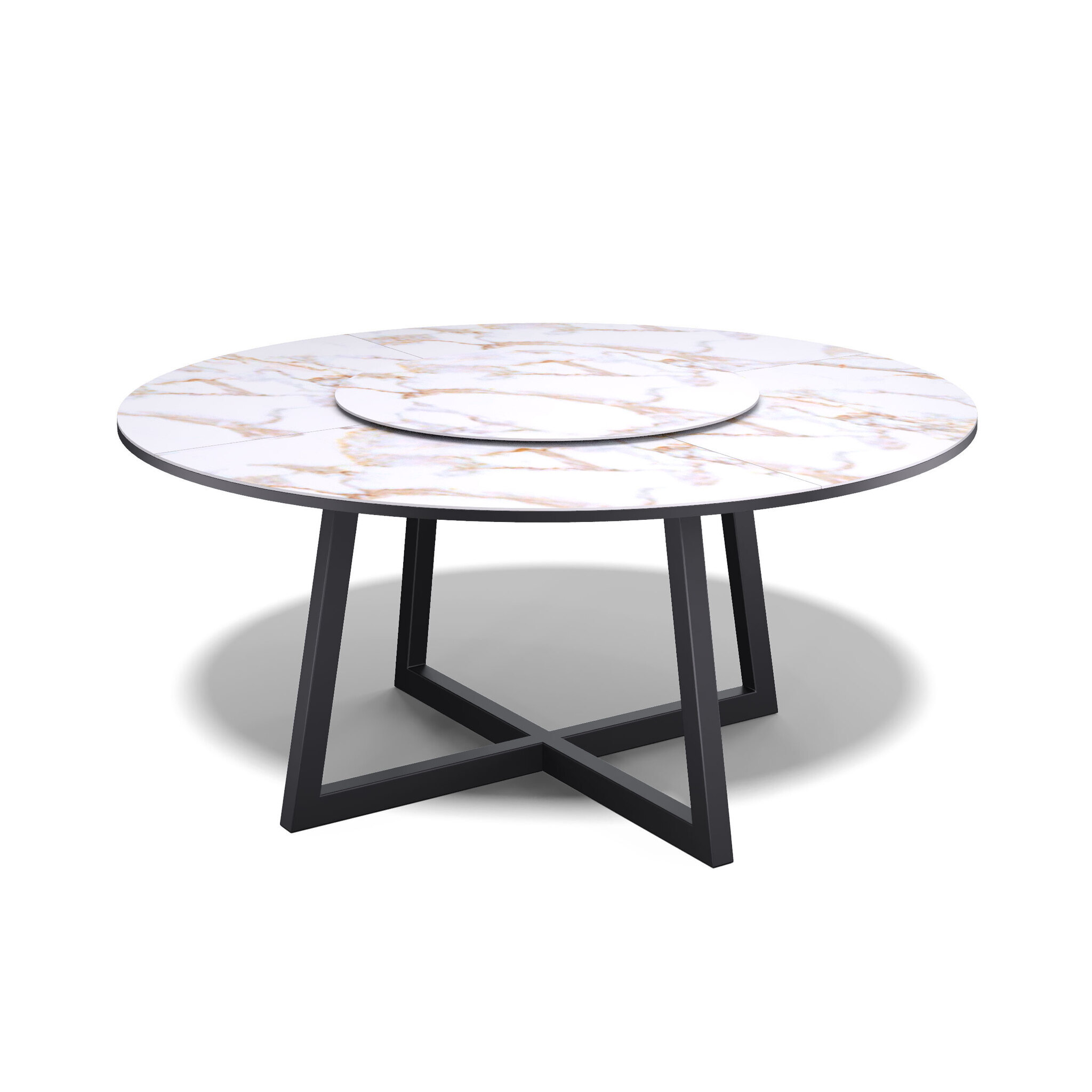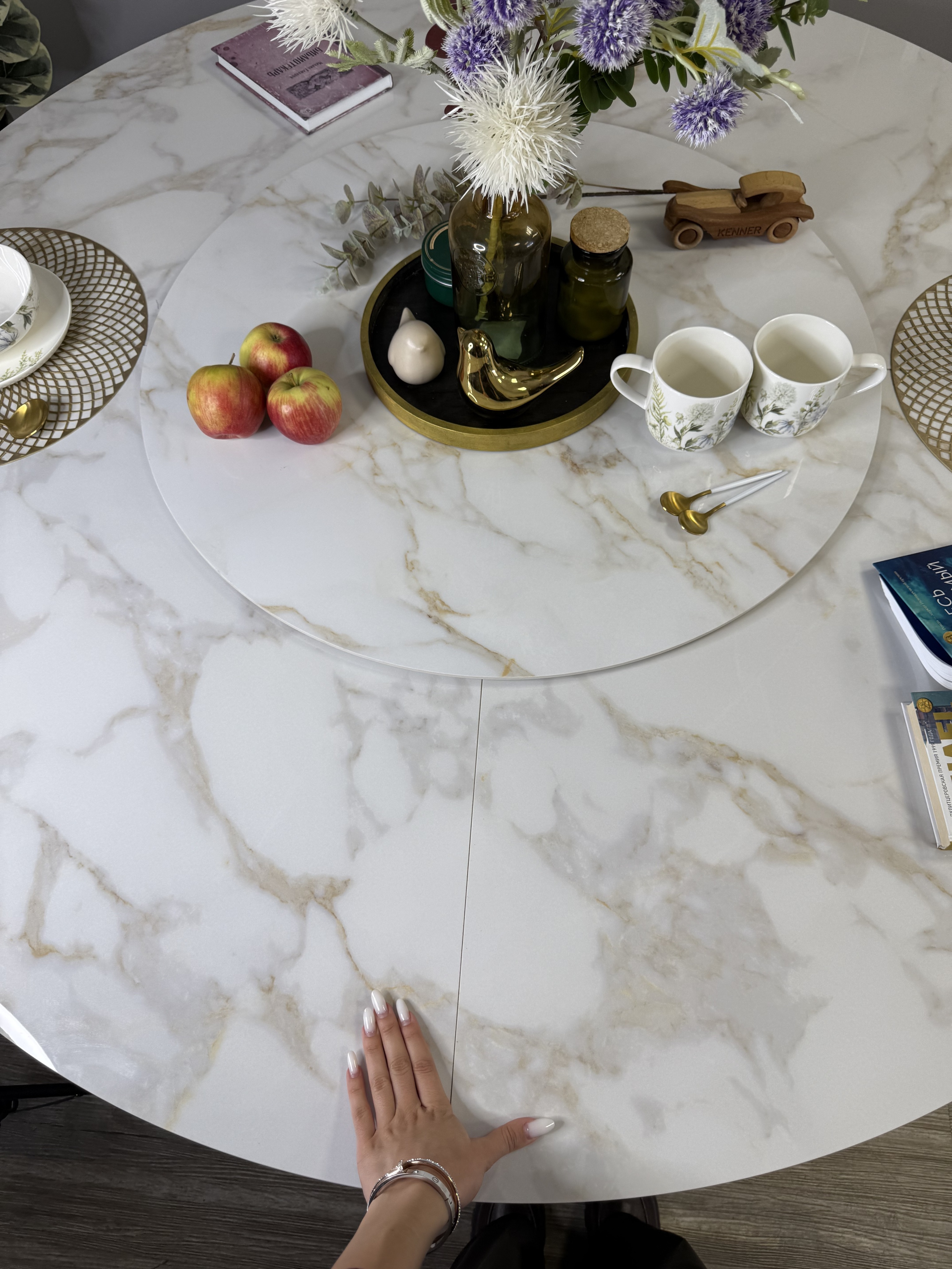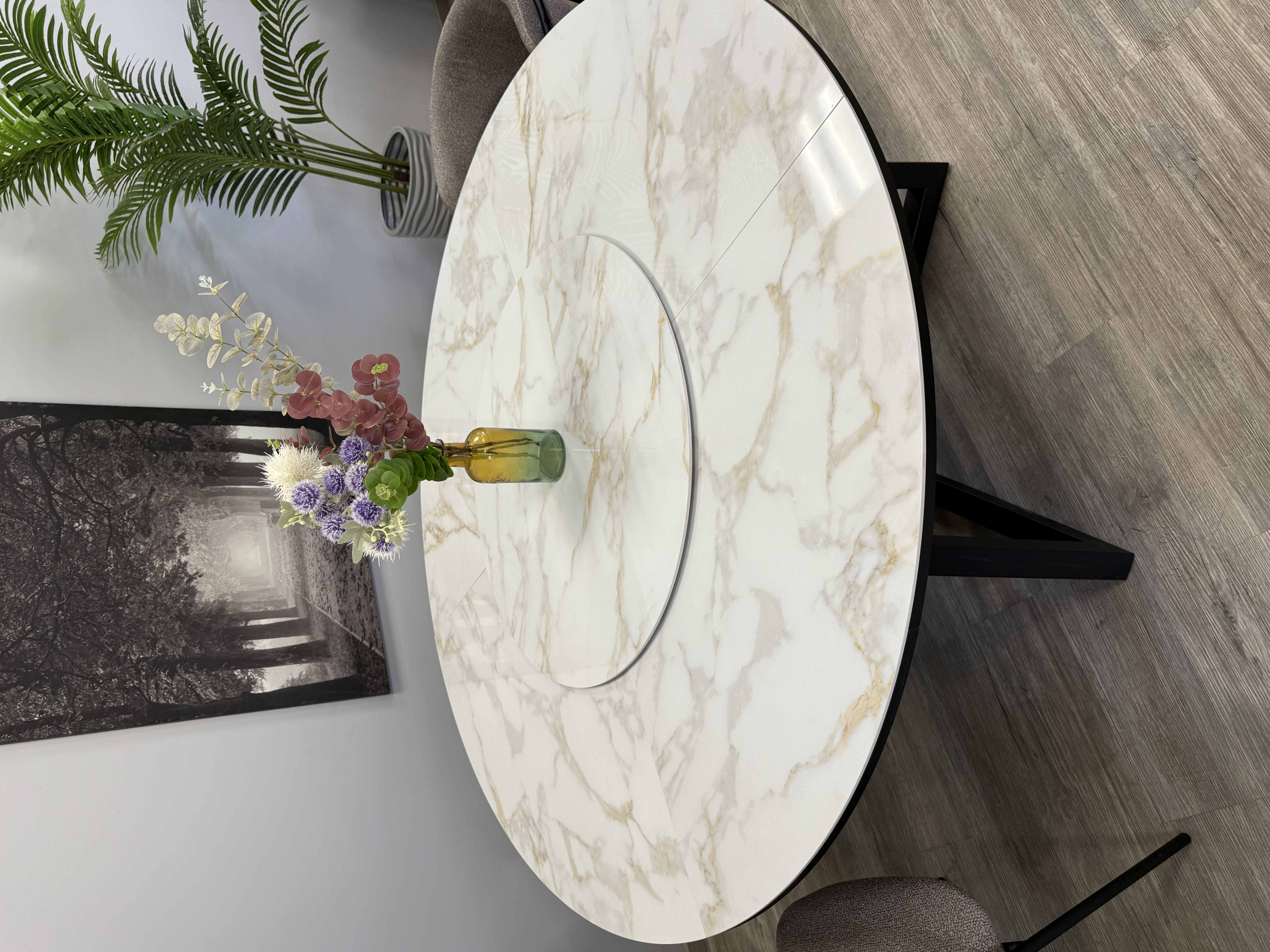 Круглый стол с уникальным механизмом поворотного центра стола, сделанный с керамикой которая защищает стол от любого внешнего воздействия, а опоры выполнены крестообразной формой, что к столу удобно сесть с любой стороны