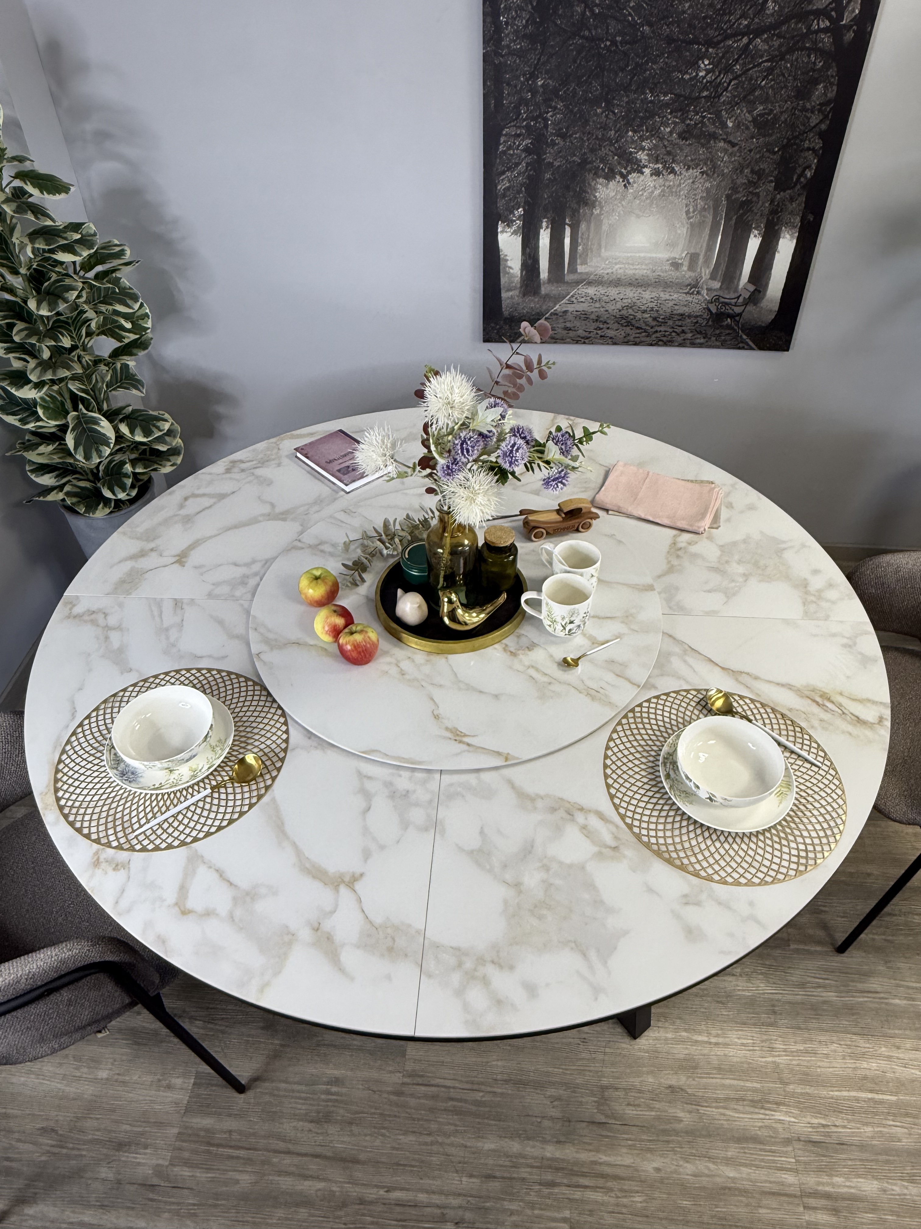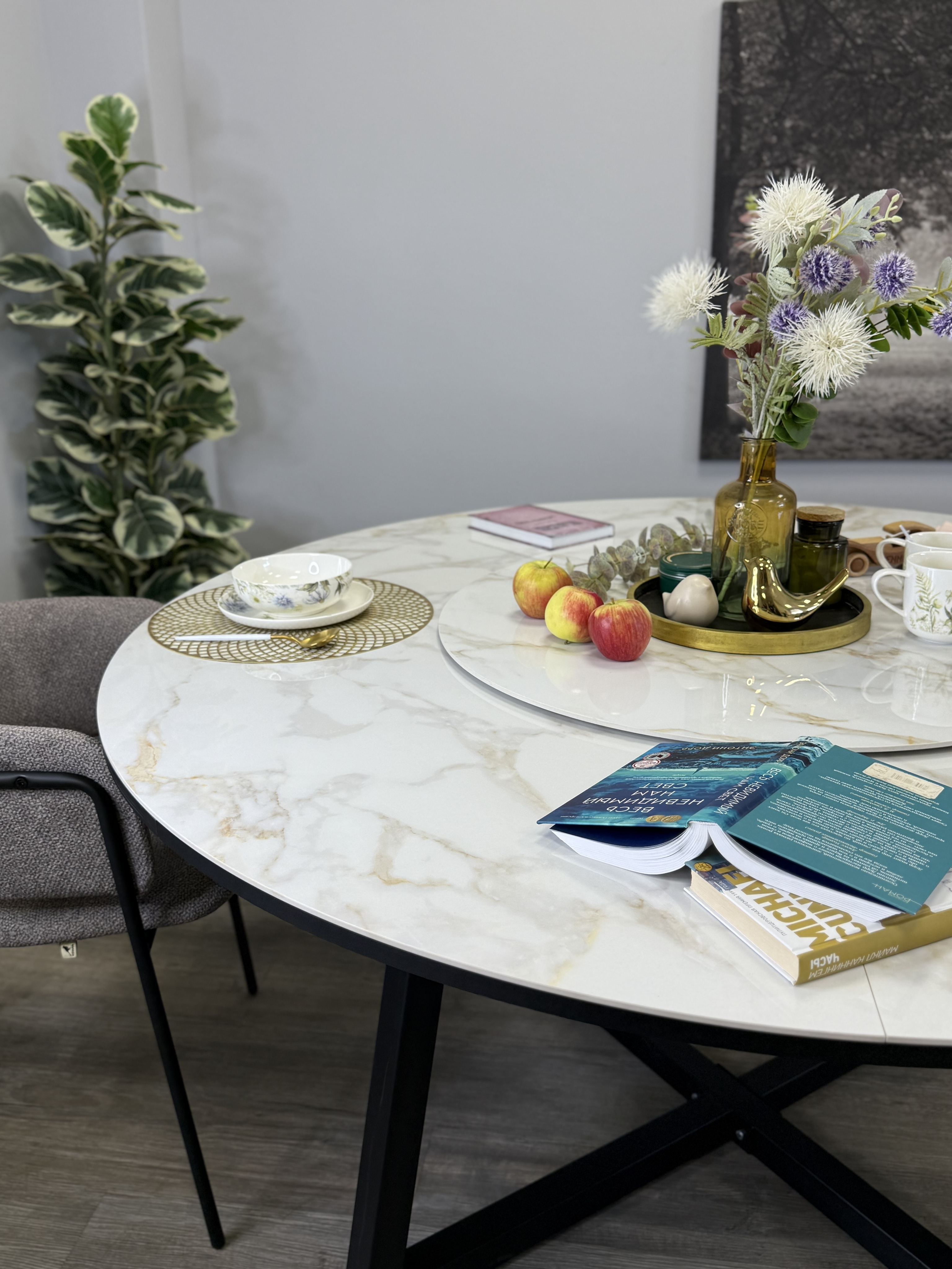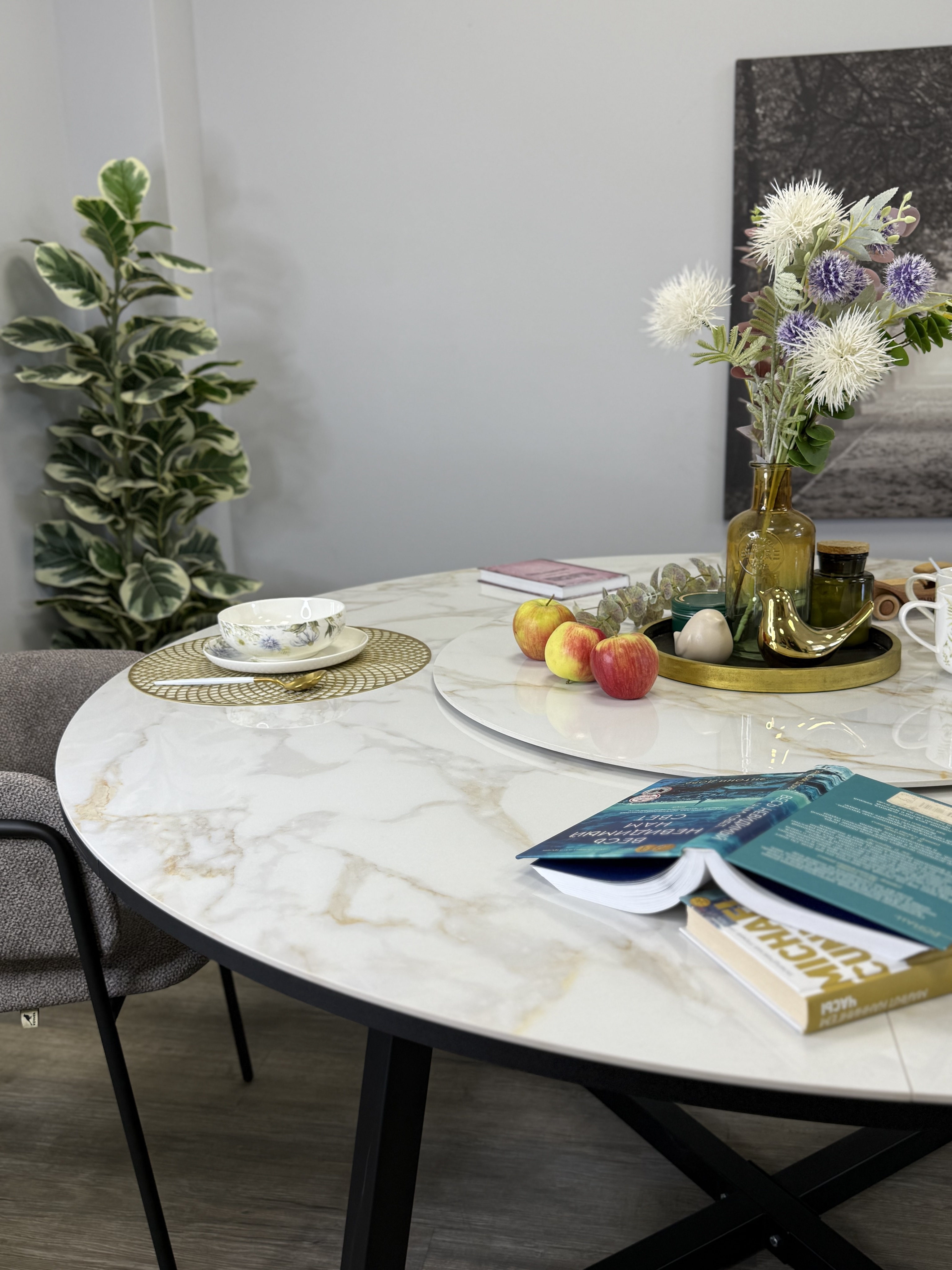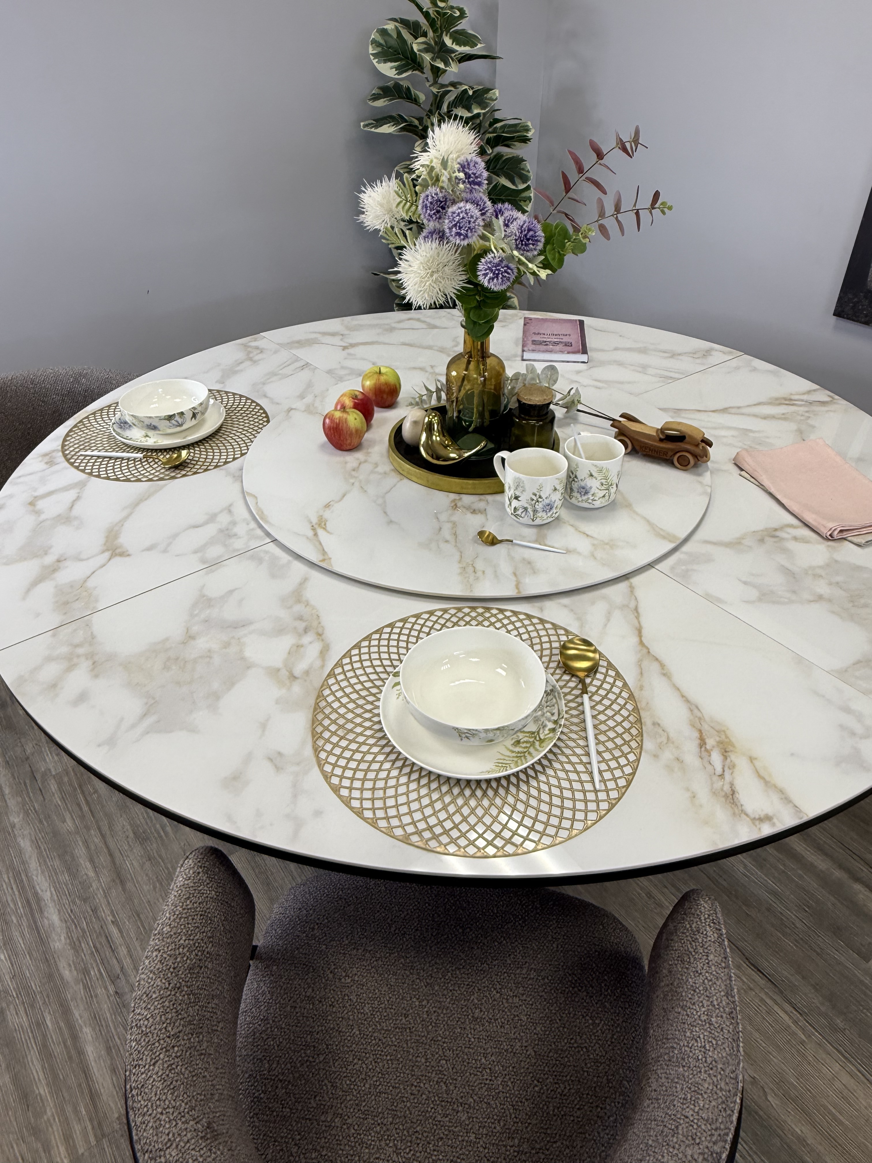 Круглый стол с уникальным механизмом поворотного центра стола, сделанный с керамикой которая защищает стол от любого внешнего воздействия, а опоры выполнены крестообразной формой, что к столу удобно сесть с любой стороны