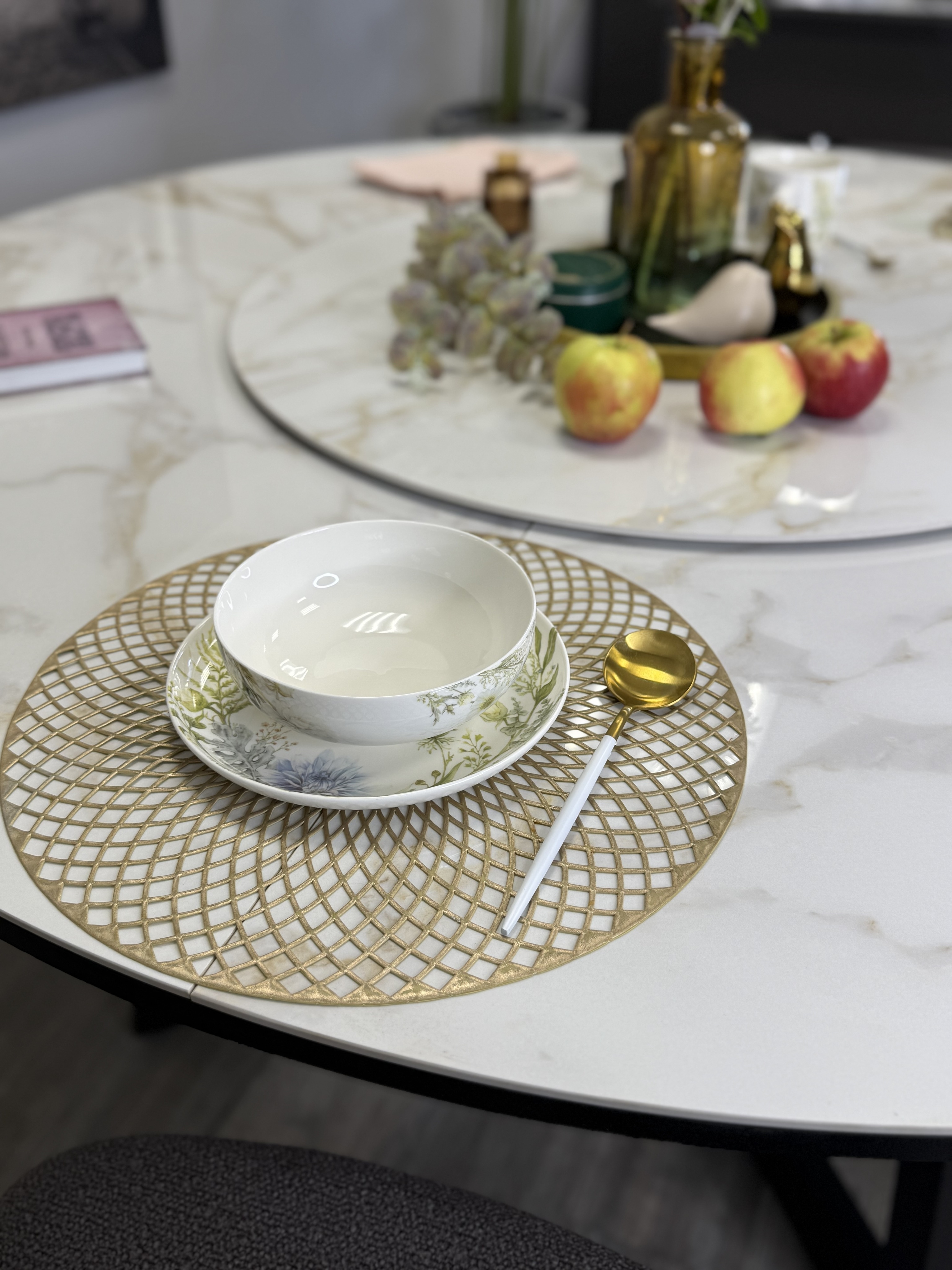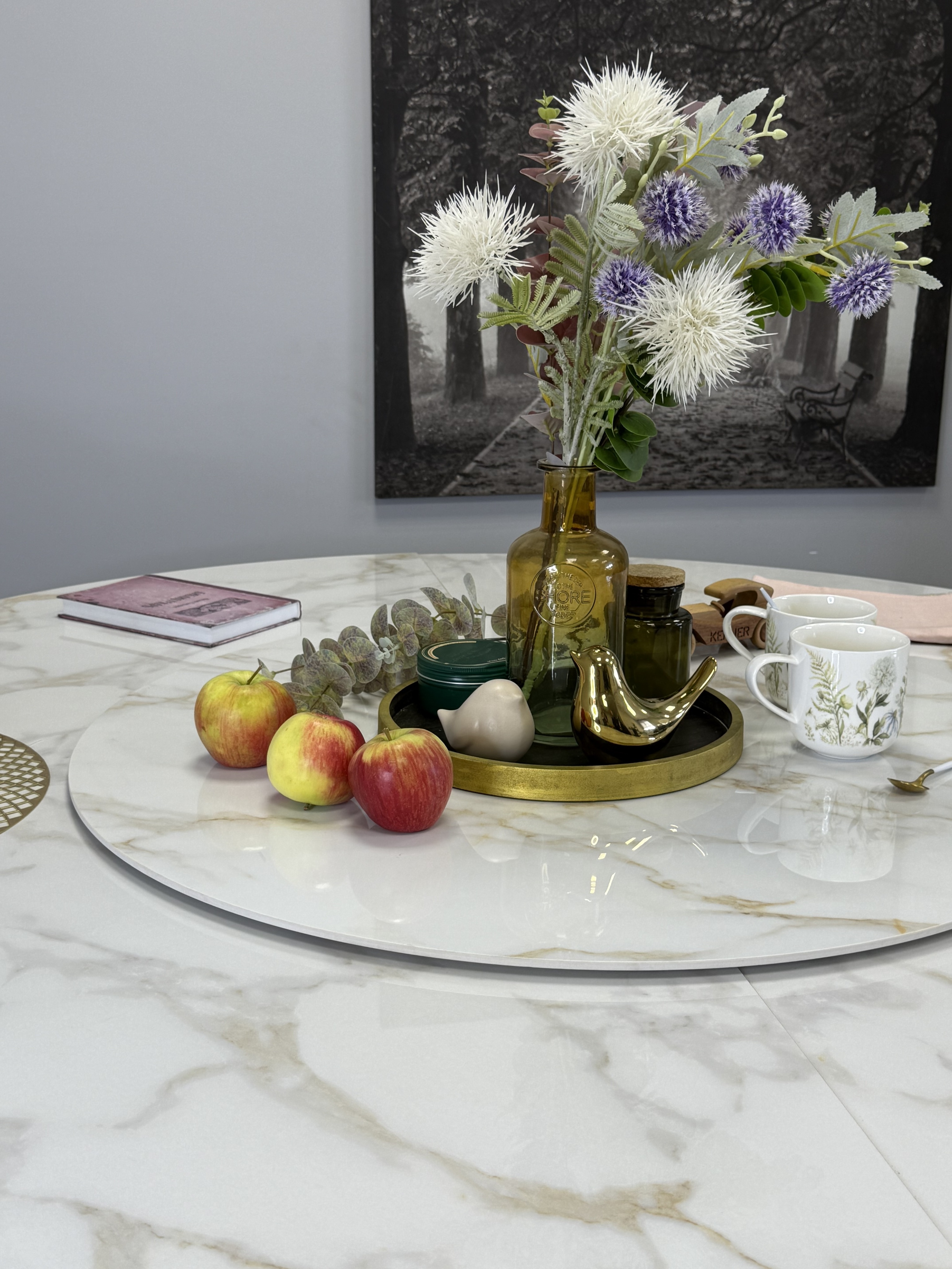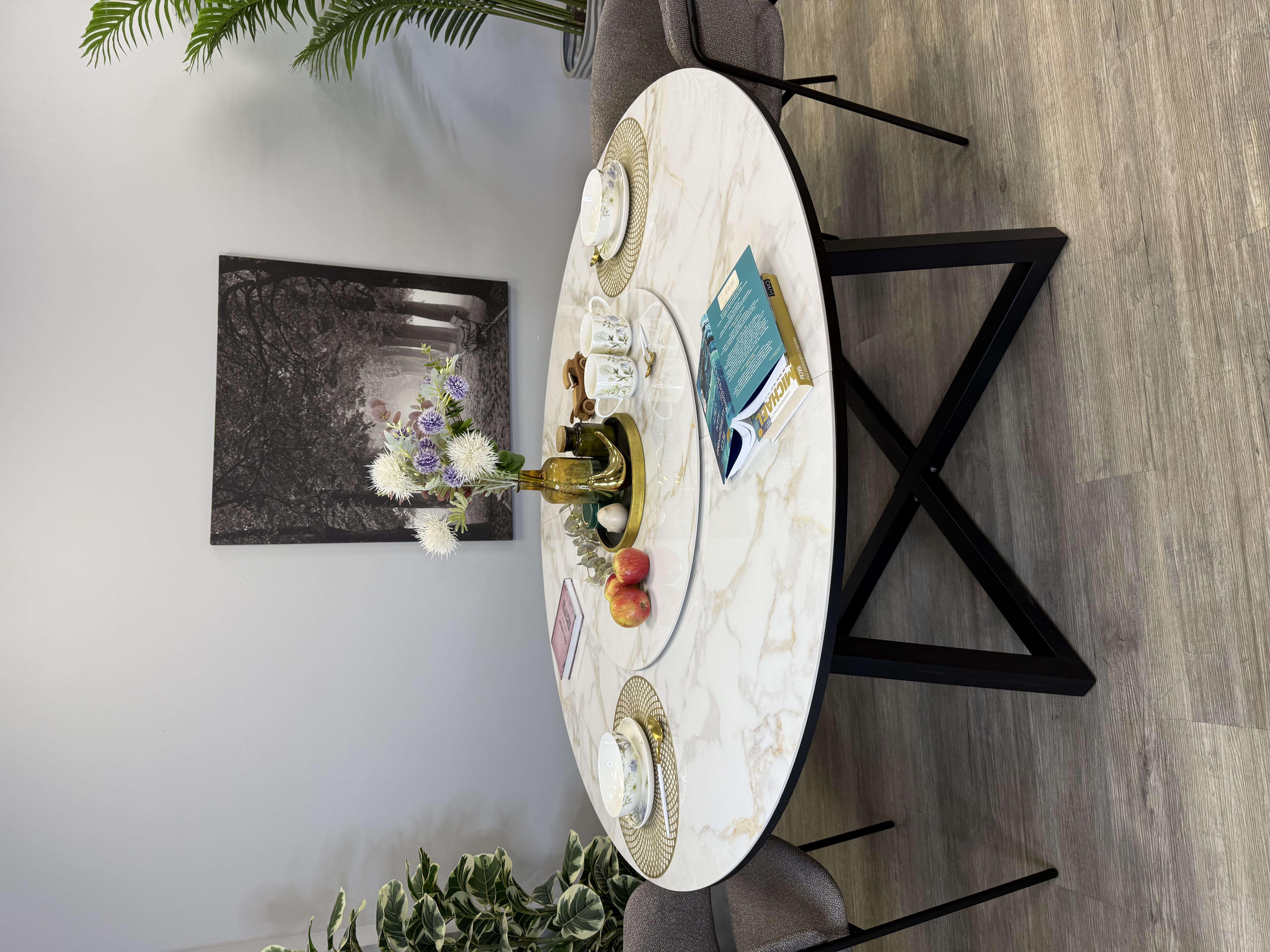 Большая двухсоставная столешница круглой формы, выполненная из высококачественной керамики, обеспечивает повышенную прочность и долговечность. Благодаря устойчивости к механическим повреждениям и термошокам, она идеально подходит для интенсивной эксплуатации.