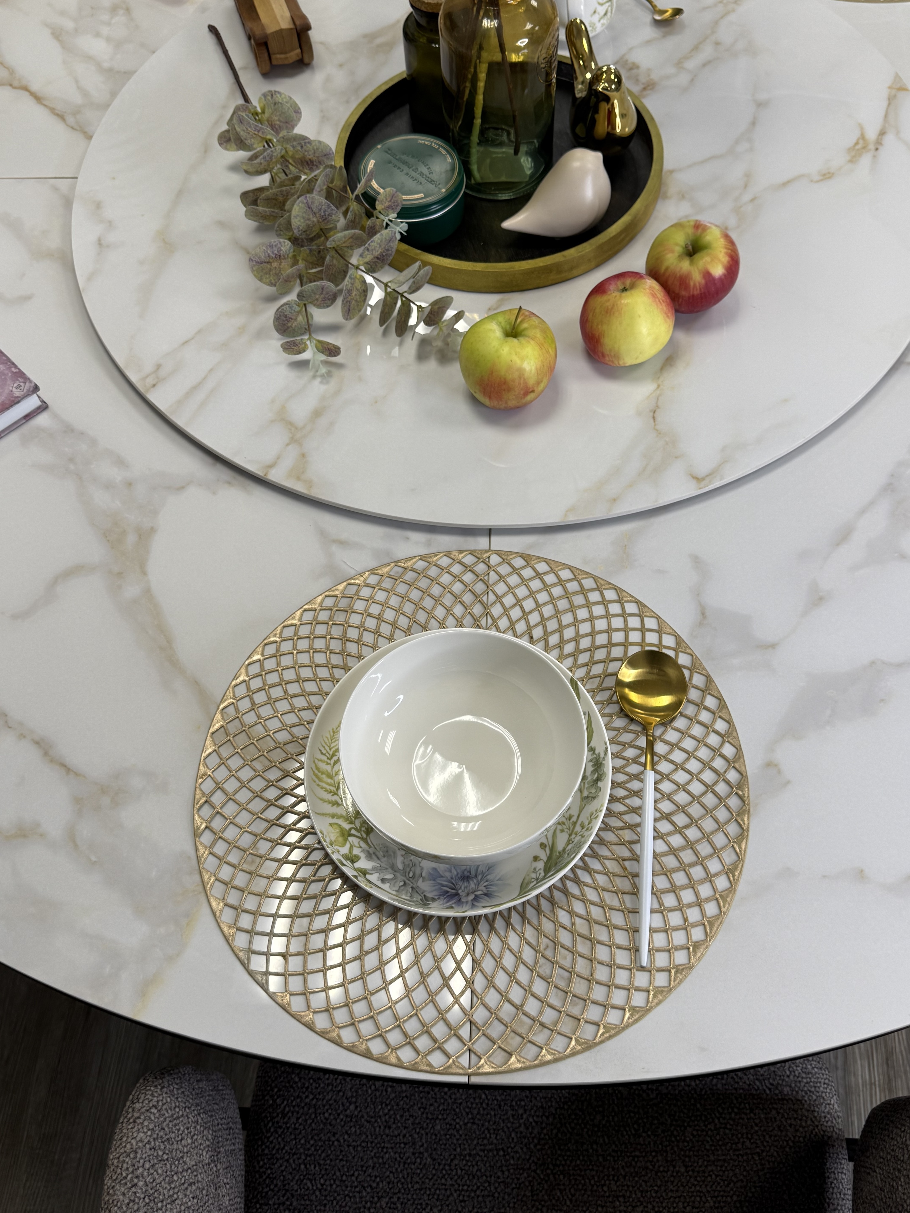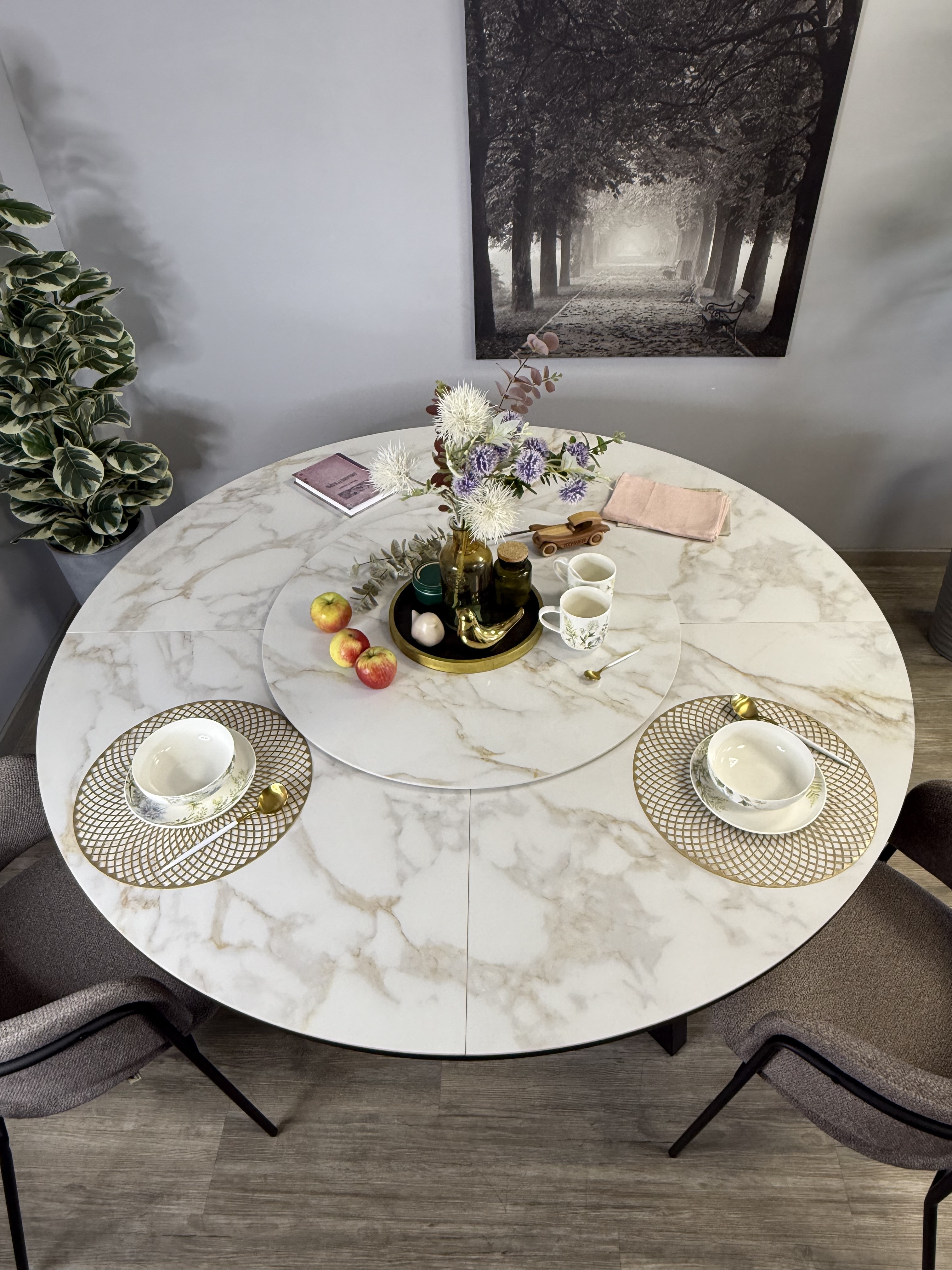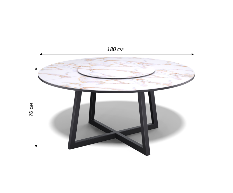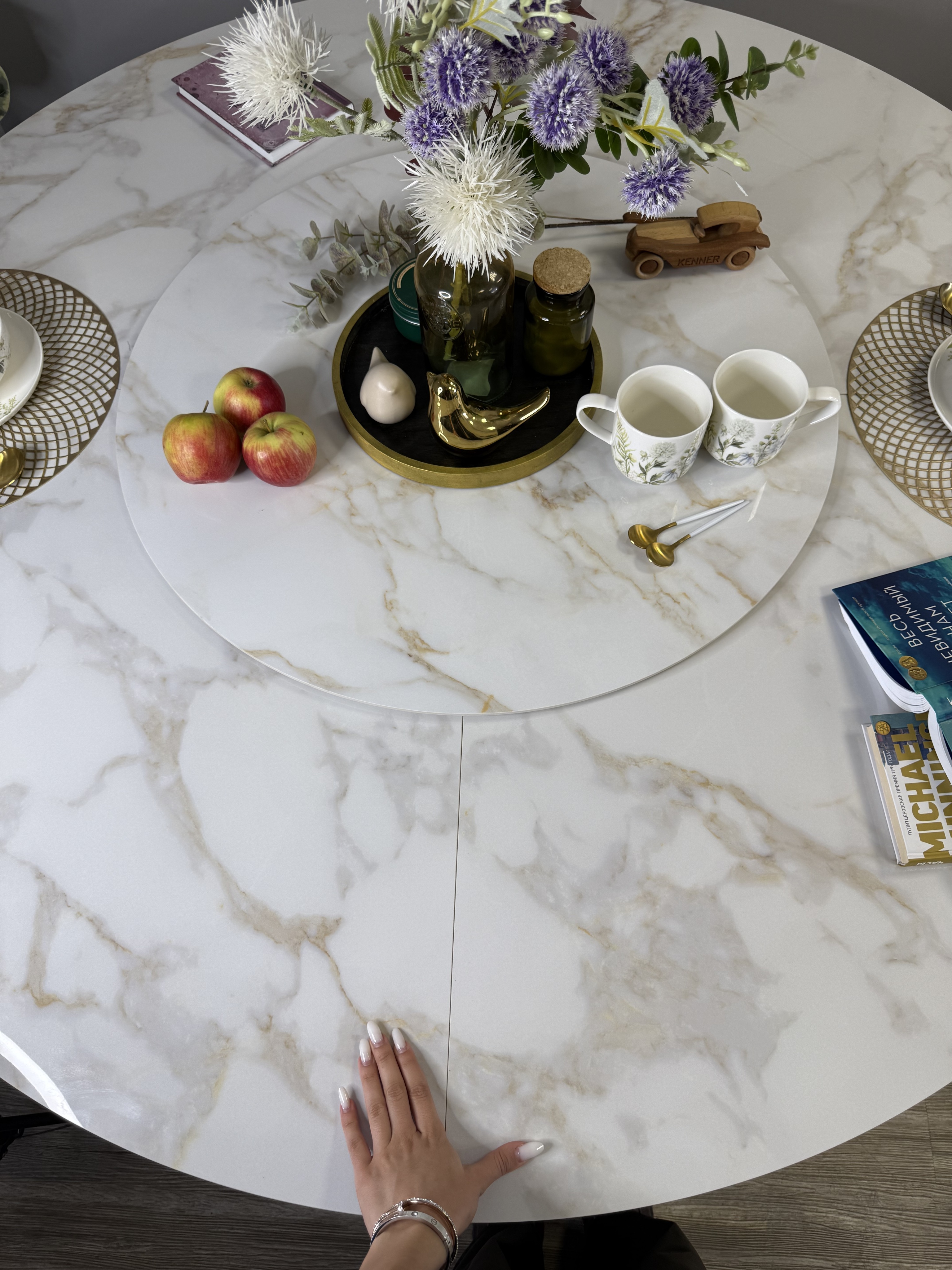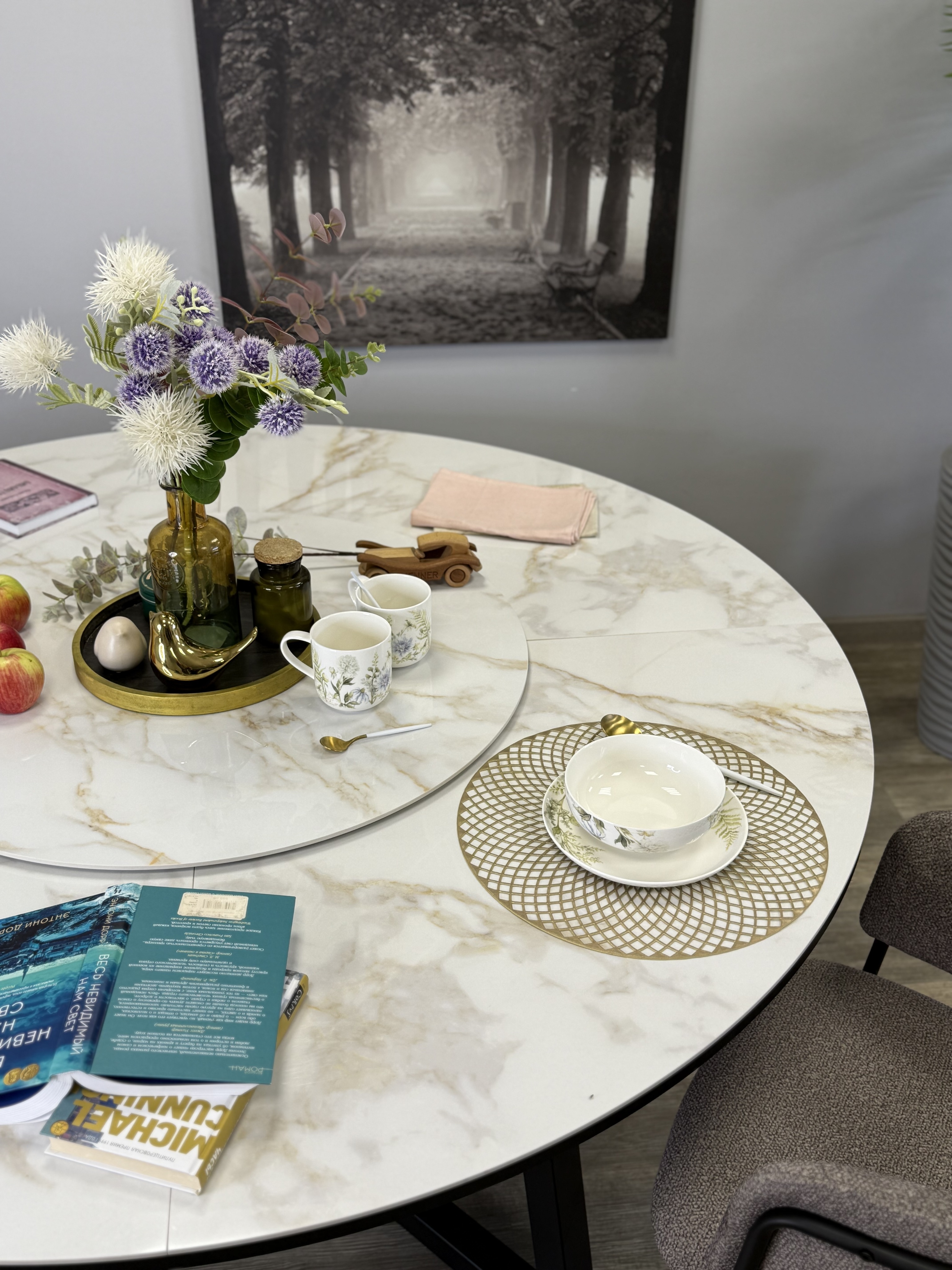 Большая двухсоставная столешница круглой формы, выполненная из высококачественной керамики, обеспечивает повышенную прочность и долговечность. Благодаря устойчивости к механическим повреждениям и термошокам, она идеально подходит для интенсивной эксплуатации.