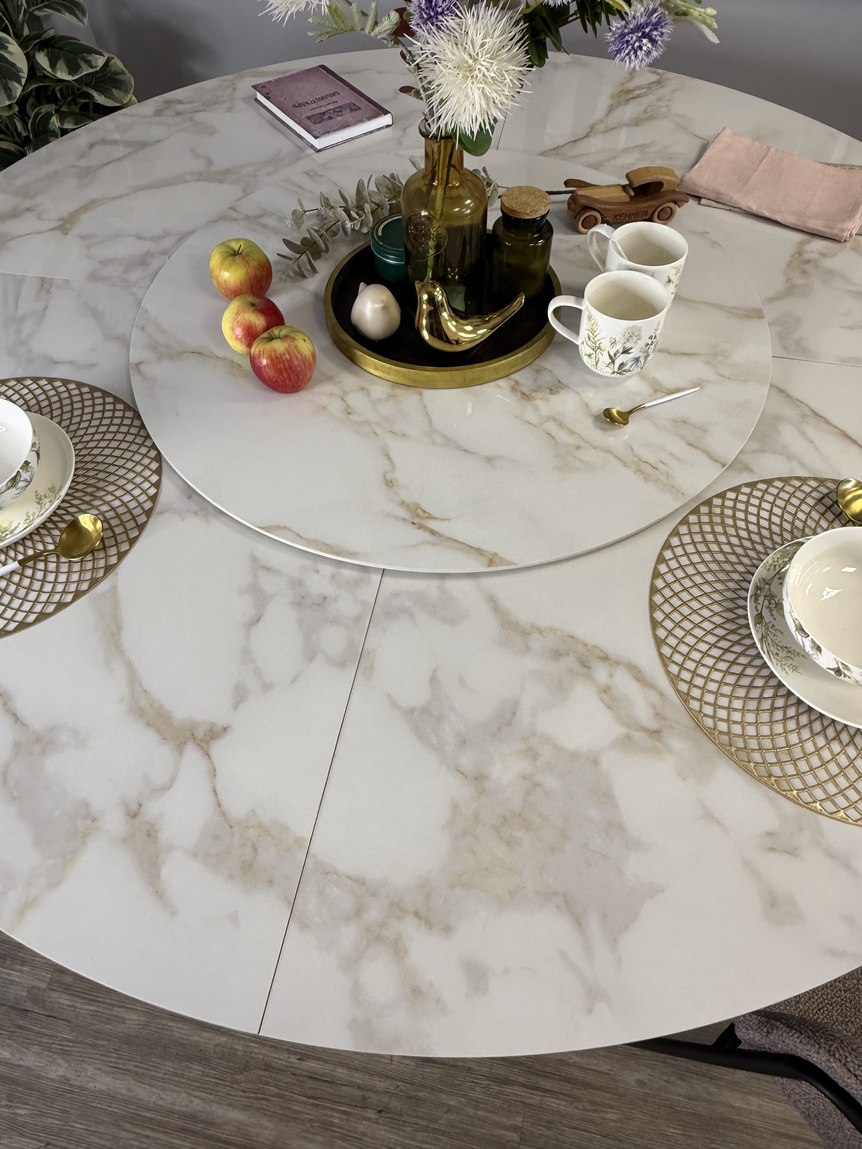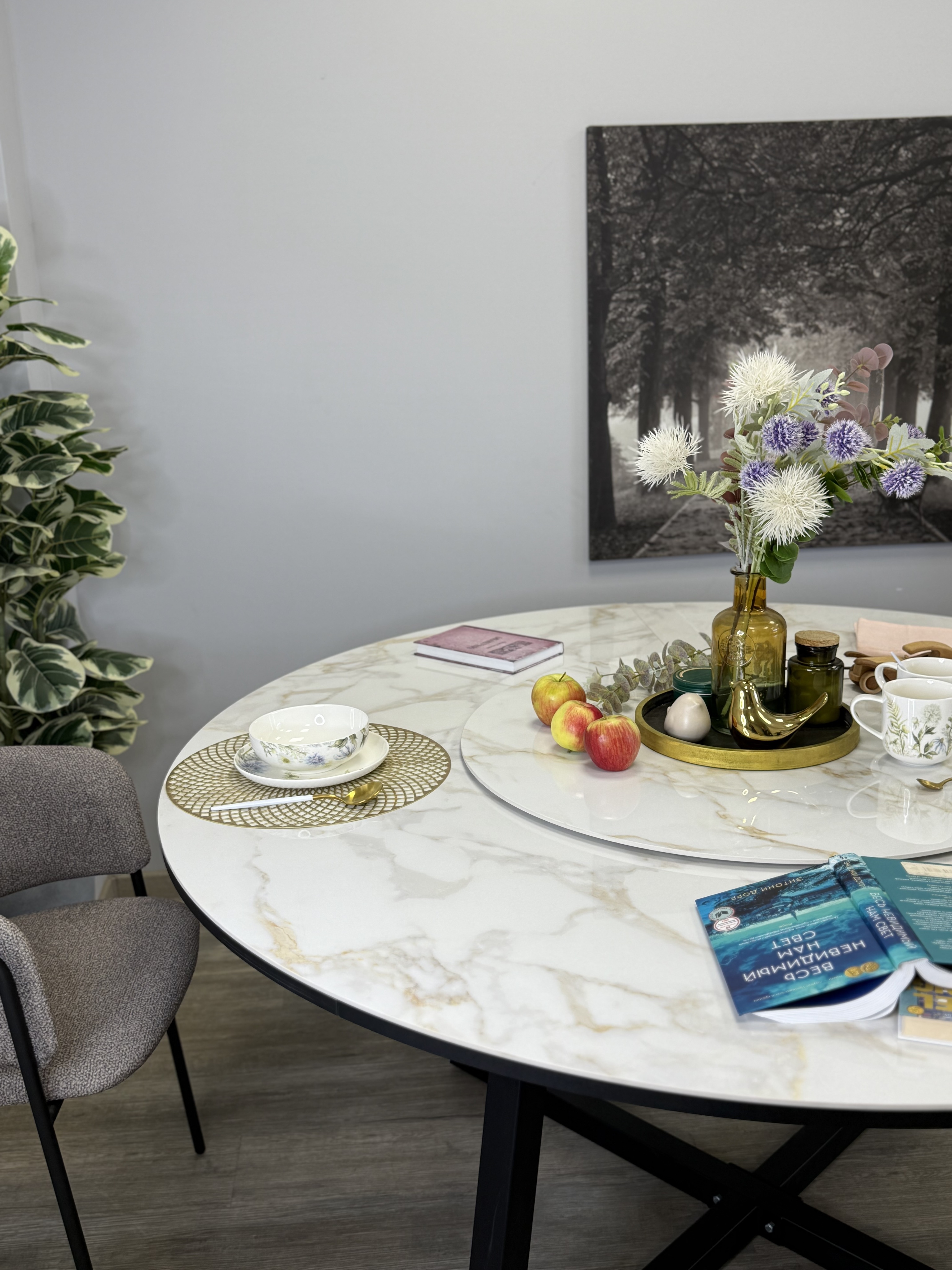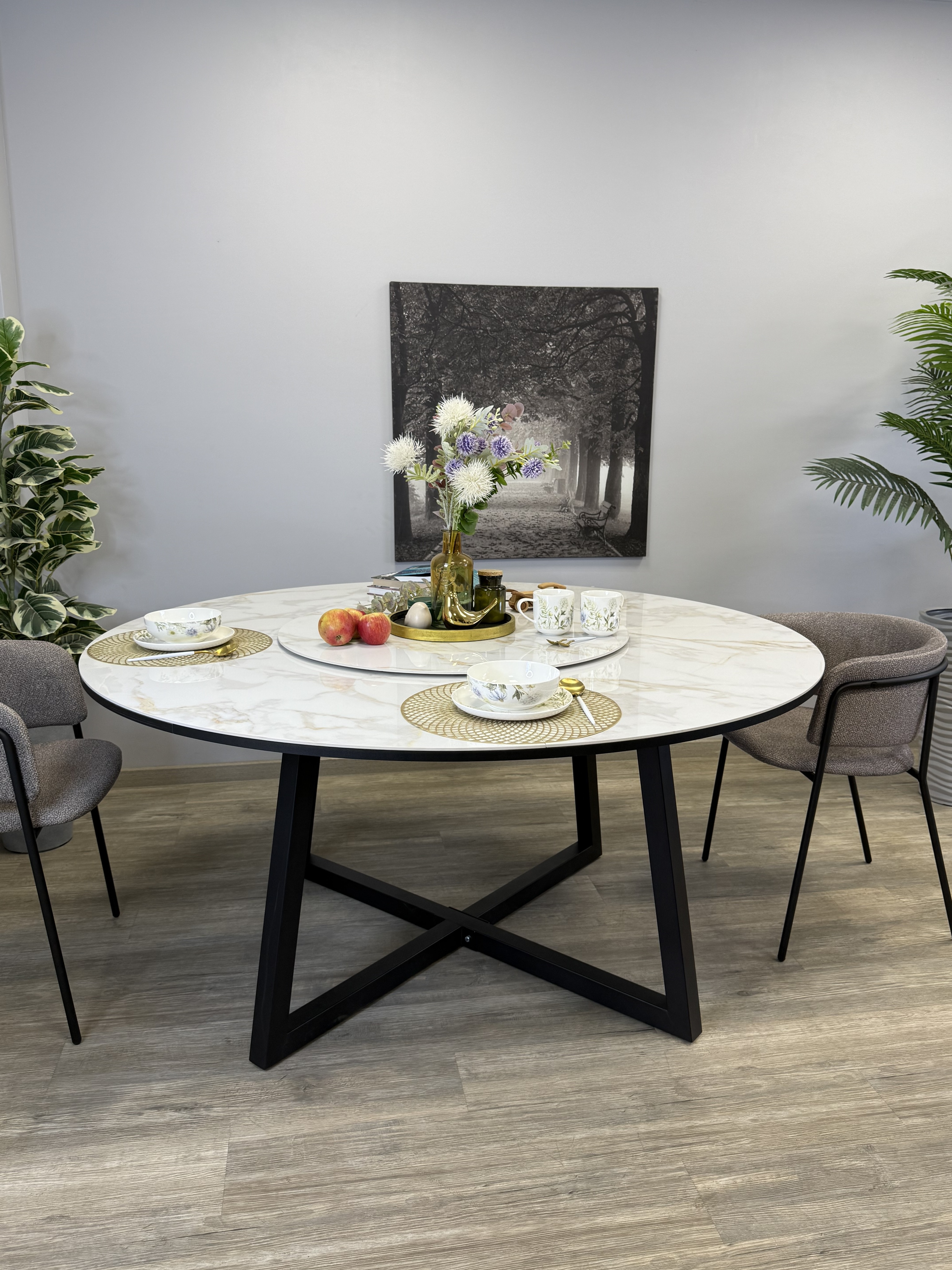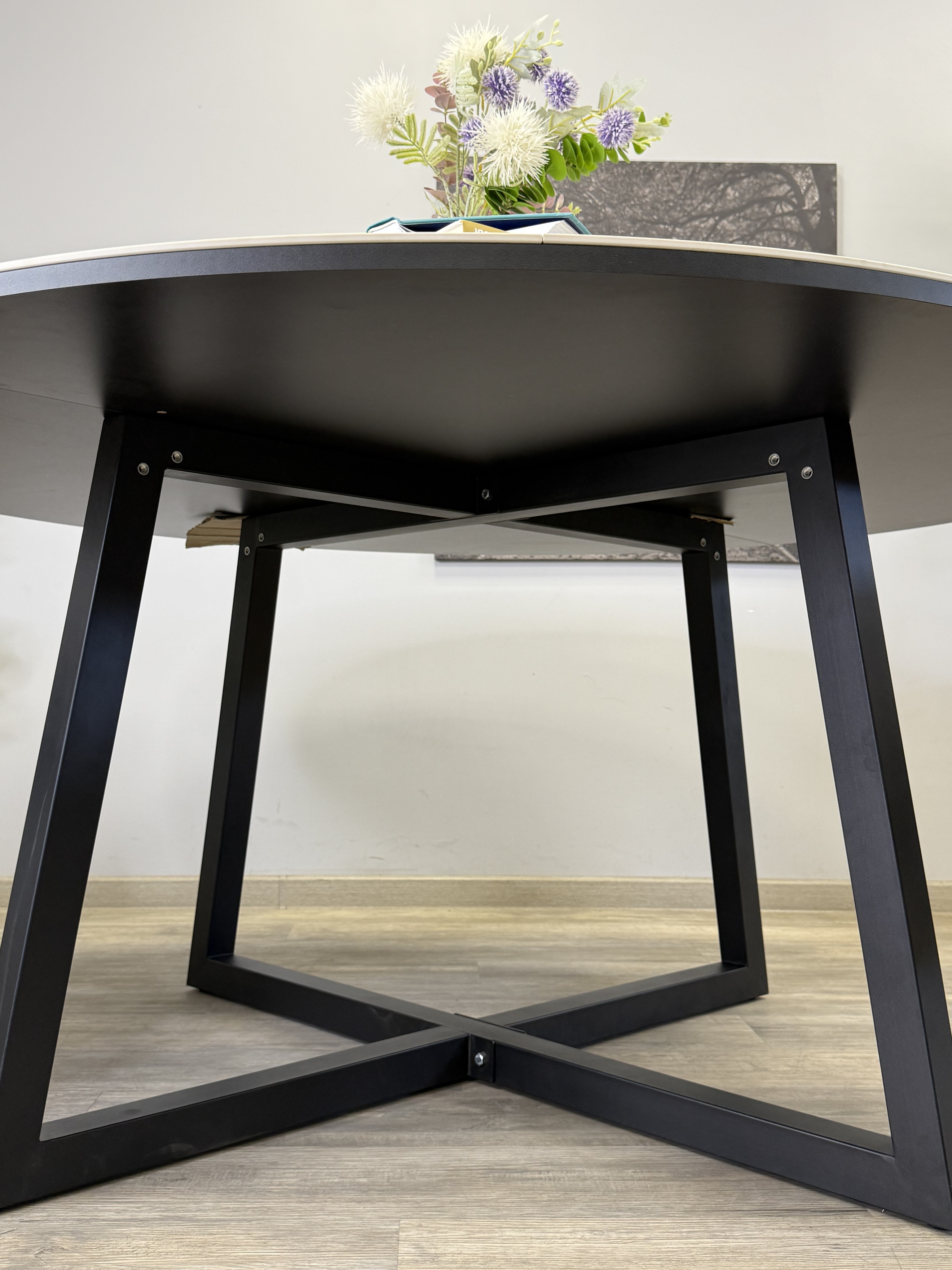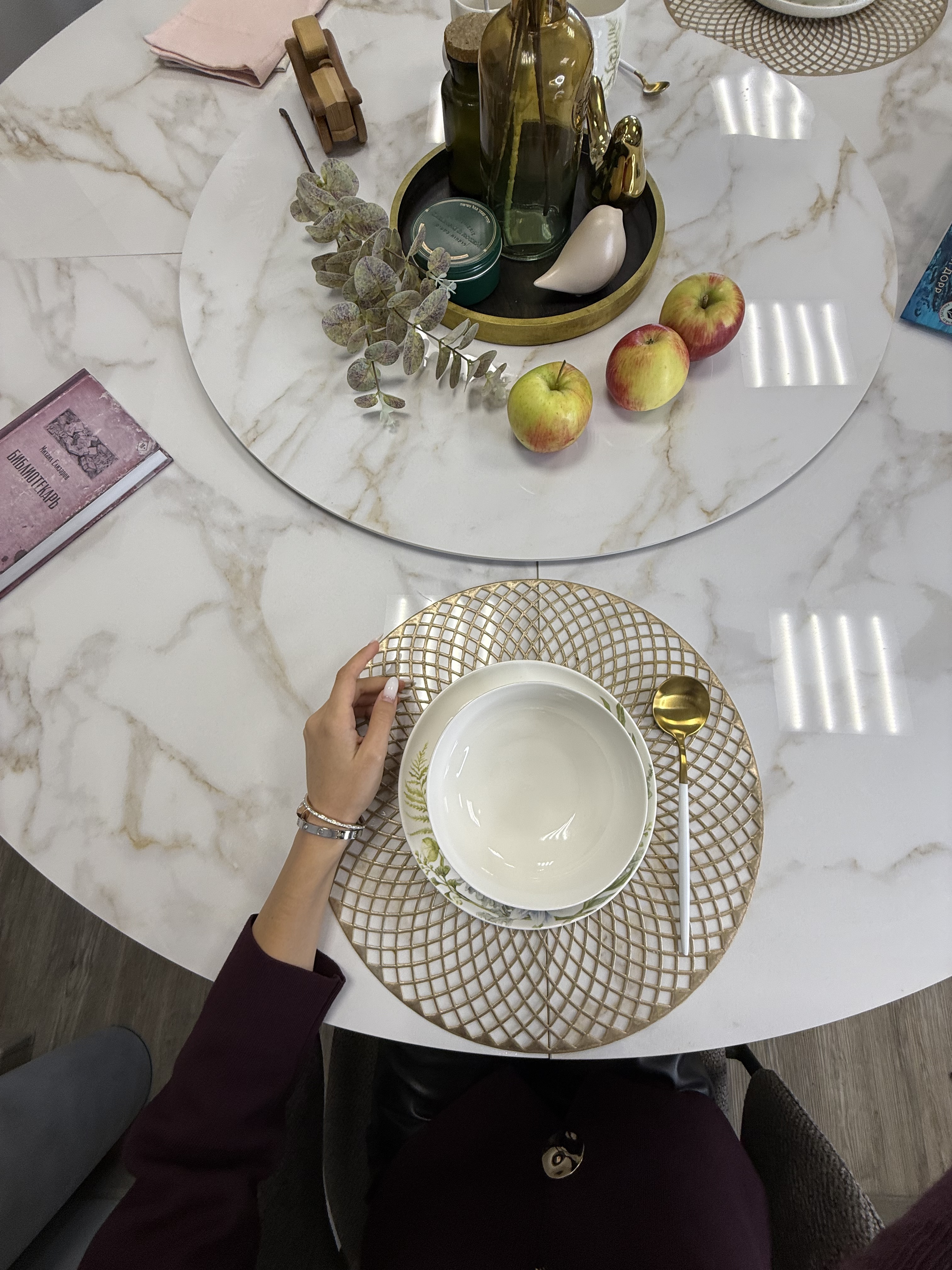 Большая двухсоставная столешница круглой формы, выполненная из высококачественной керамики, обеспечивает повышенную прочность и долговечность. Благодаря устойчивости к механическим повреждениям и термошокам, она идеально подходит для интенсивной эксплуатации.